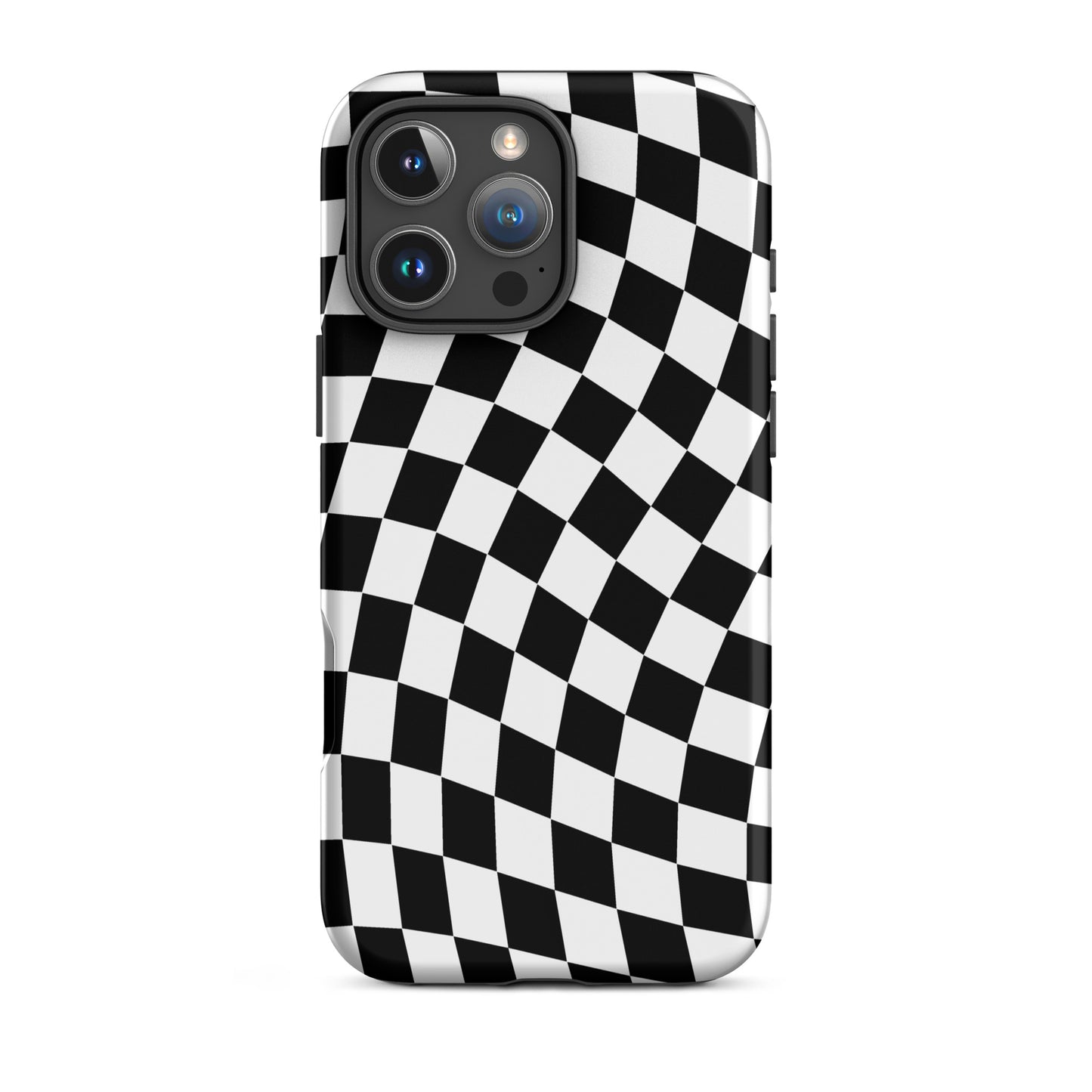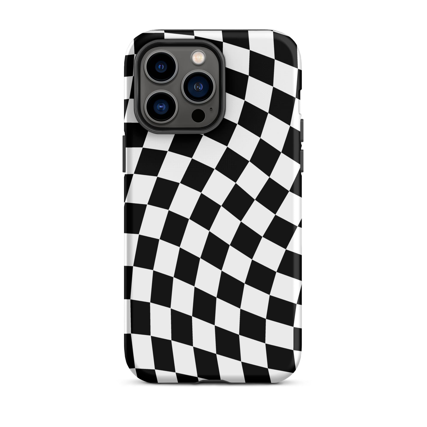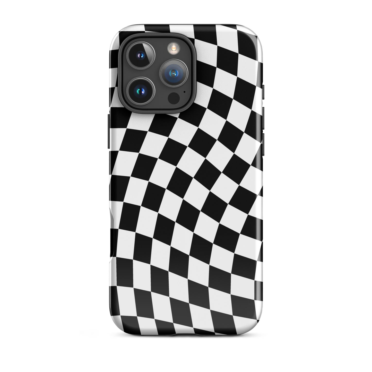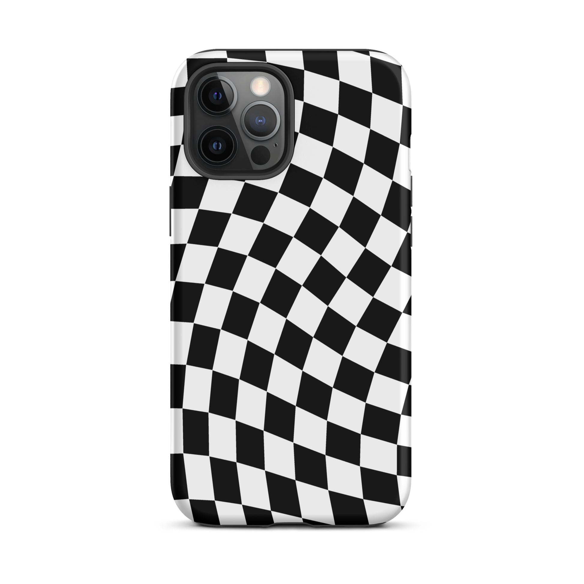 Be hip and protect your phone with this cool black checkered iPhone case! This case features a wavy black and white checkeredĀ pattern.