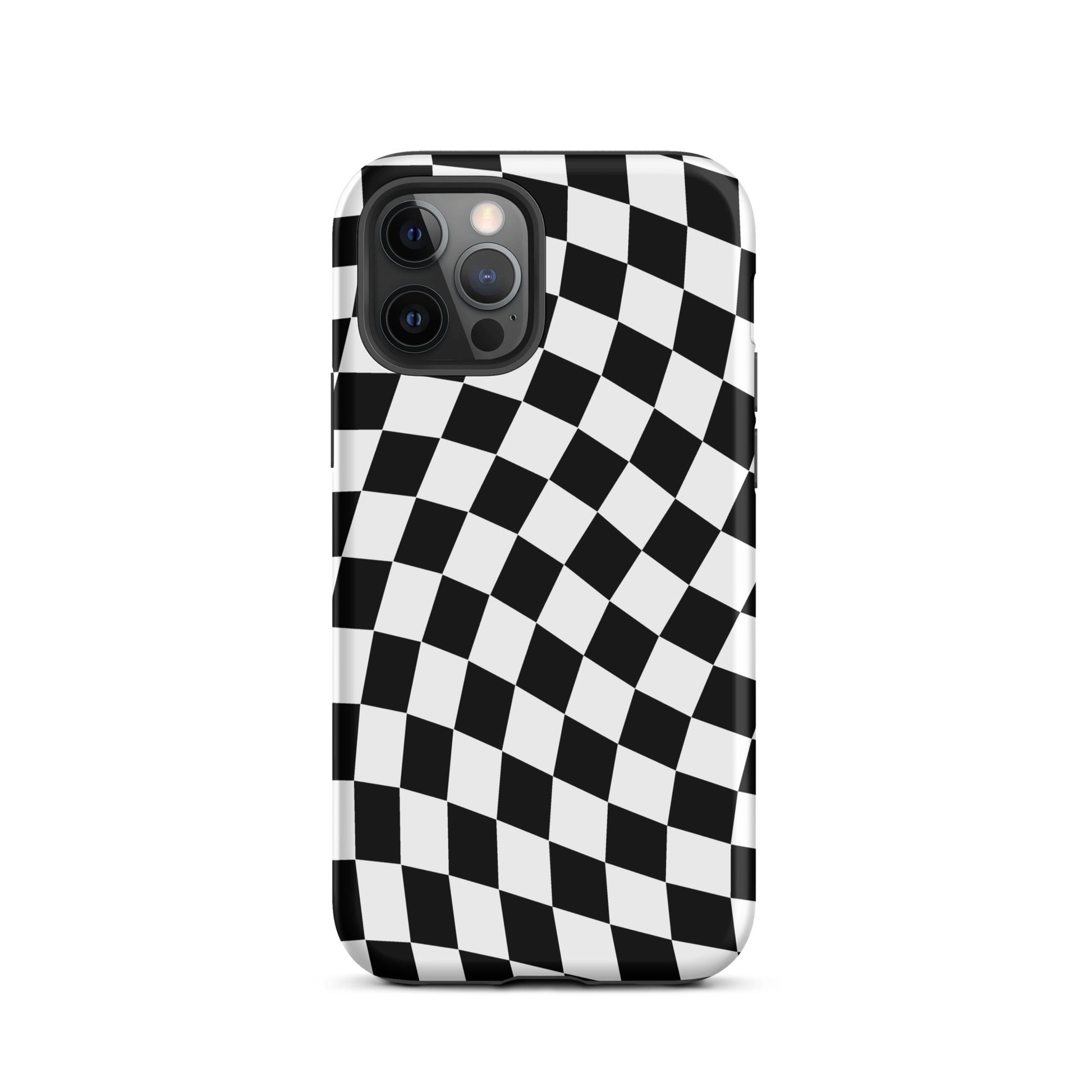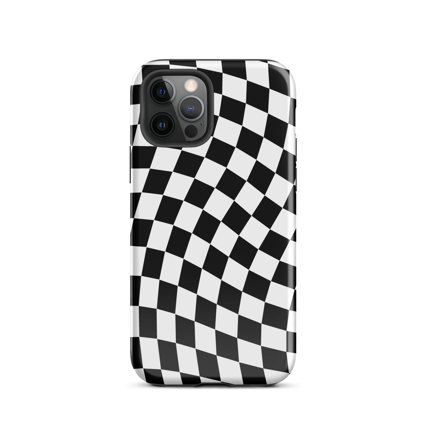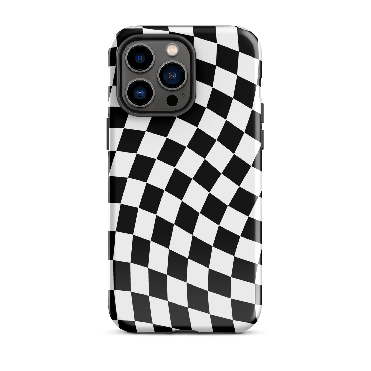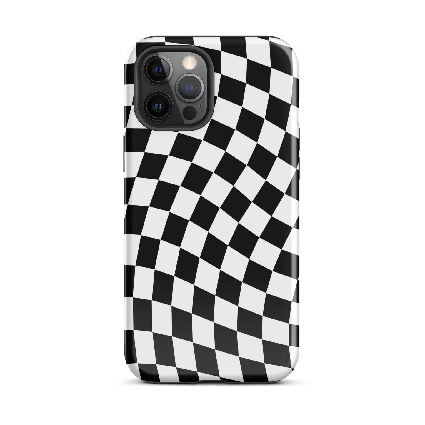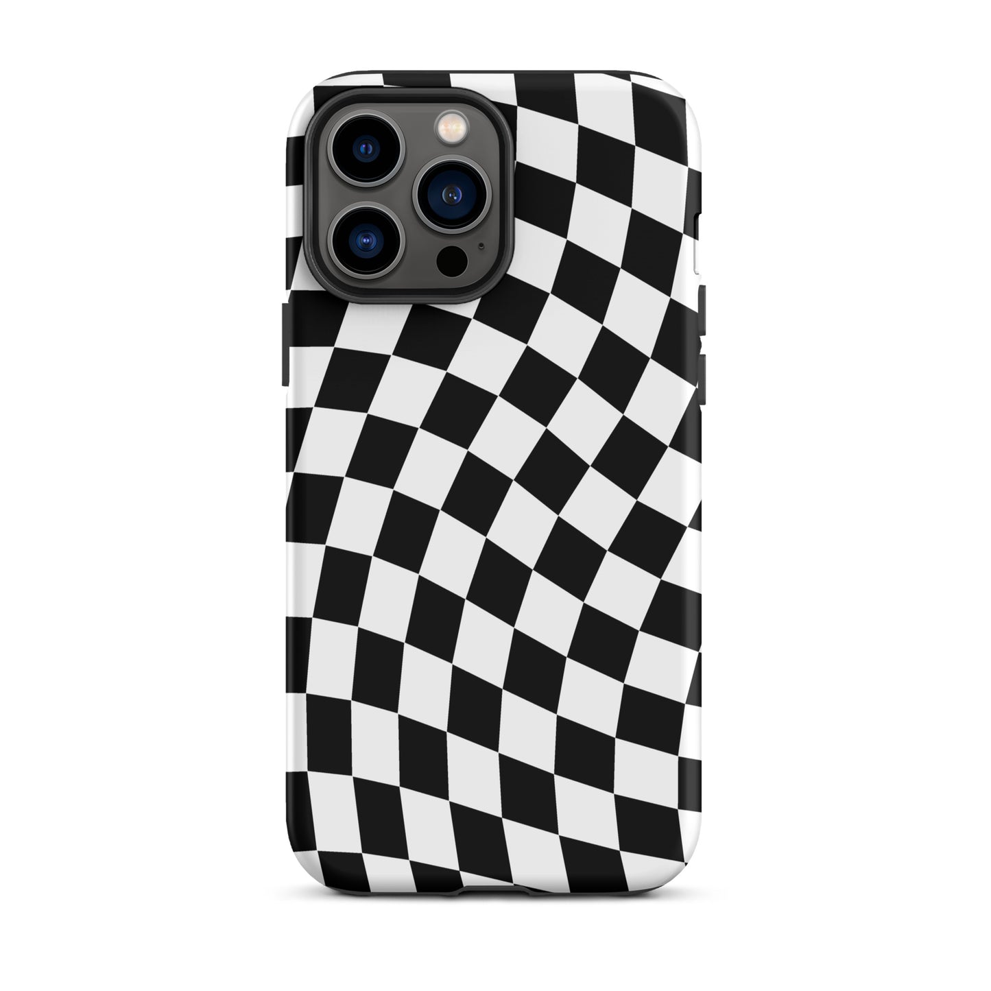 Be hip and protect your phone with this cool black checkered iPhone case! This case features a wavy black and white checkeredĀ pattern.