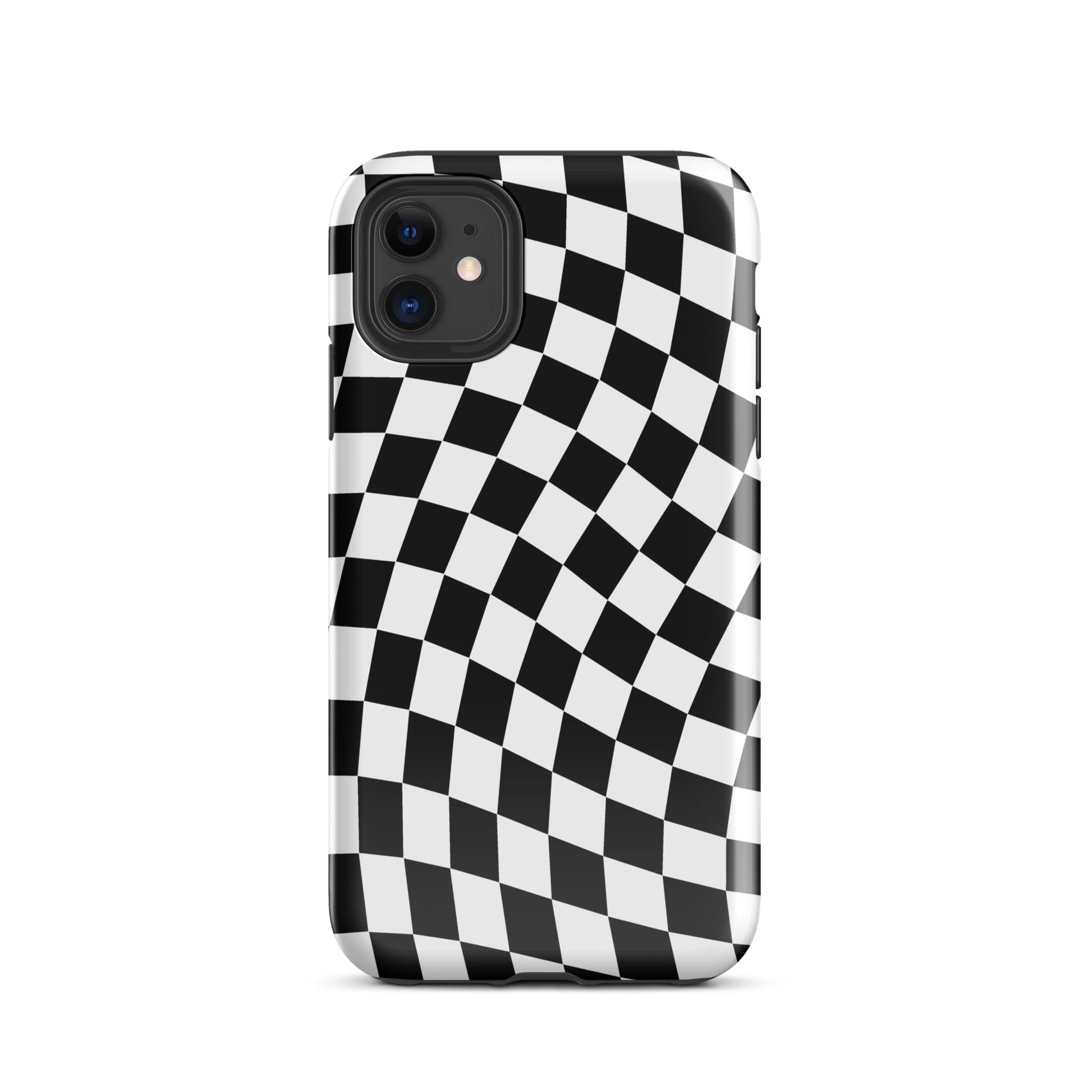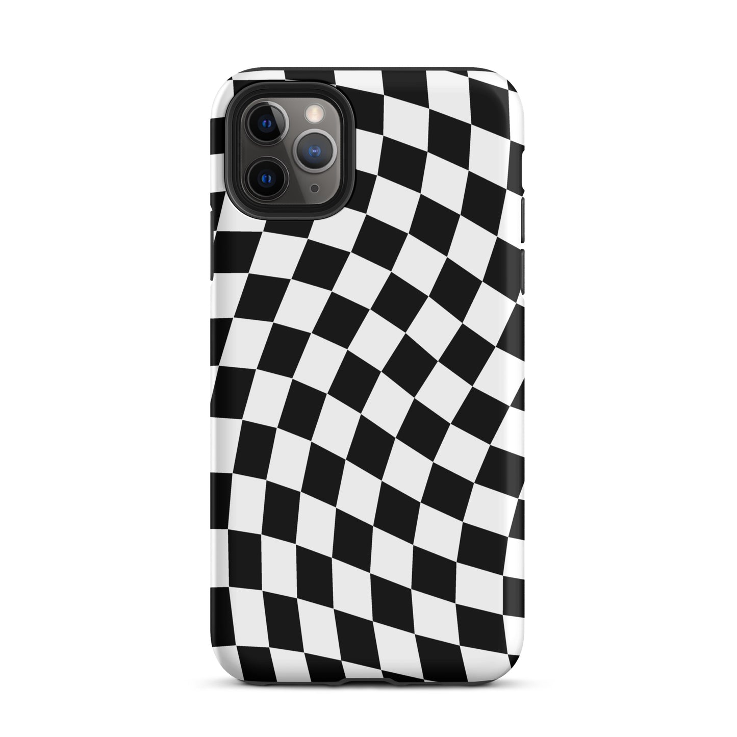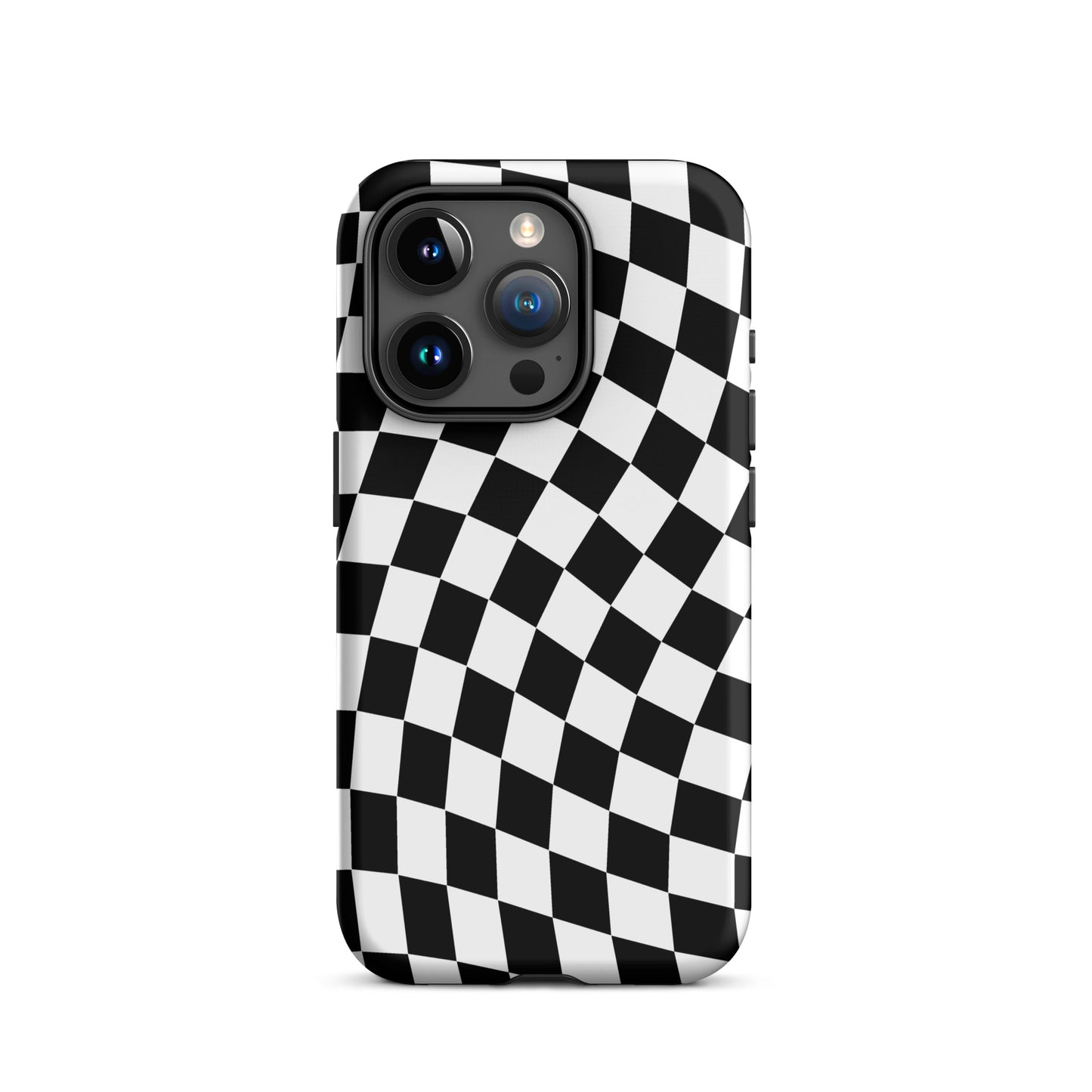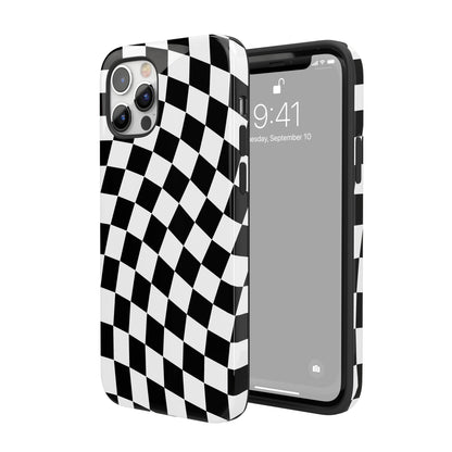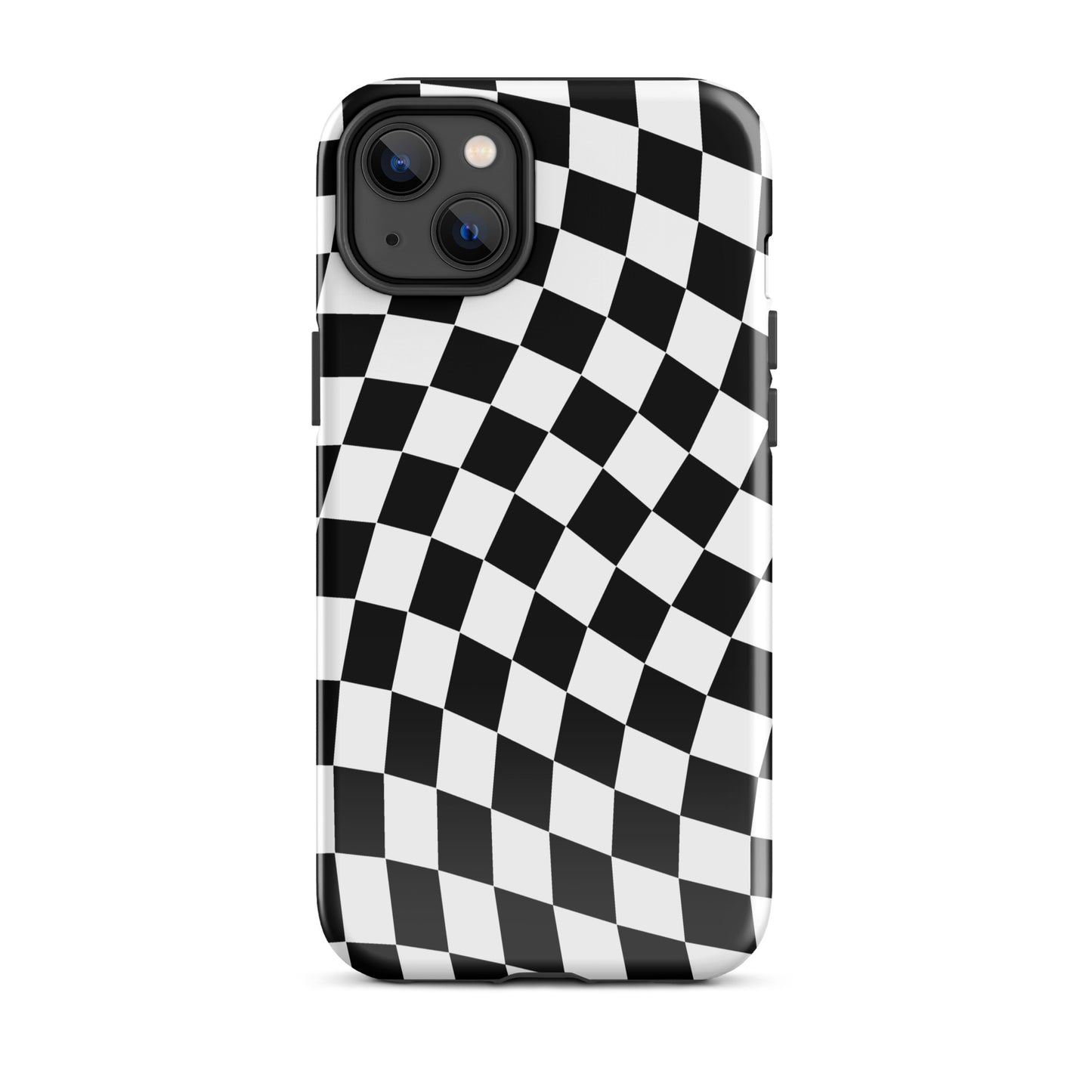 Be hip and protect your phone with this cool black checkered iPhone case! This case features a wavy black and white checkeredĀ pattern.