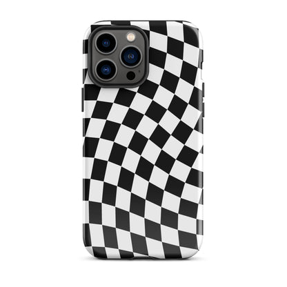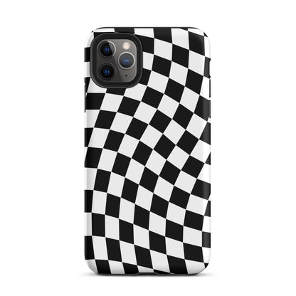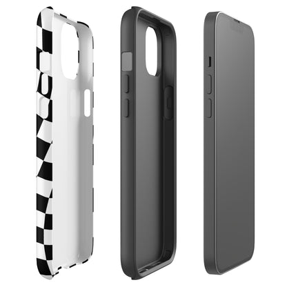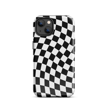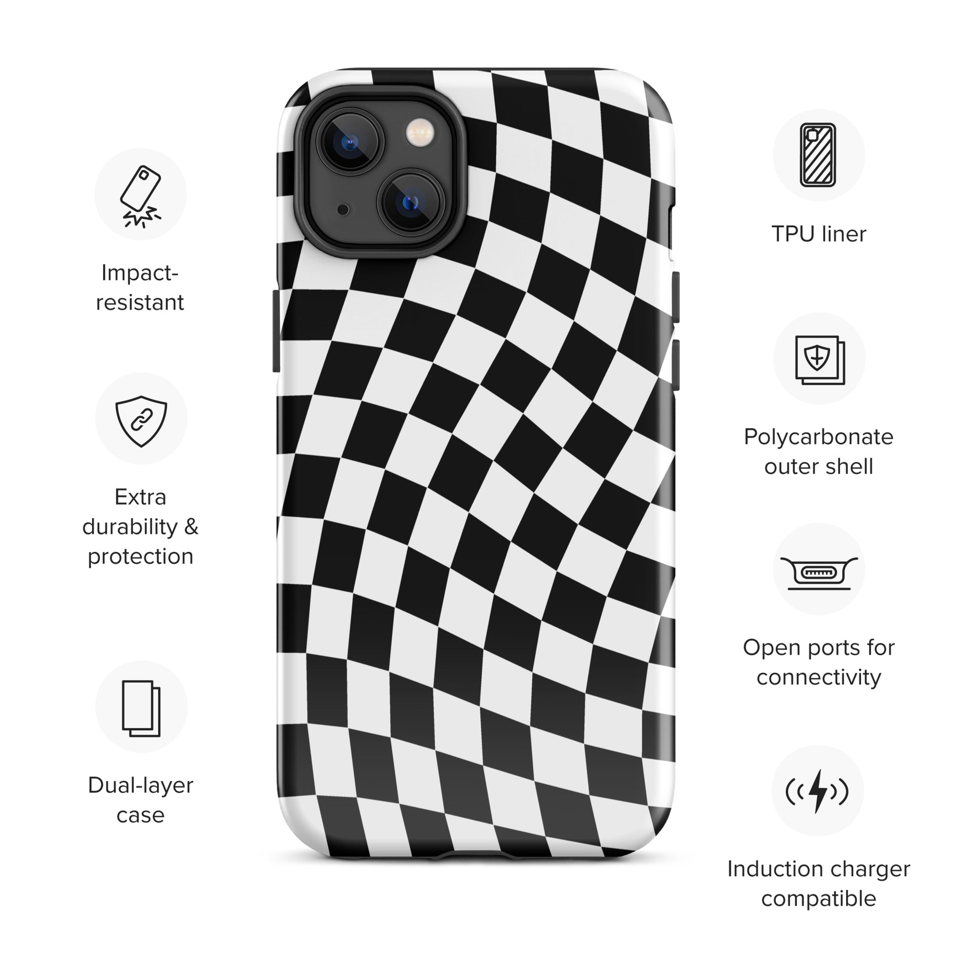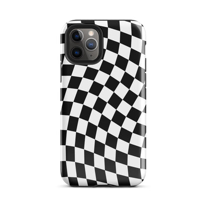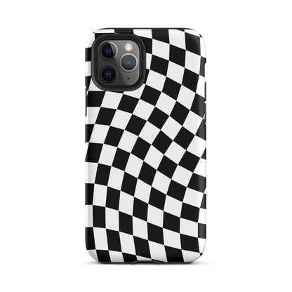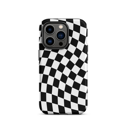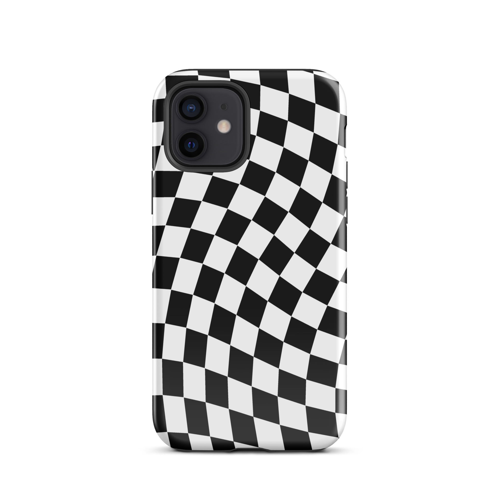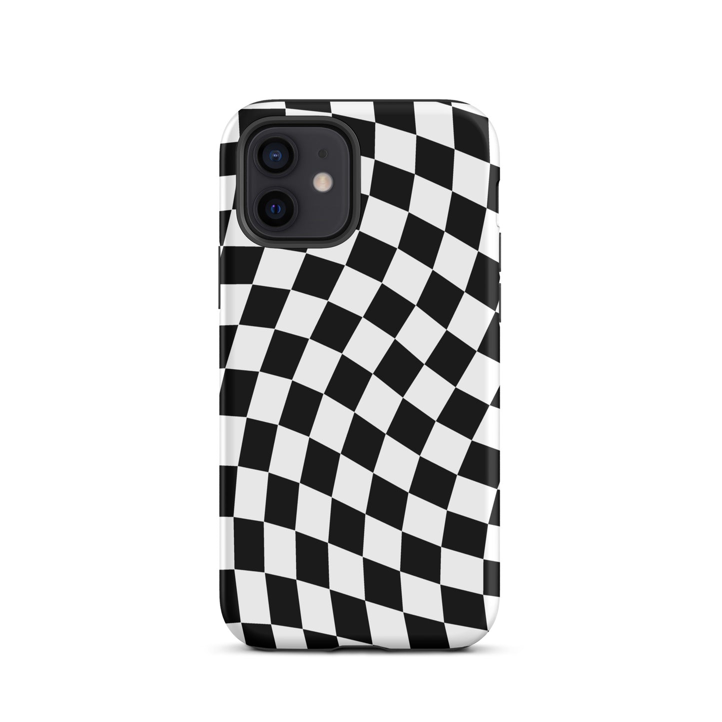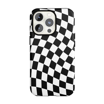 Be hip and protect your phone with this cool black checkered iPhone case! This case features a wavy black and white checkeredĀ pattern.