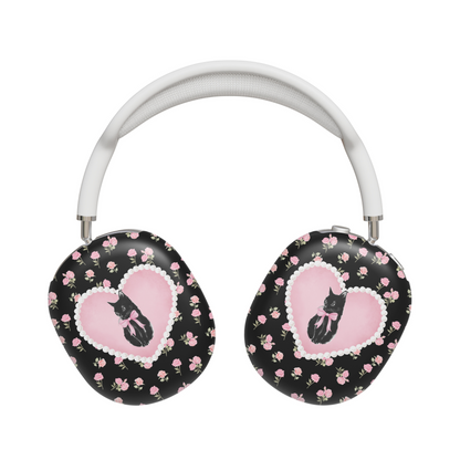 Protect your AirPods with our Black Féline Roses AirPods Max Case! This cute AirPods Max case features a black cat with a pink bow, a pink heart with a pearl outline, and pink vintage roses on a black background.
