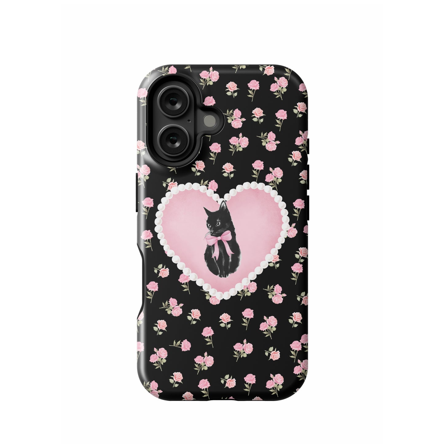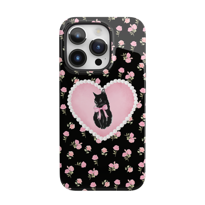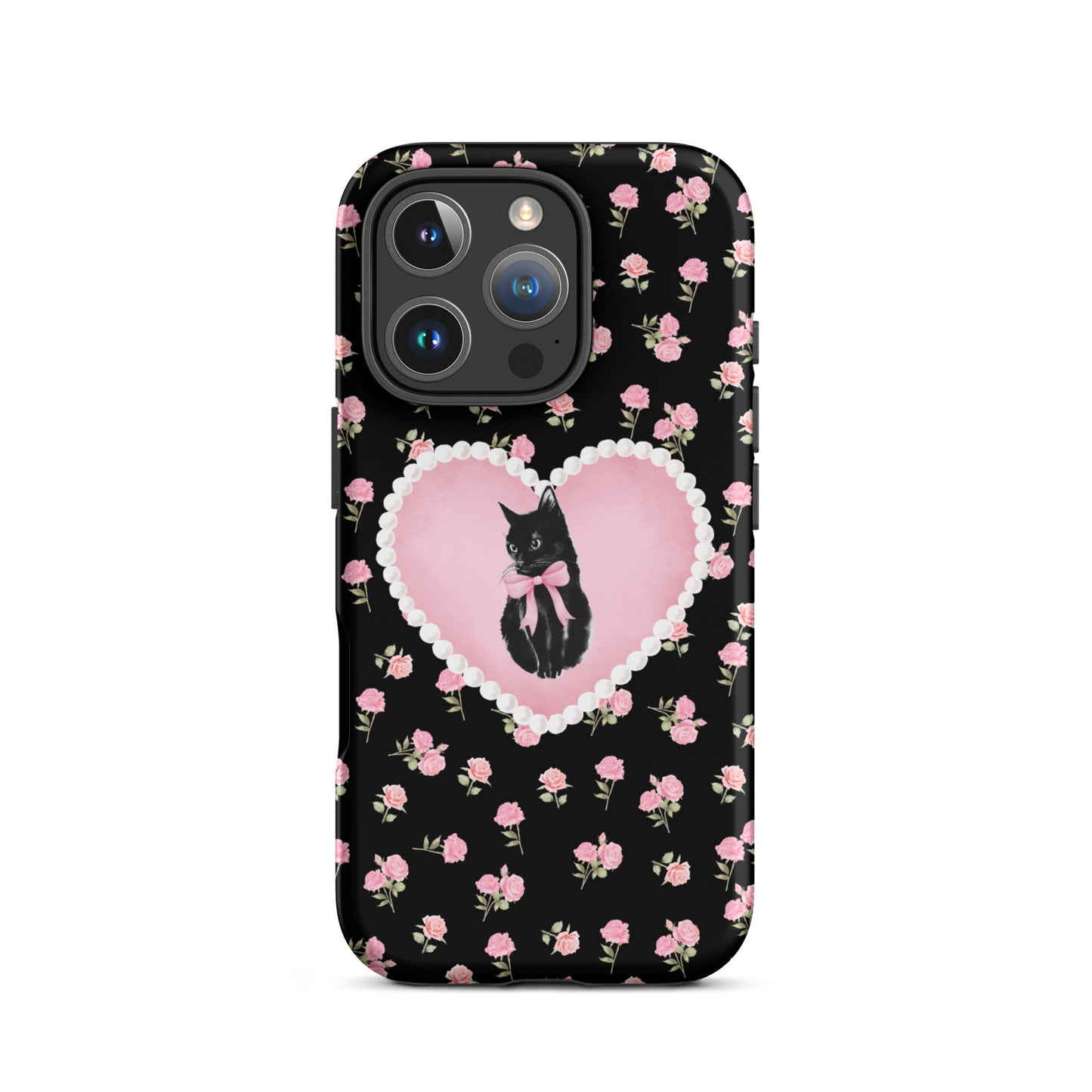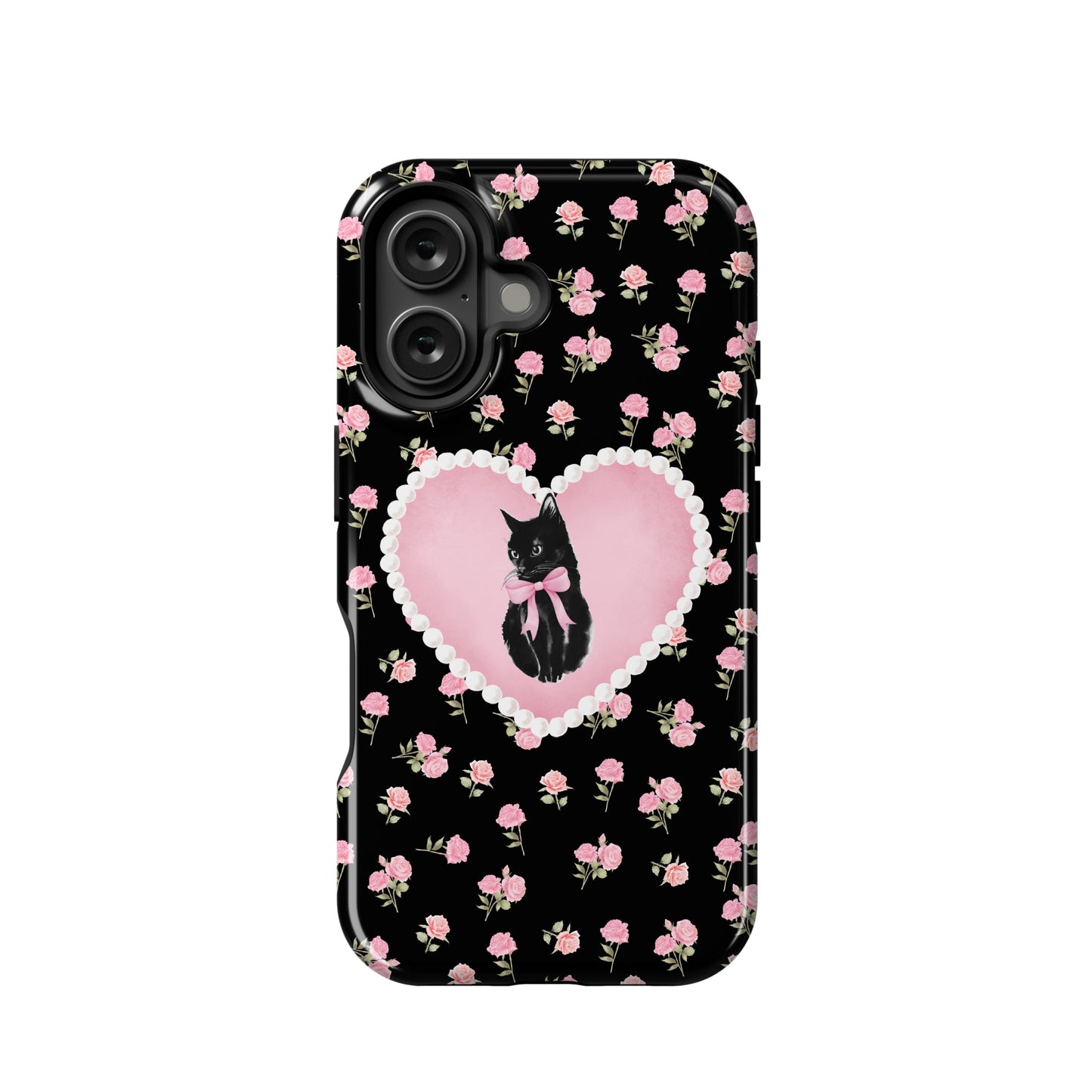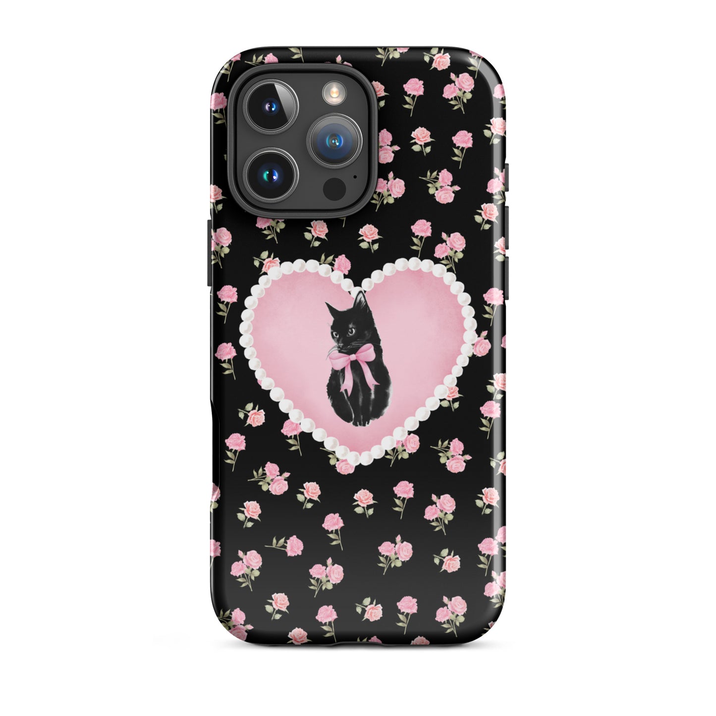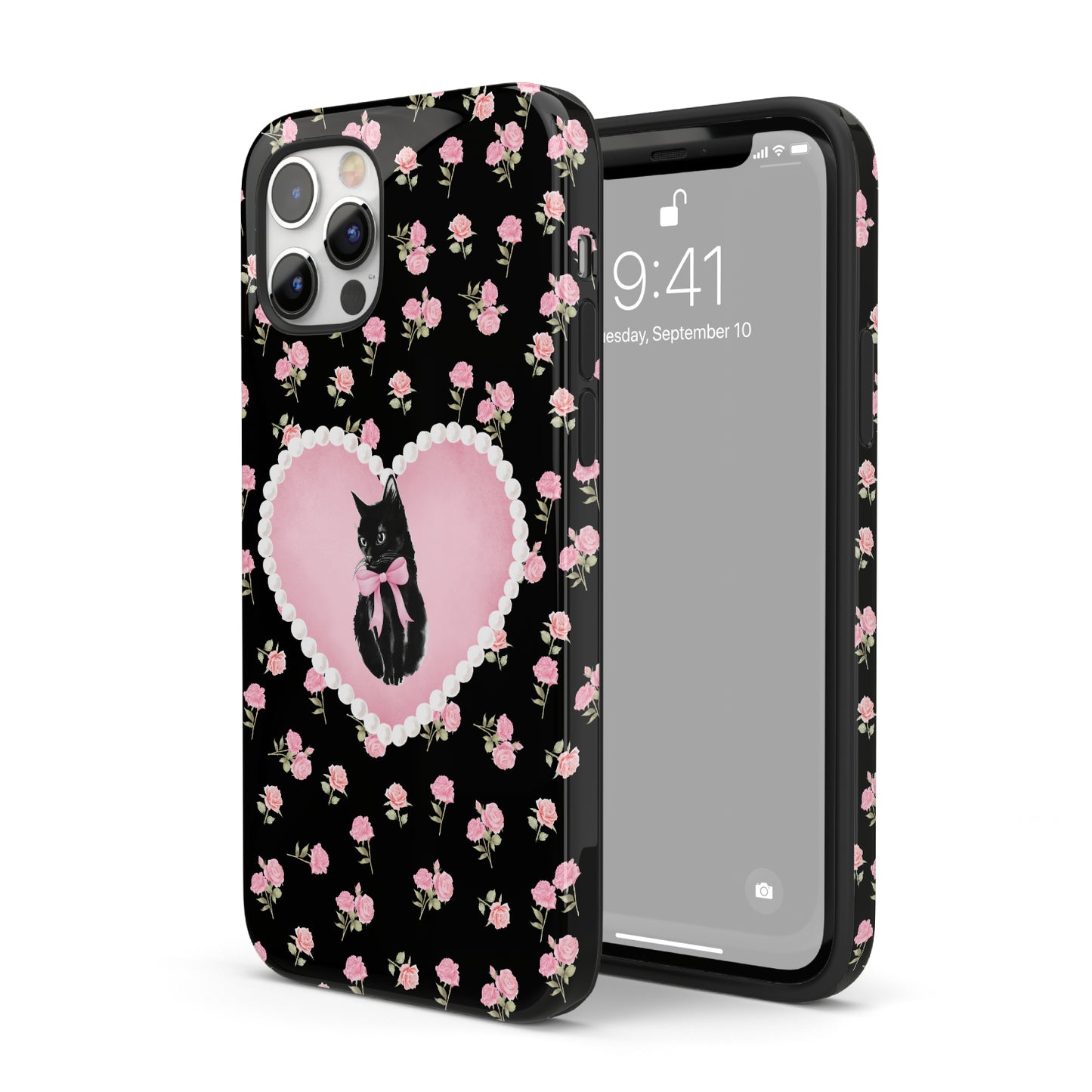 For the black and pink lovers, the Black Féline Roses iPhone Case is your perfect match! Featuring an adorable black cat with a pink bow, a pink heart outlined in pearls, and vintage pink roses on a chic black background, this case adds a sweet yet dark touch to your phone.