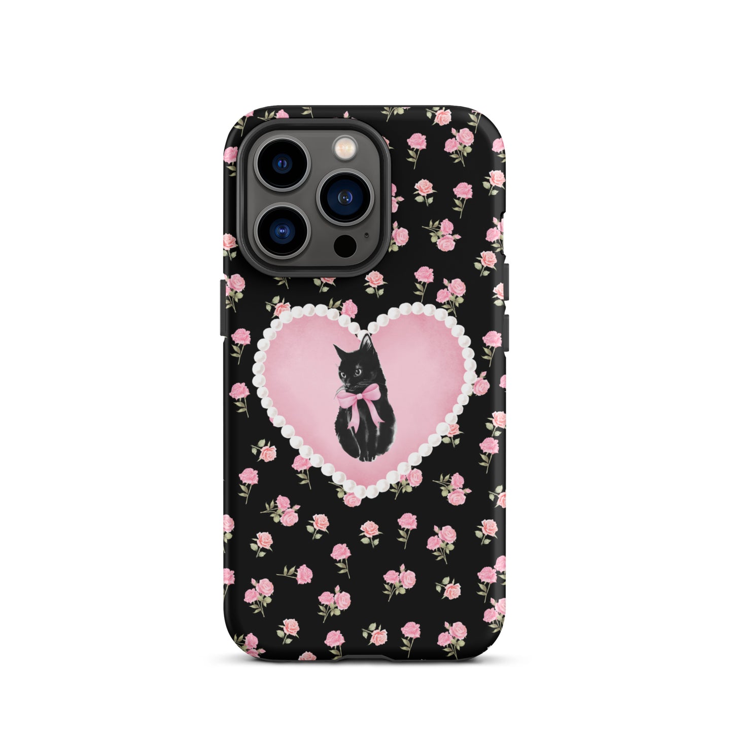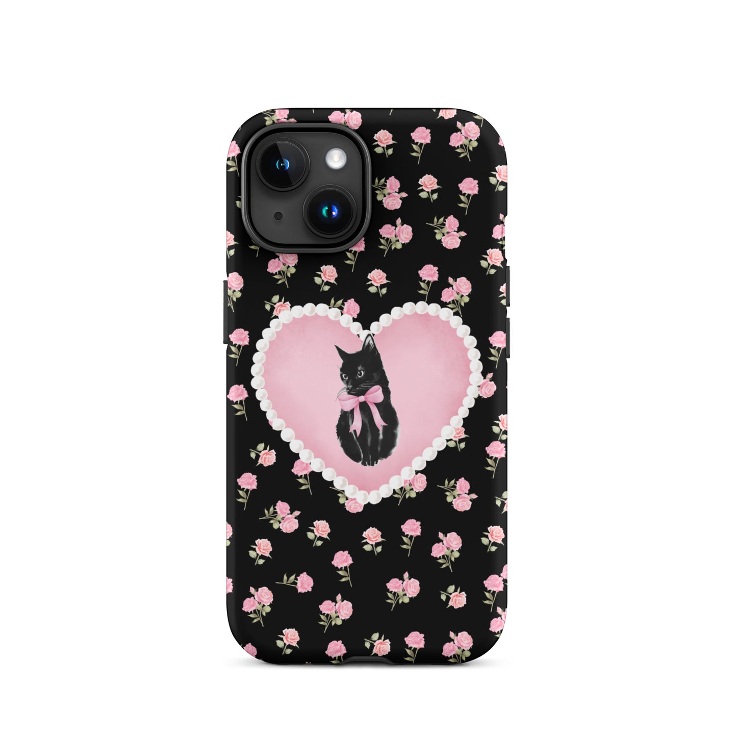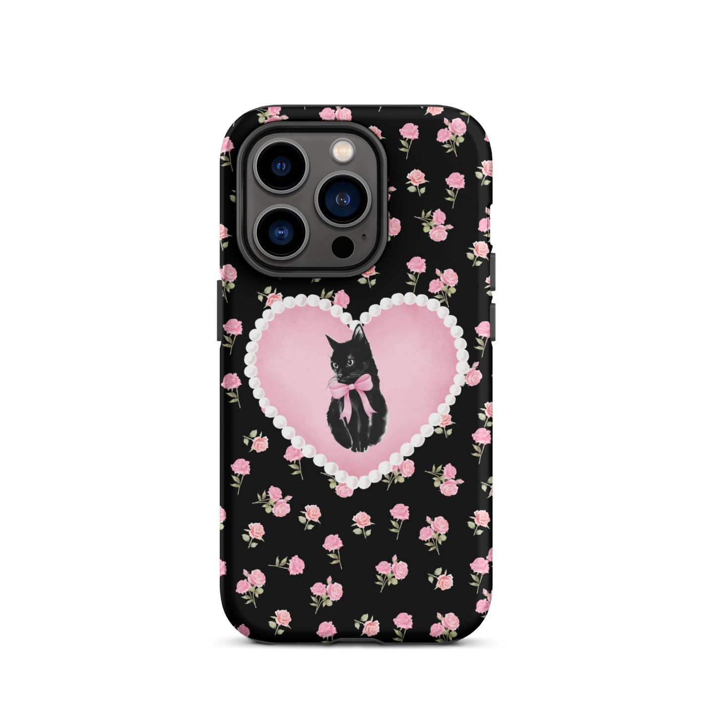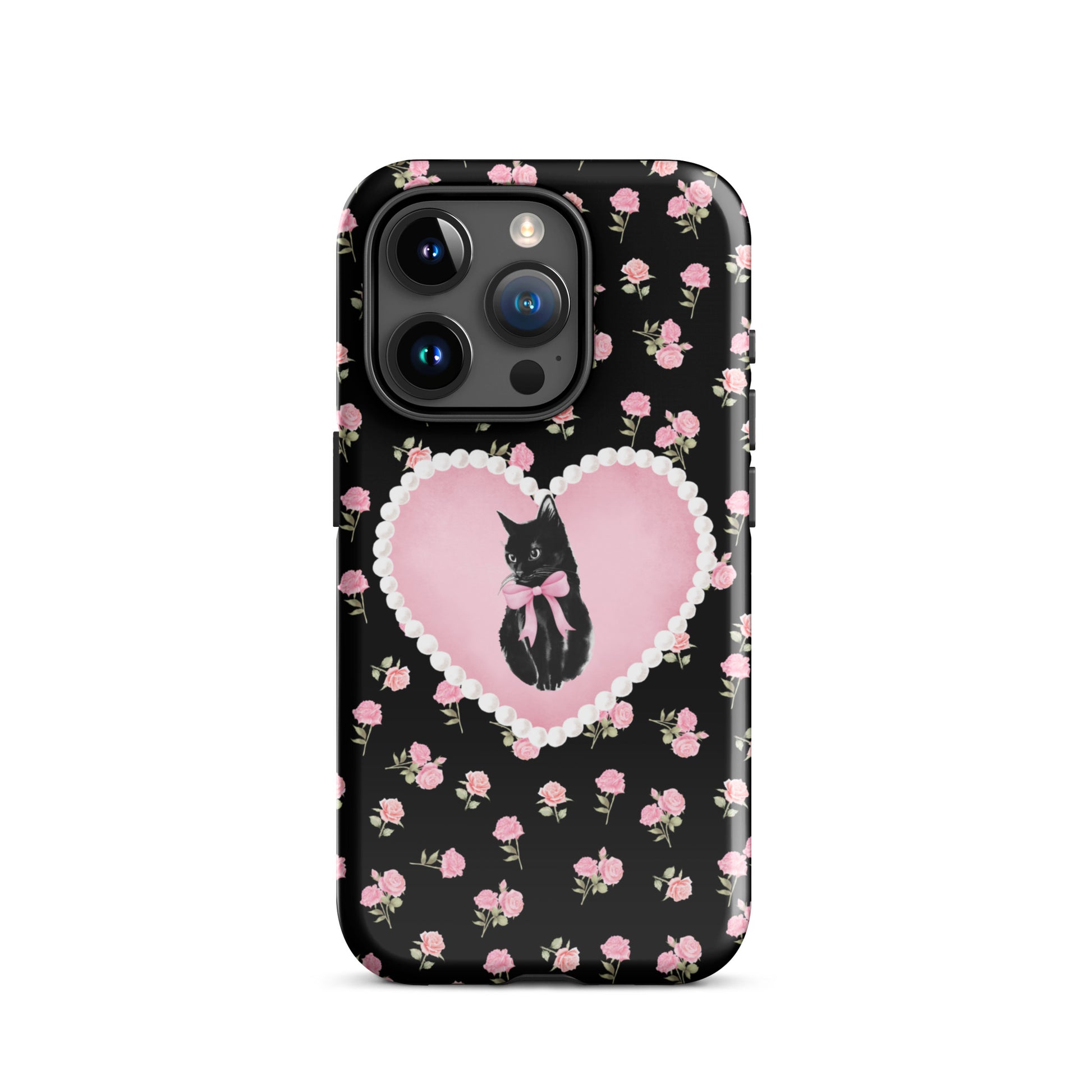 For the black and pink lovers, the Black Féline Roses iPhone Case is your perfect match! Featuring an adorable black cat with a pink bow, a pink heart outlined in pearls, and vintage pink roses on a chic black background, this case adds a sweet yet dark touch to your phone.
