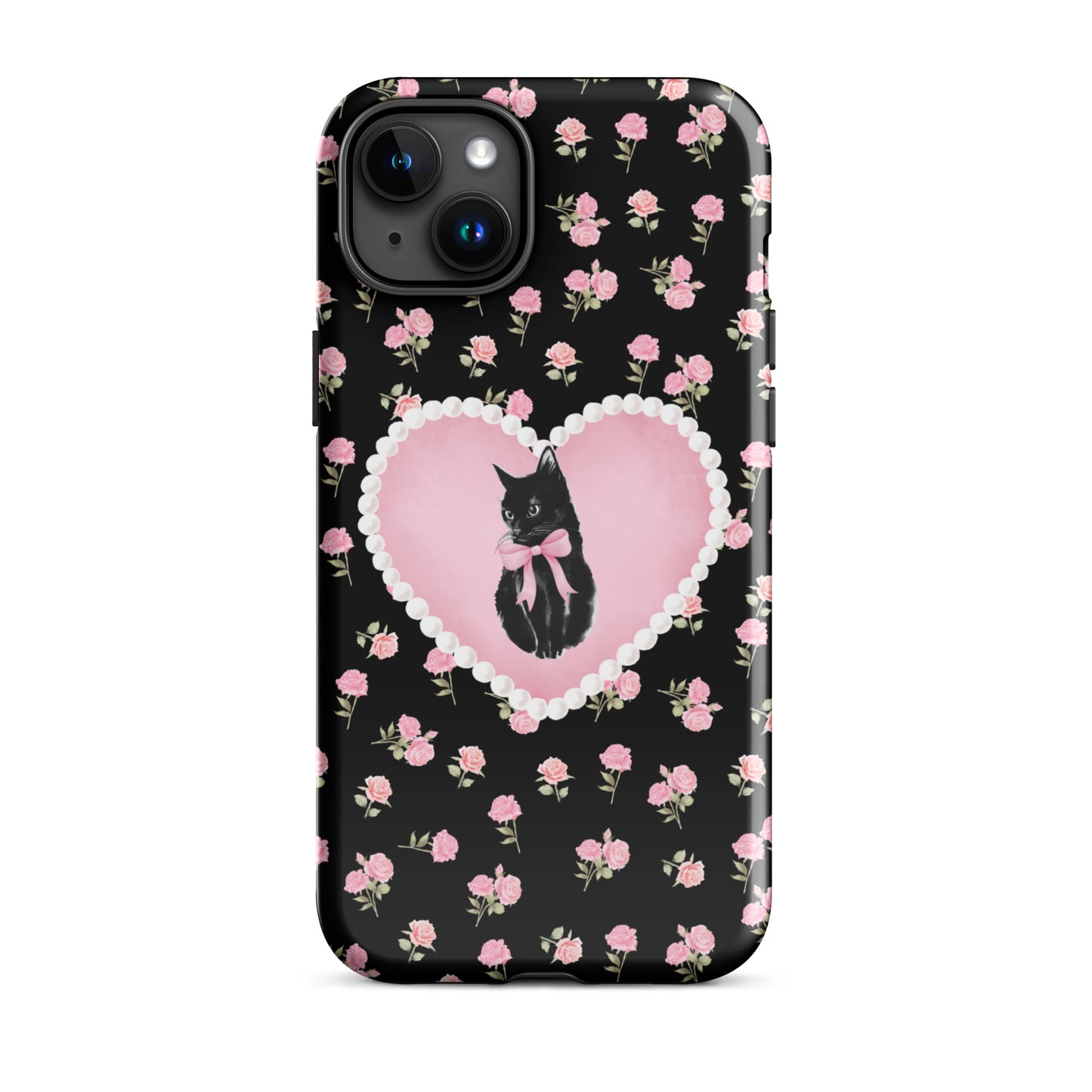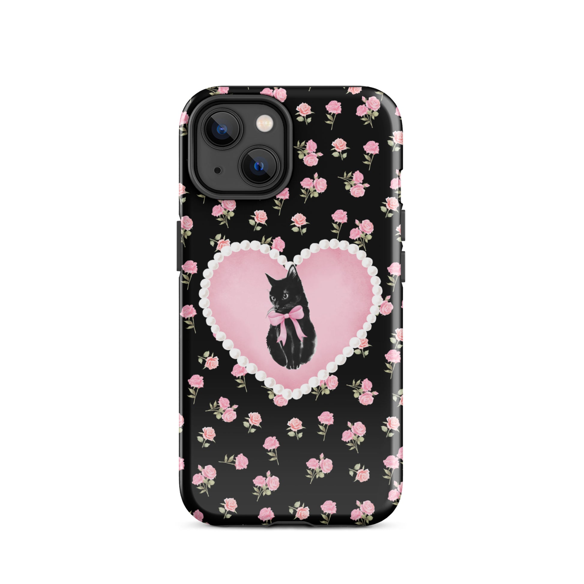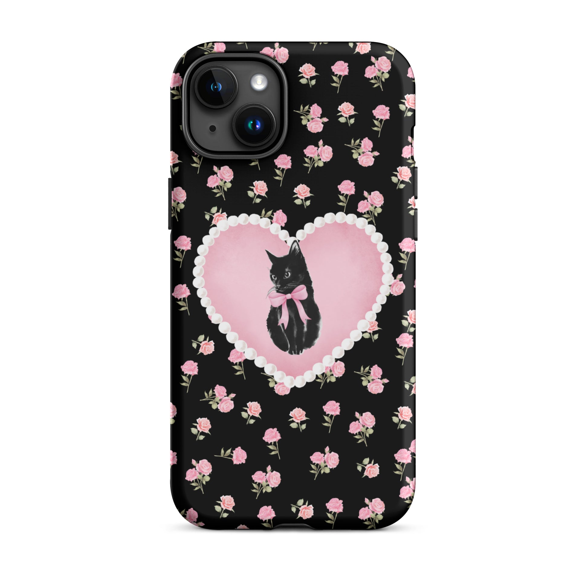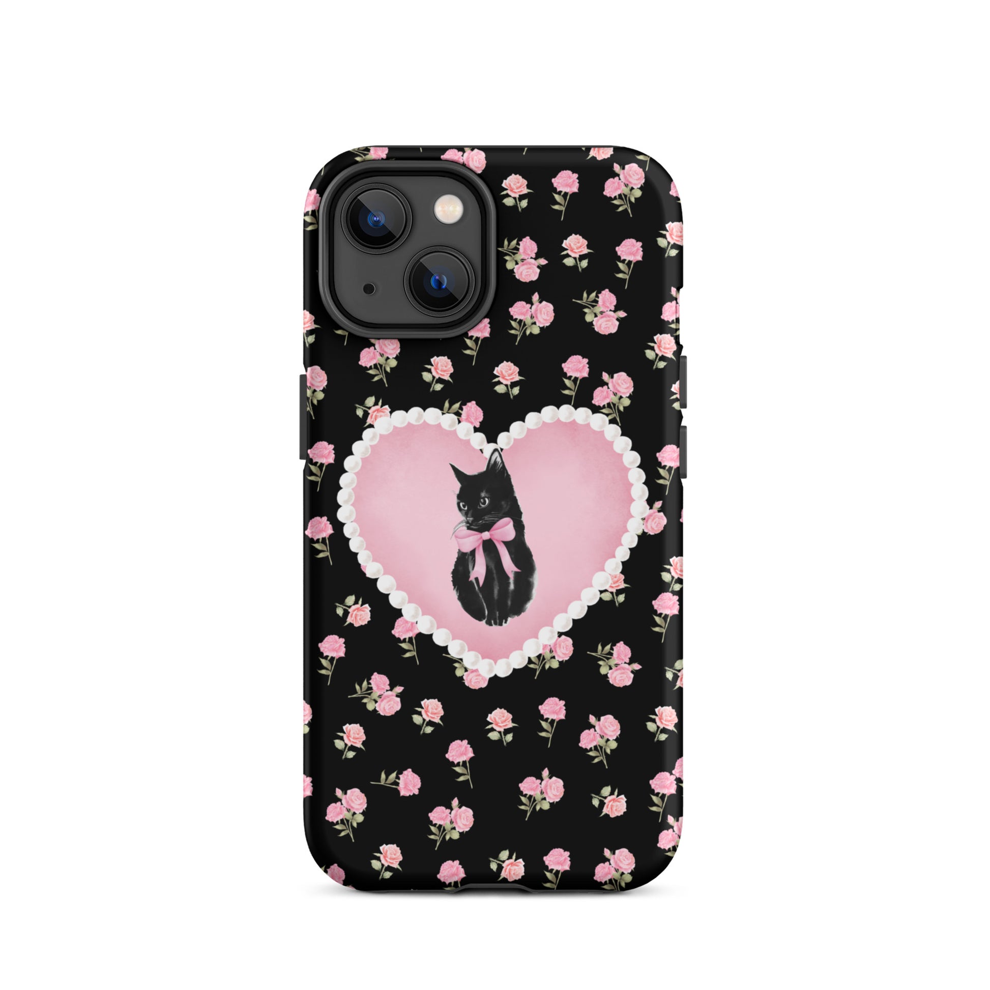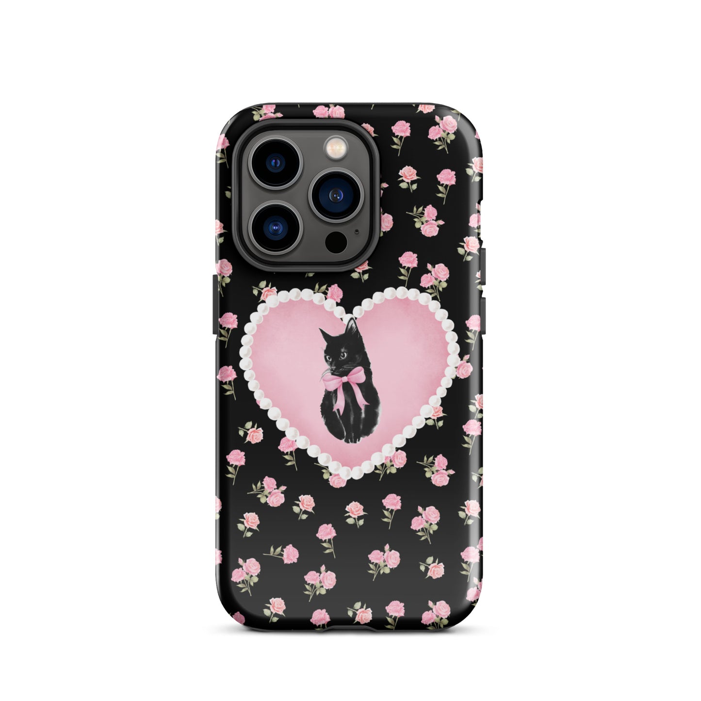For the black and pink lovers, the Black Féline Roses iPhone Case is your perfect match! Featuring an adorable black cat with a pink bow, a pink heart outlined in pearls, and vintage pink roses on a chic black background, this case adds a sweet yet dark touch to your phone.