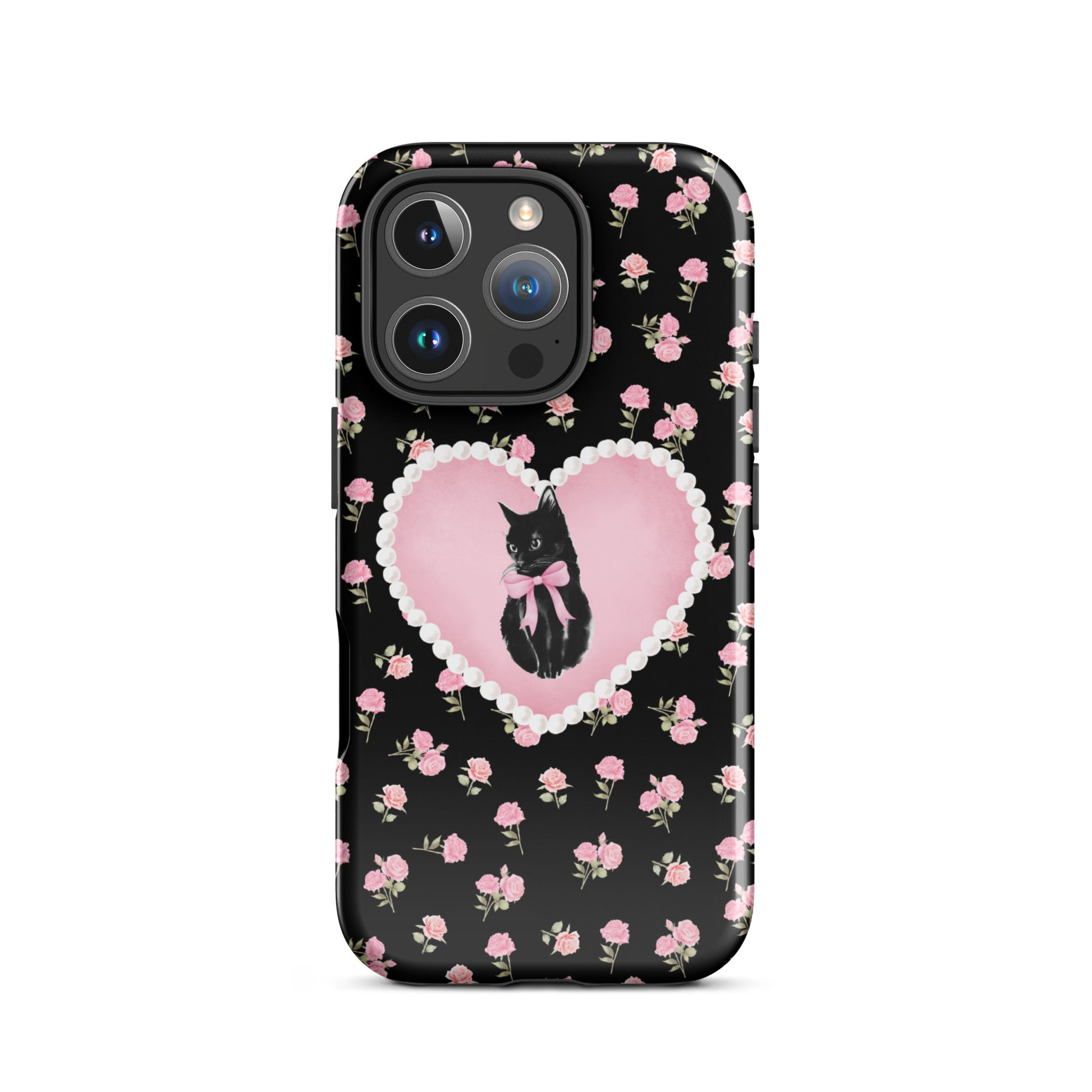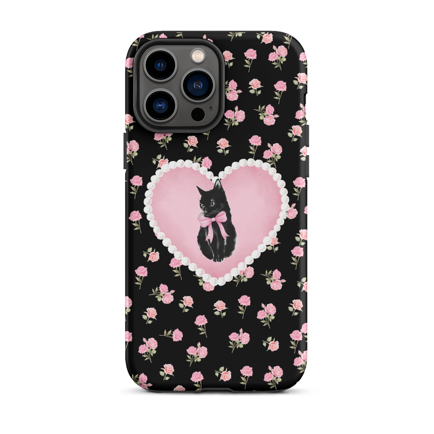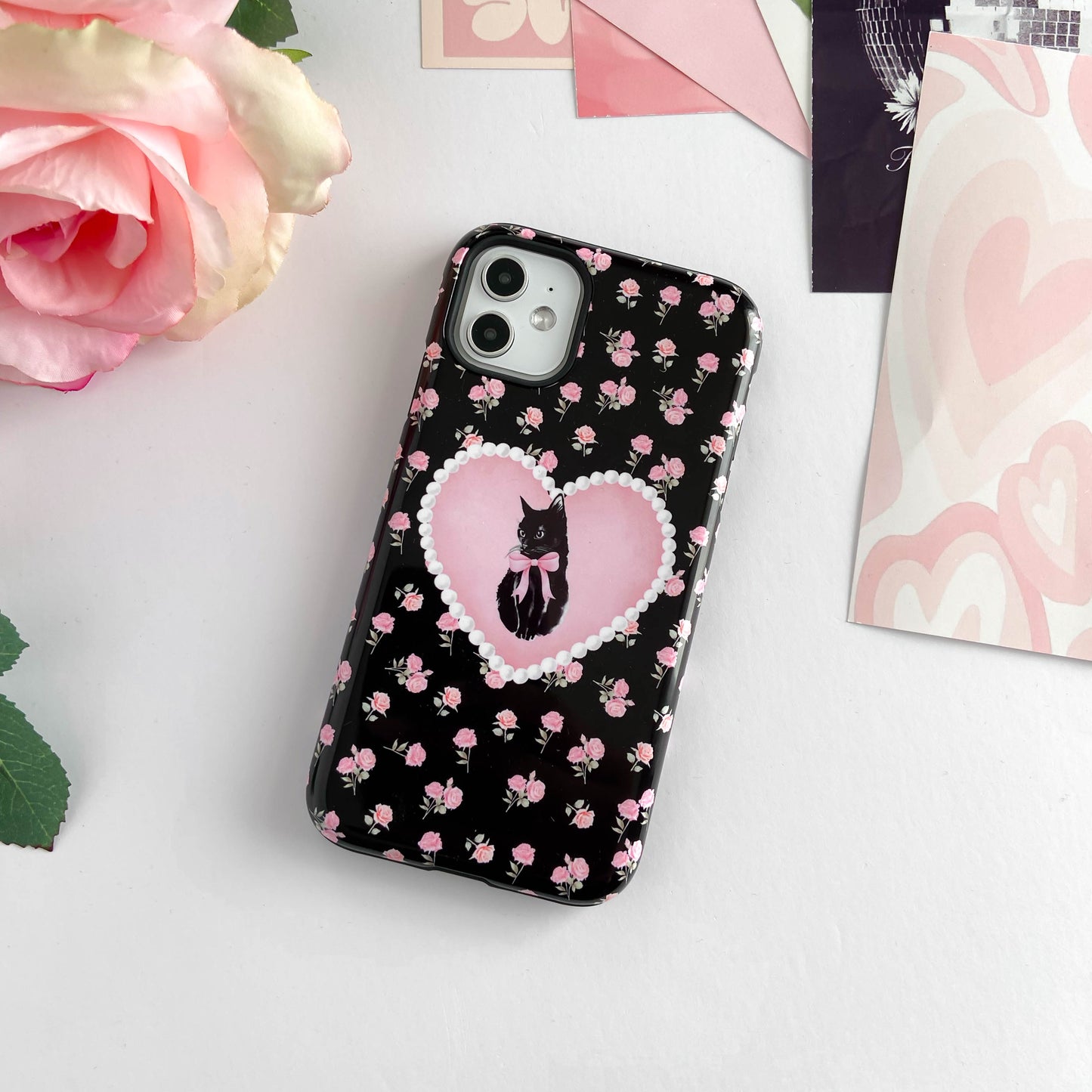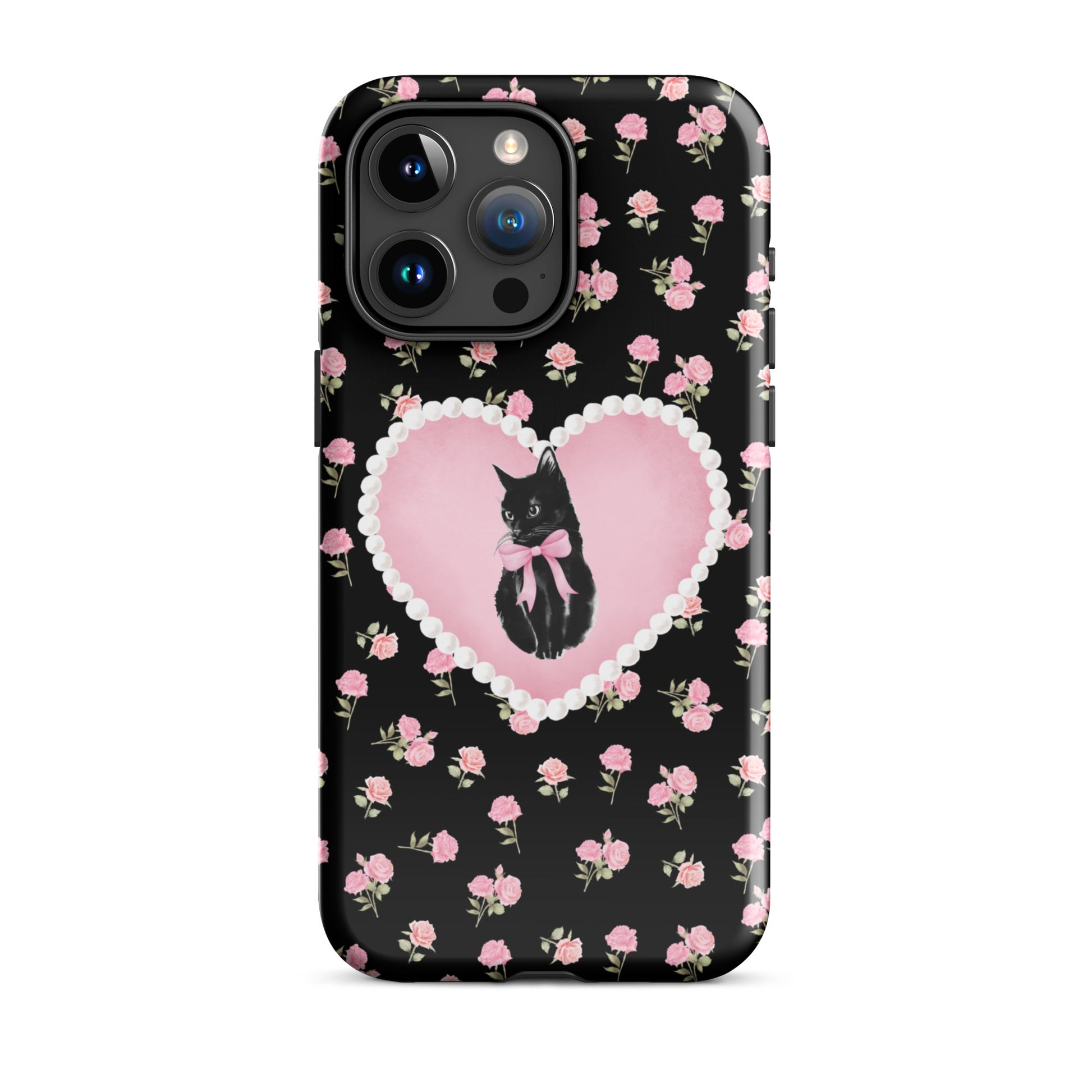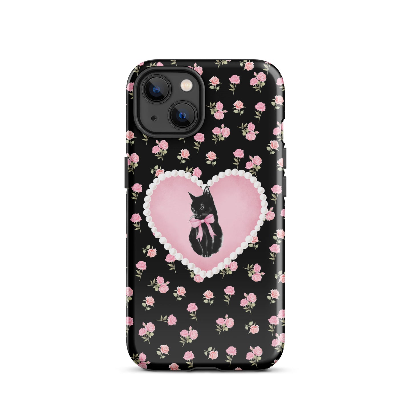 For the black and pink lovers, the Black Féline Roses iPhone Case is your perfect match! Featuring an adorable black cat with a pink bow, a pink heart outlined in pearls, and vintage pink roses on a chic black background, this case adds a sweet yet dark touch to your phone.