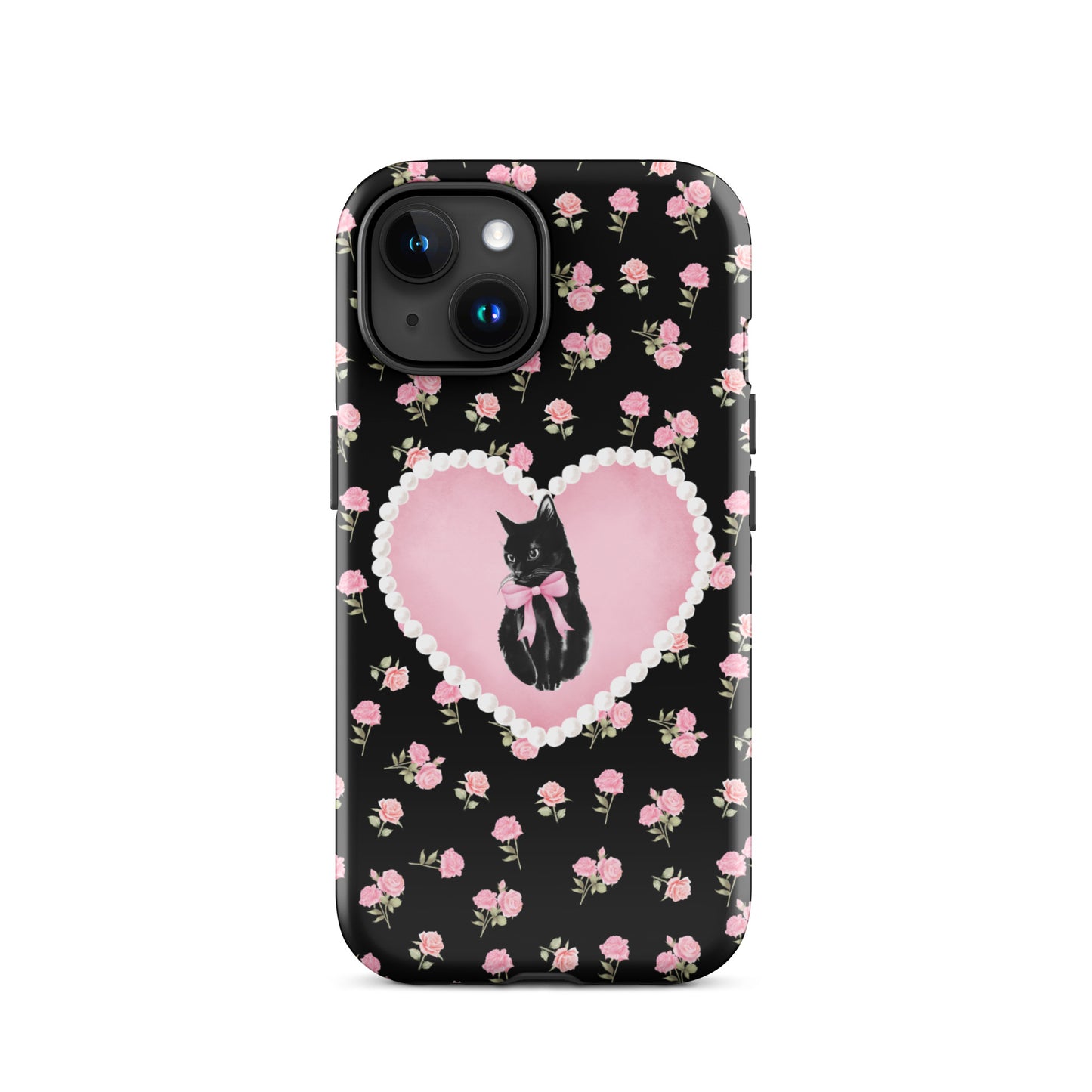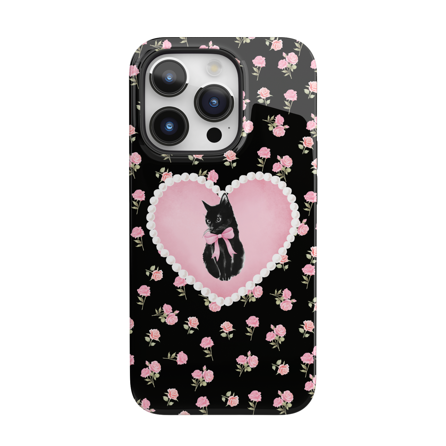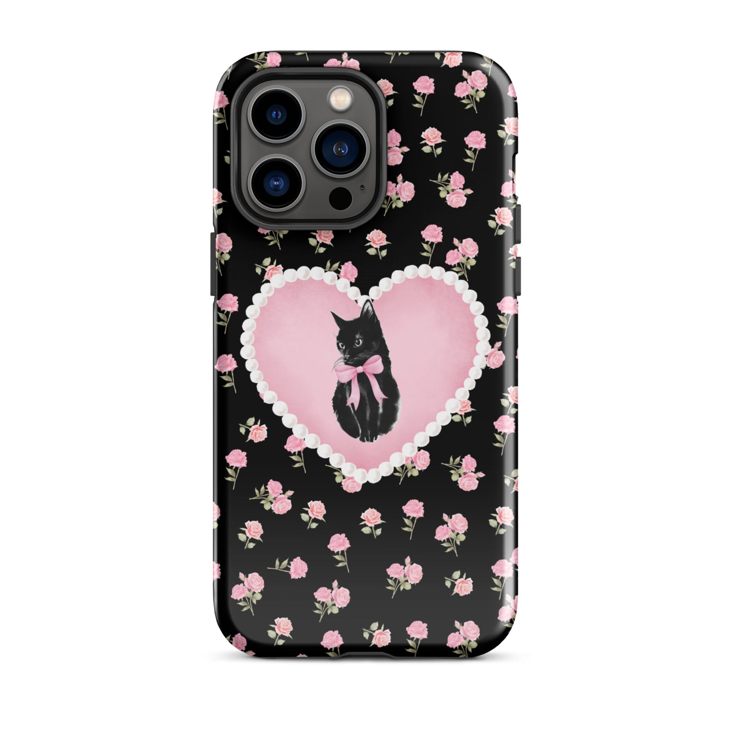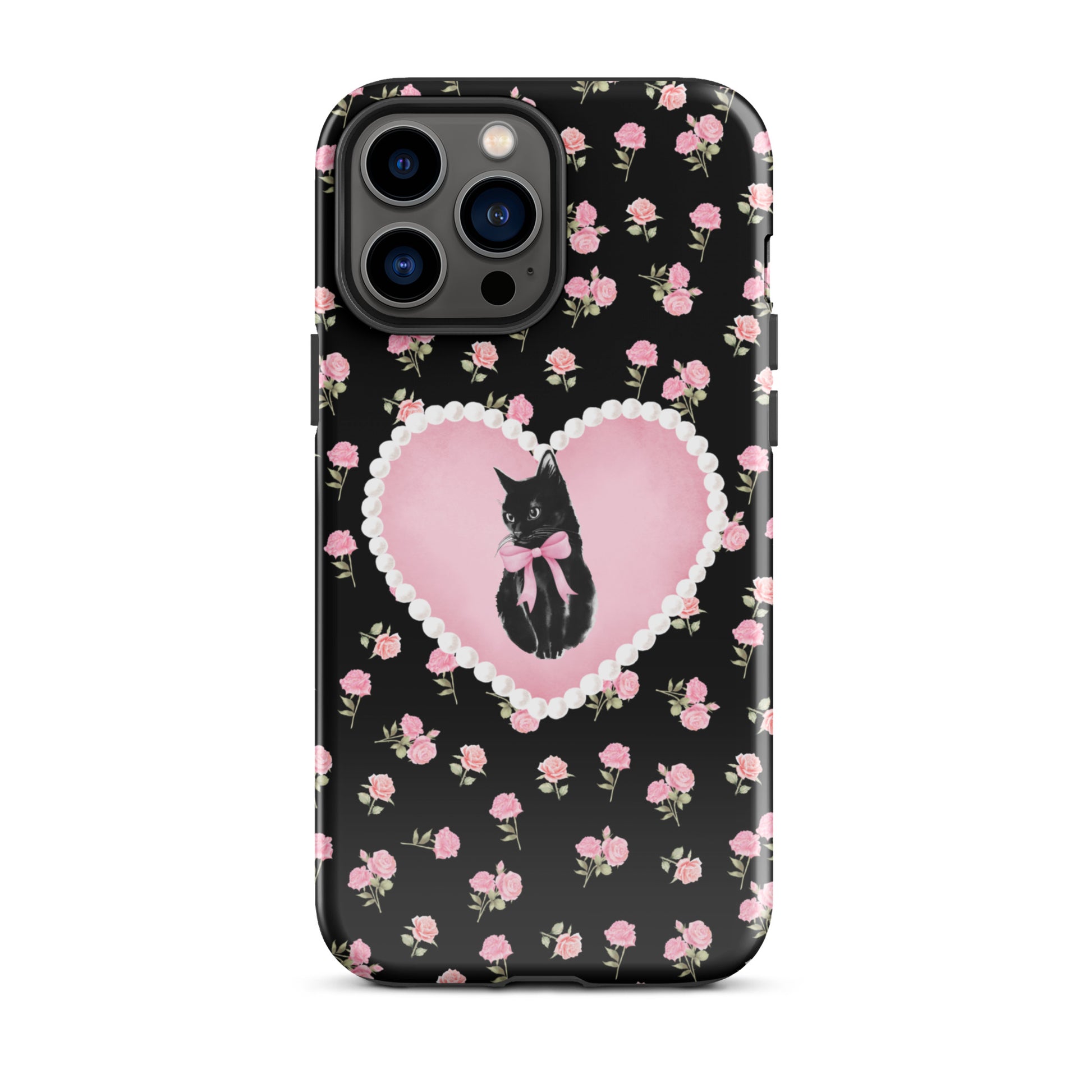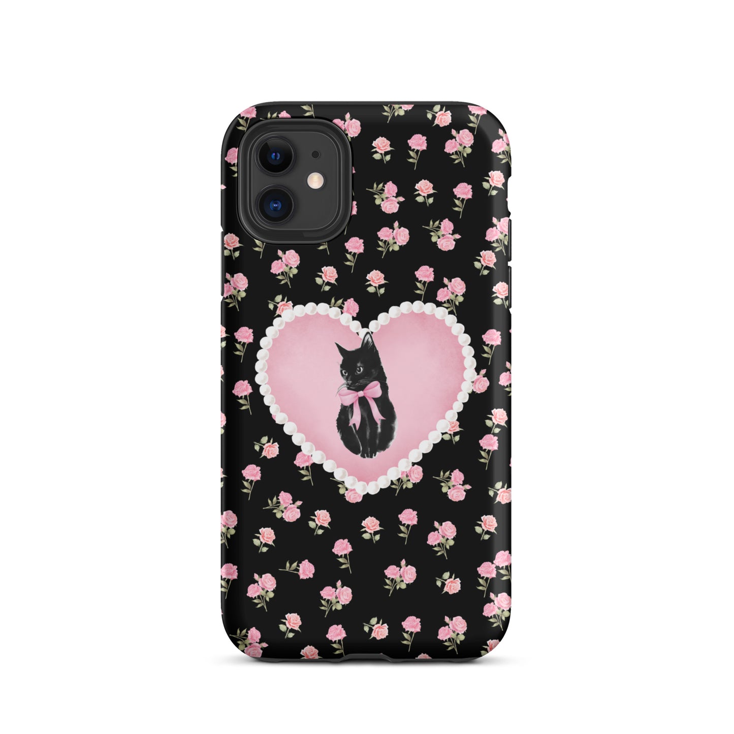 For the black and pink lovers, the Black Féline Roses iPhone Case is your perfect match! Featuring an adorable black cat with a pink bow, a pink heart outlined in pearls, and vintage pink roses on a chic black background, this case adds a sweet yet dark touch to your phone.