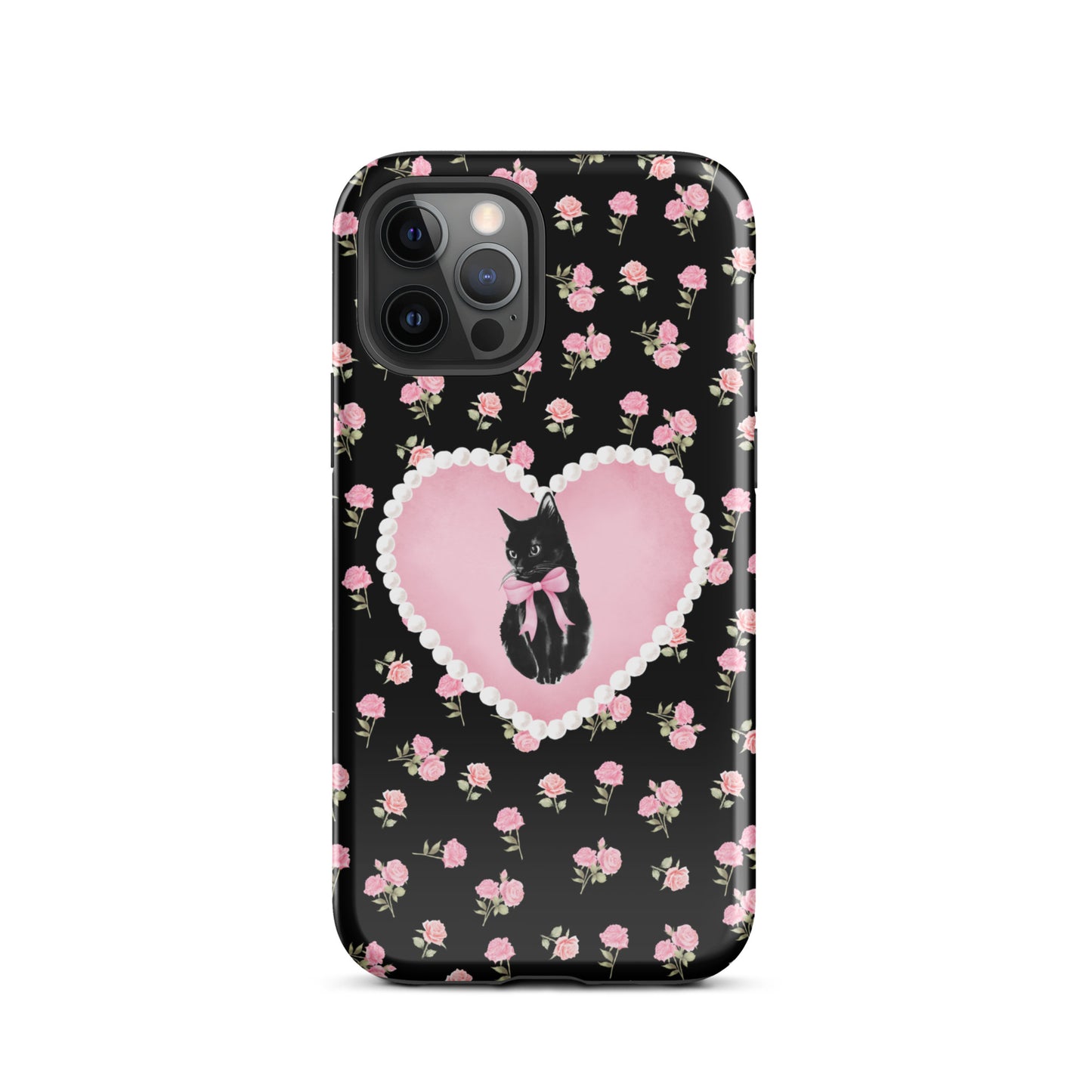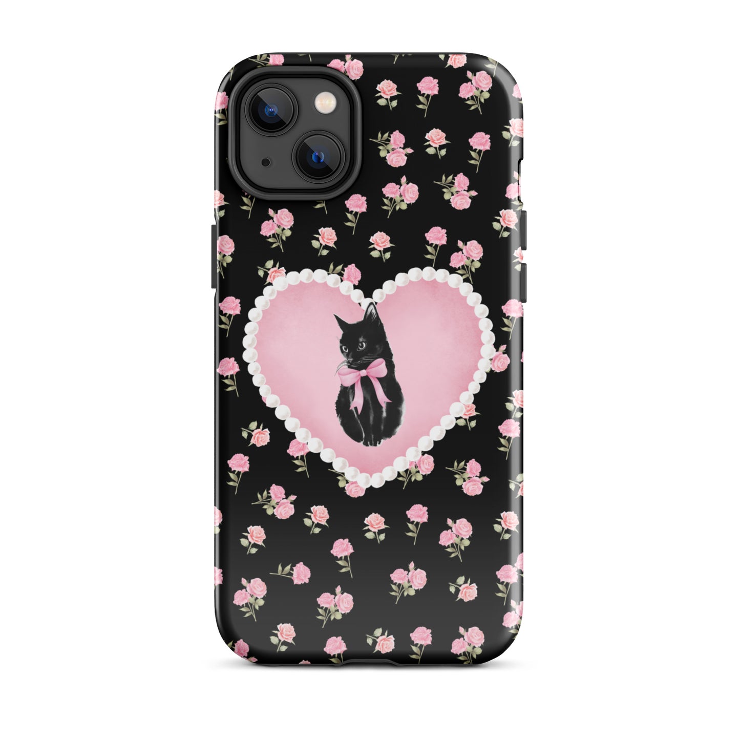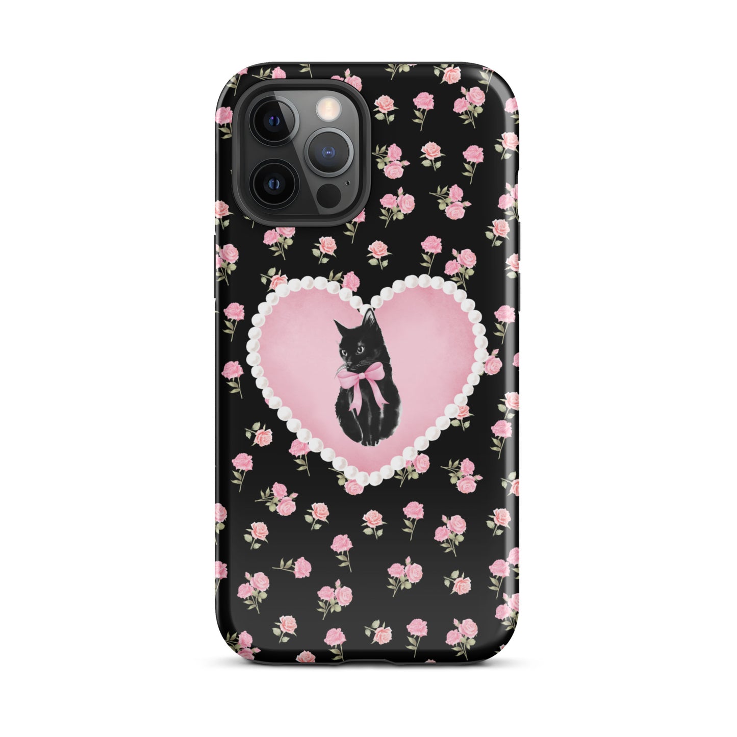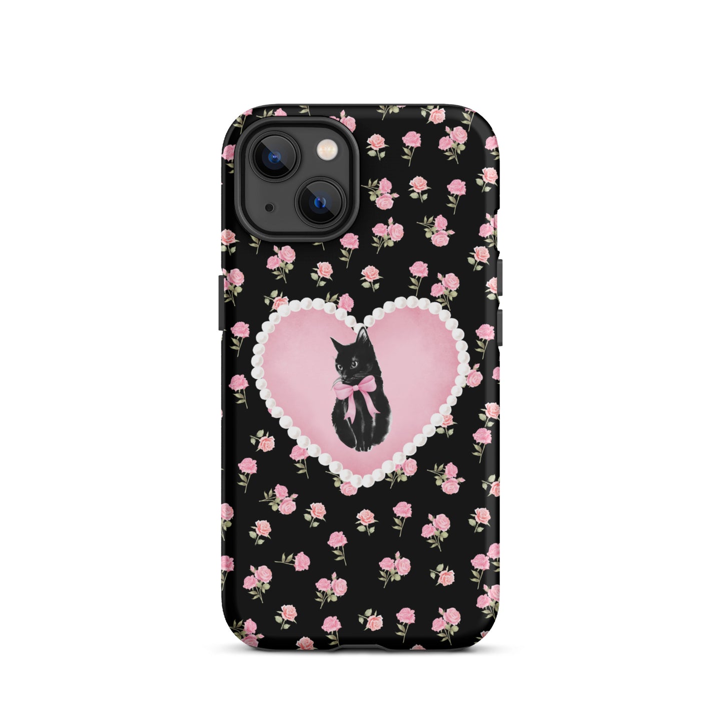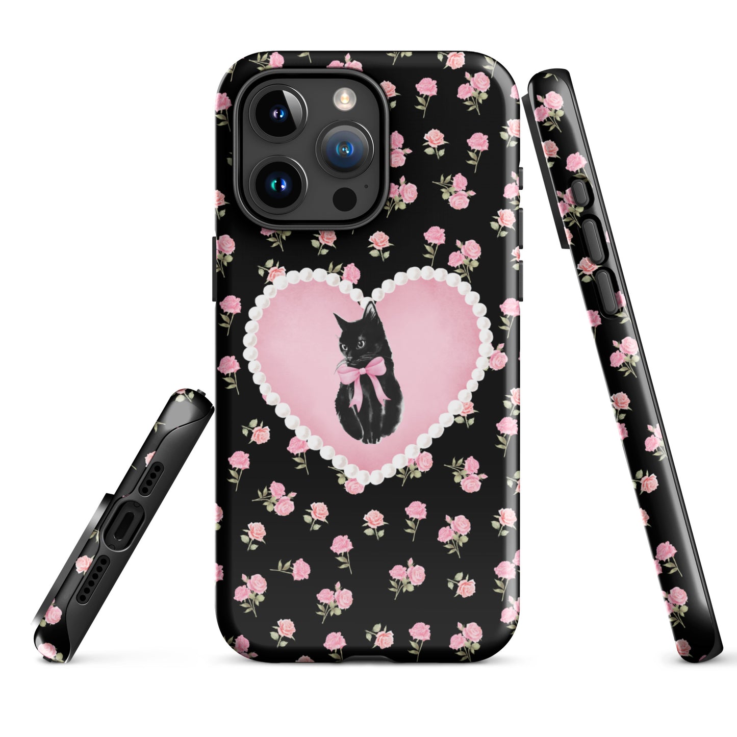 For the black and pink lovers, the Black Féline Roses iPhone Case is your perfect match! Featuring an adorable black cat with a pink bow, a pink heart outlined in pearls, and vintage pink roses on a chic black background, this case adds a sweet yet dark touch to your phone.