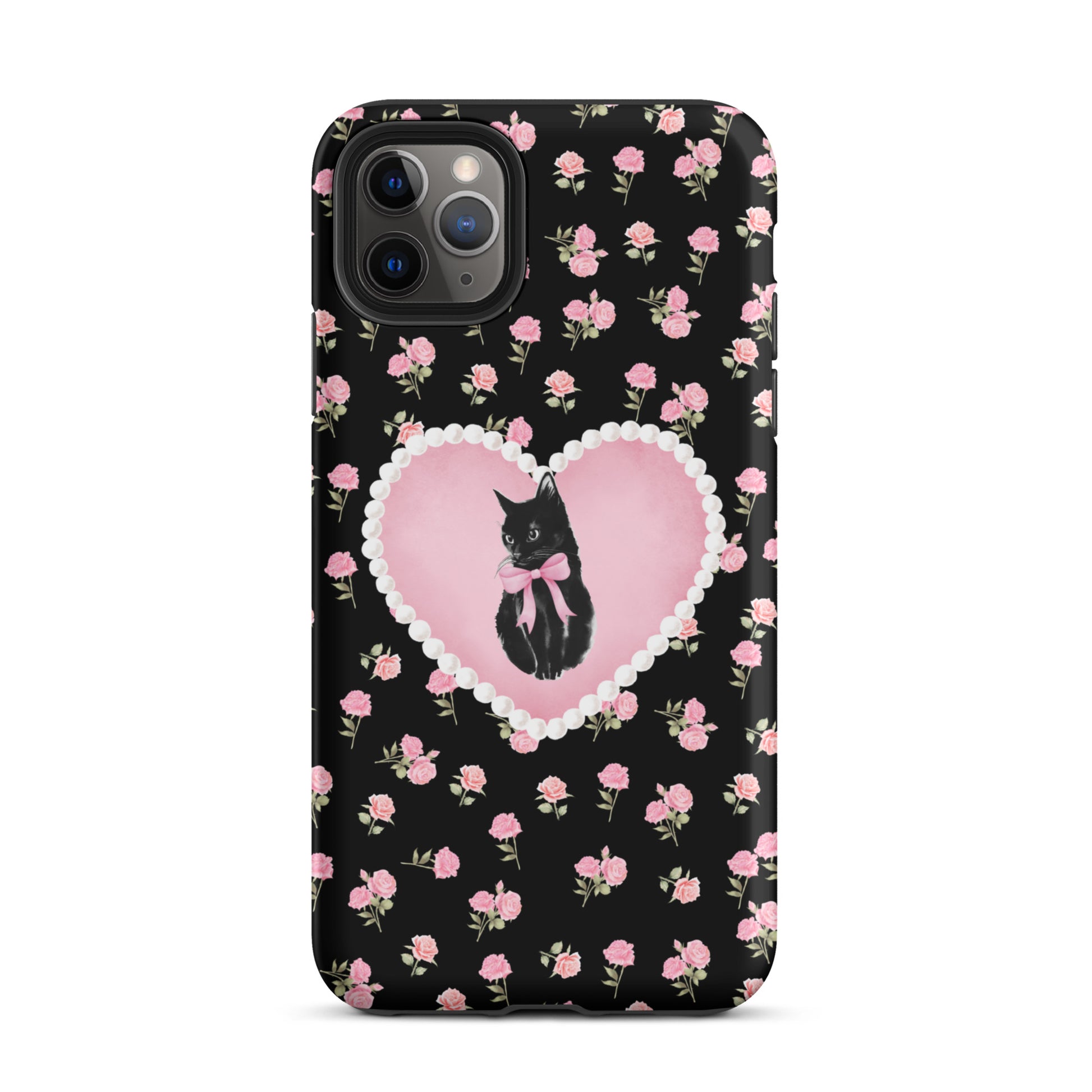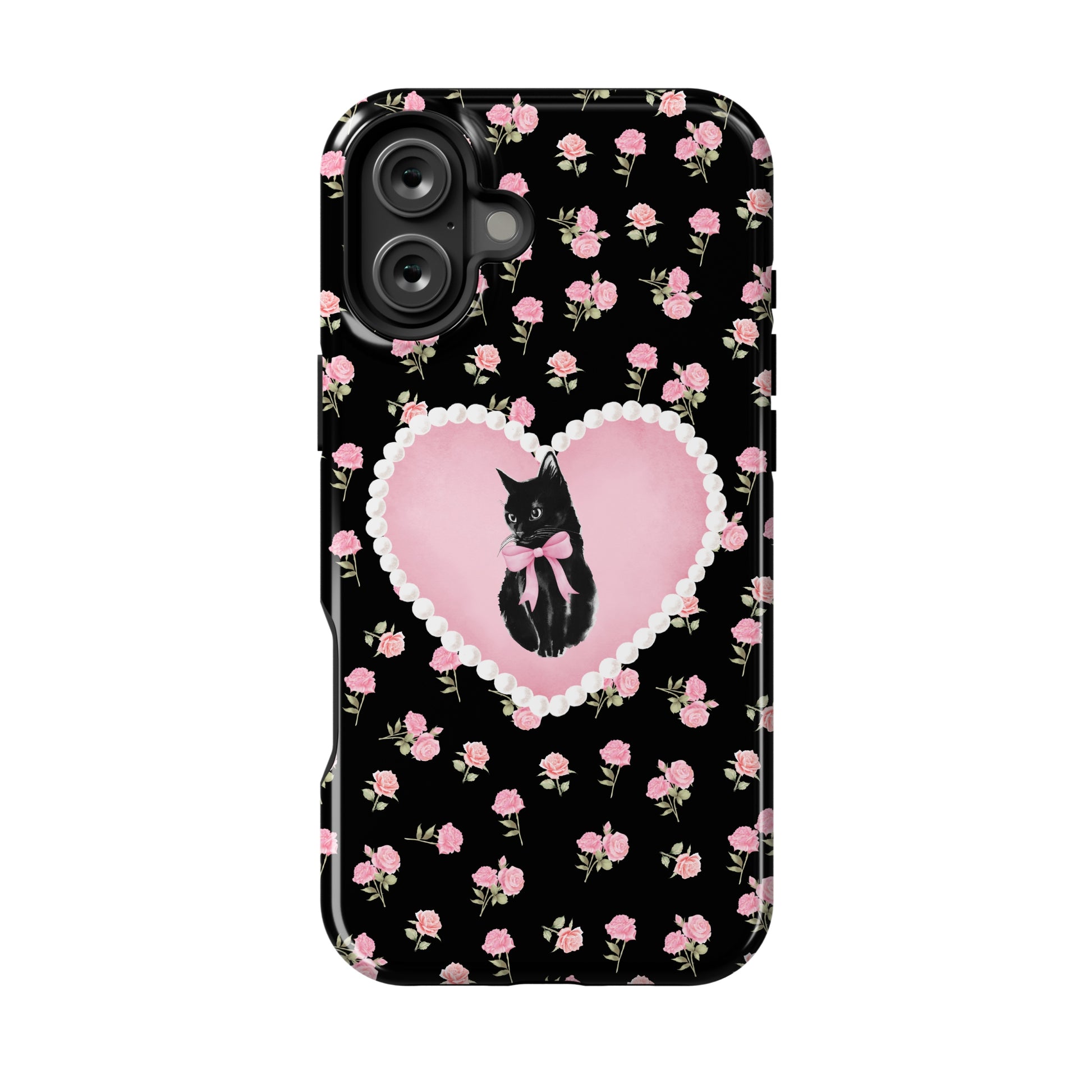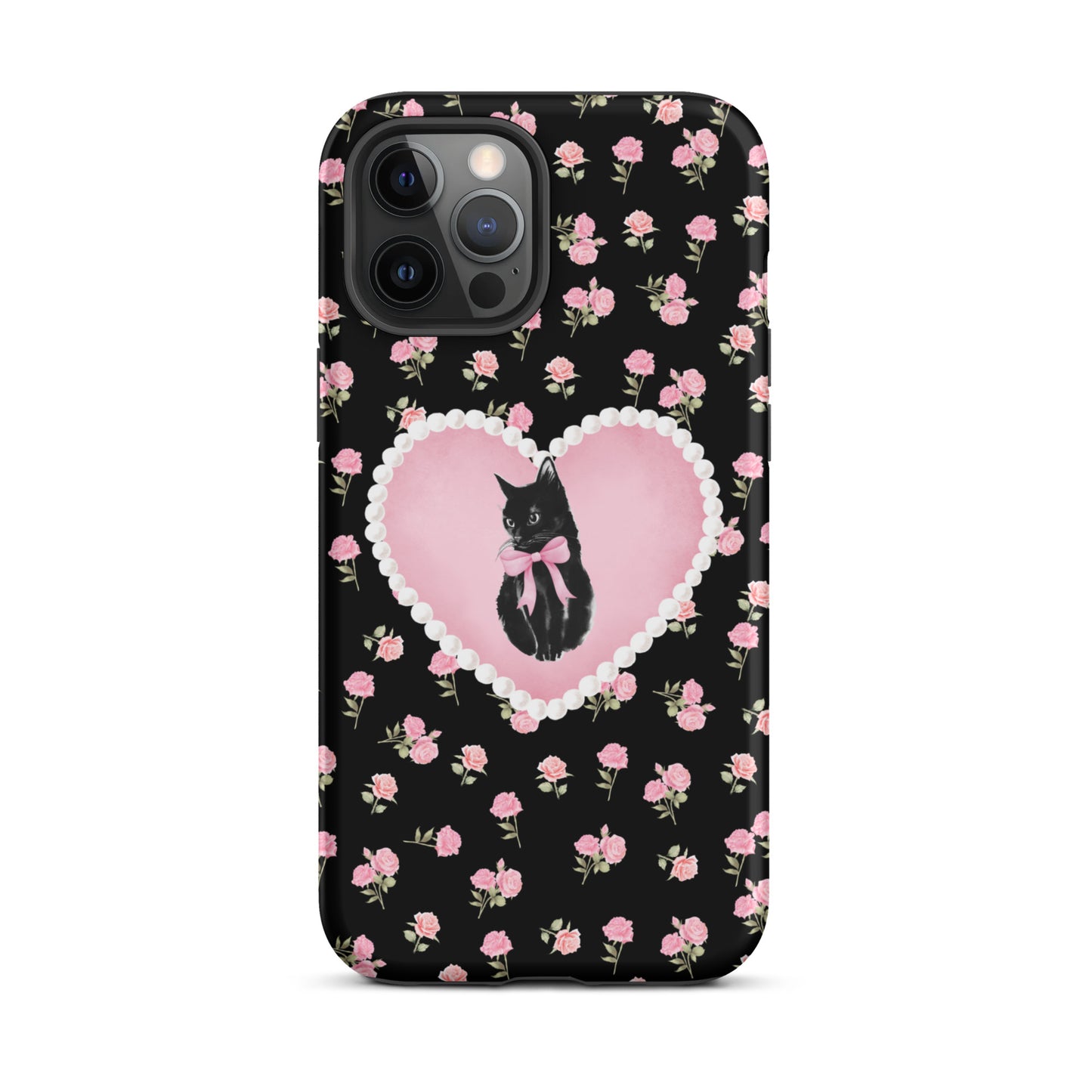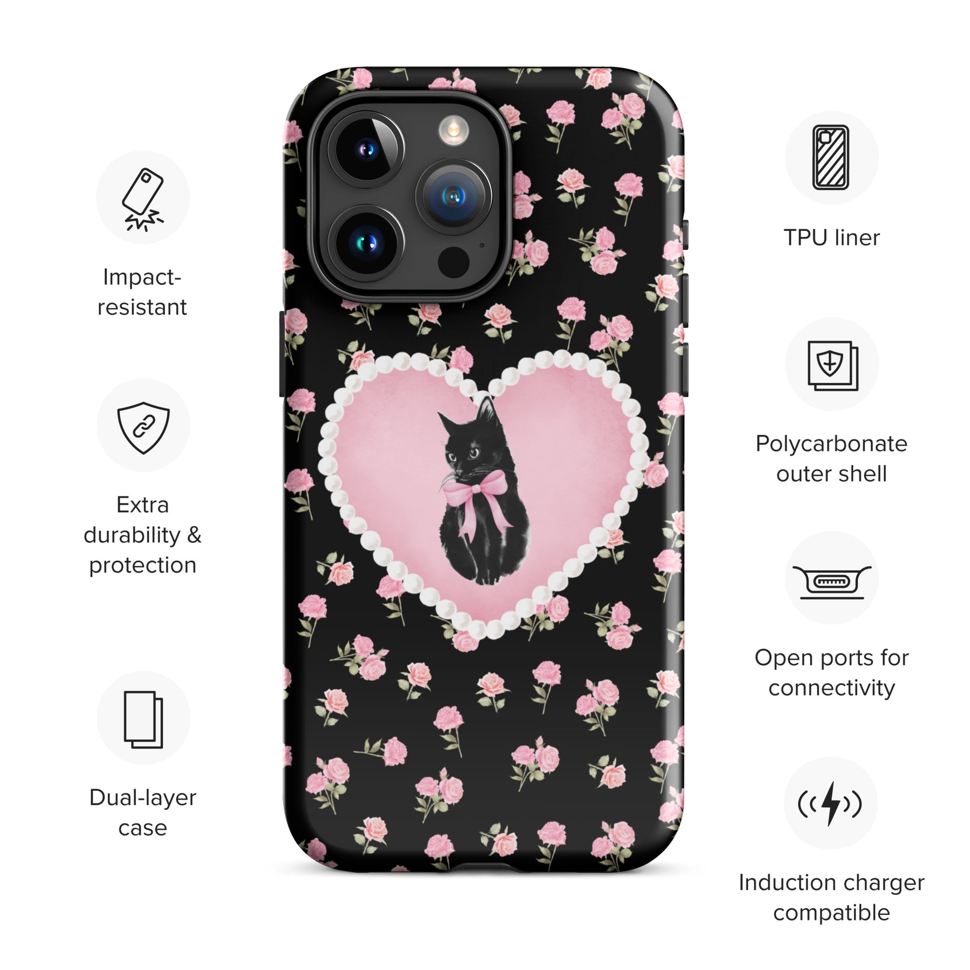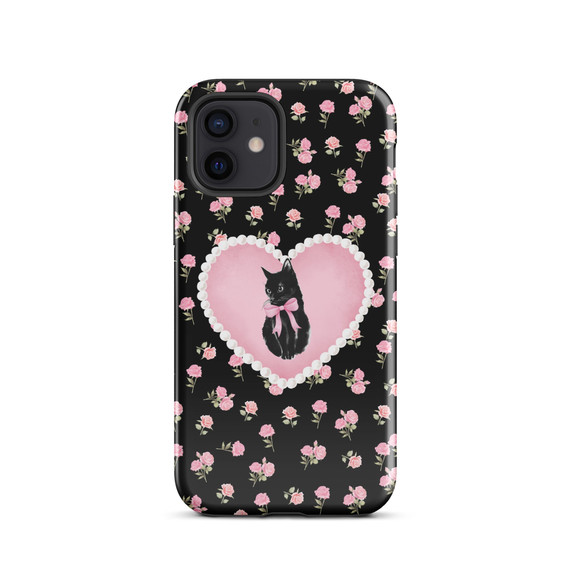 For the black and pink lovers, the Black Féline Roses iPhone Case is your perfect match! Featuring an adorable black cat with a pink bow, a pink heart outlined in pearls, and vintage pink roses on a chic black background, this case adds a sweet yet dark touch to your phone.