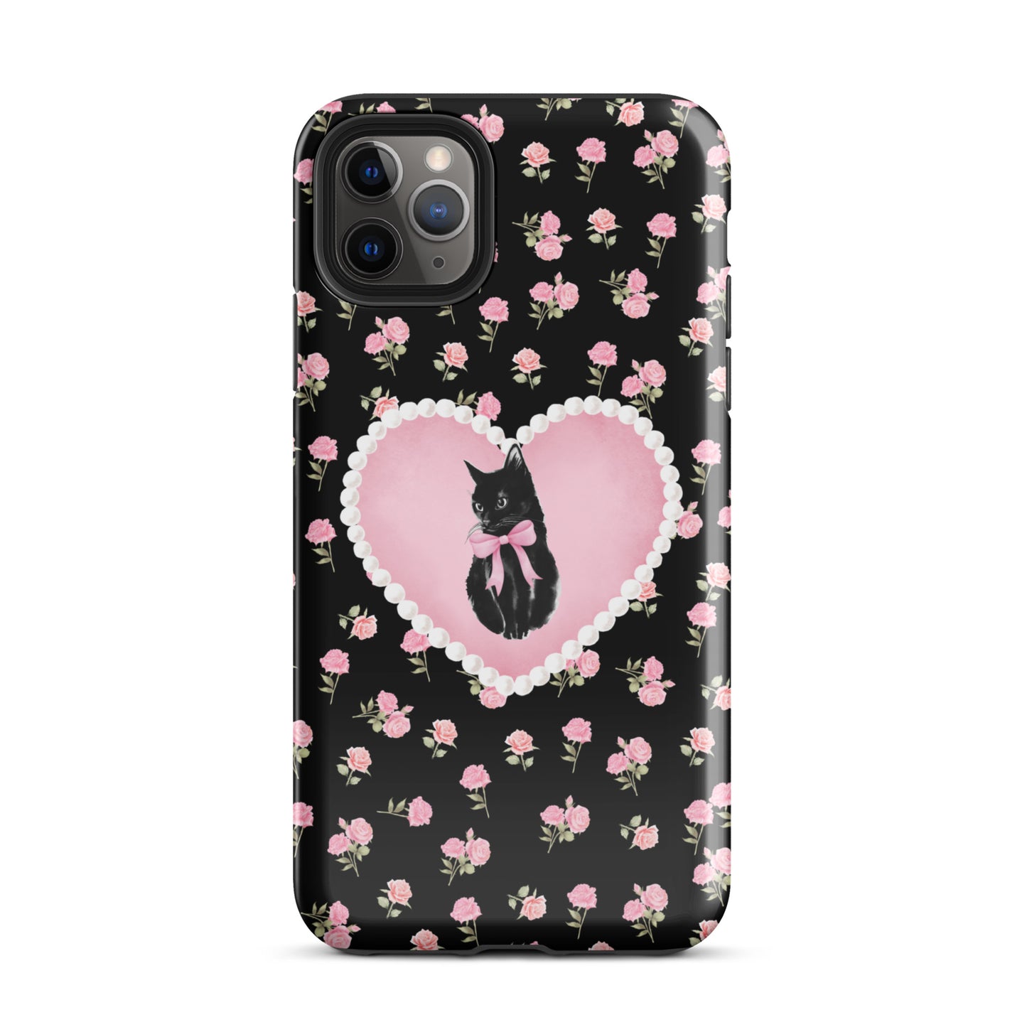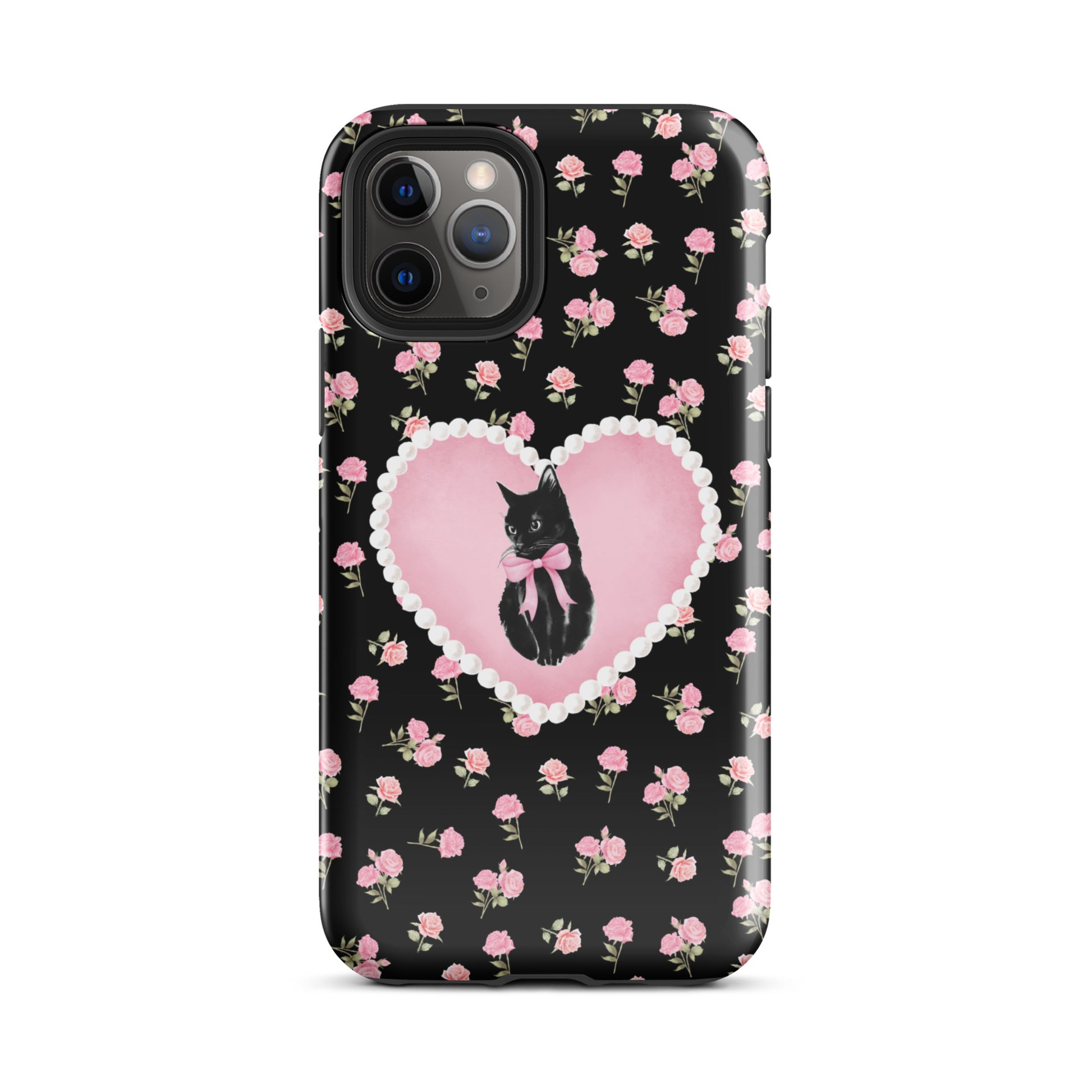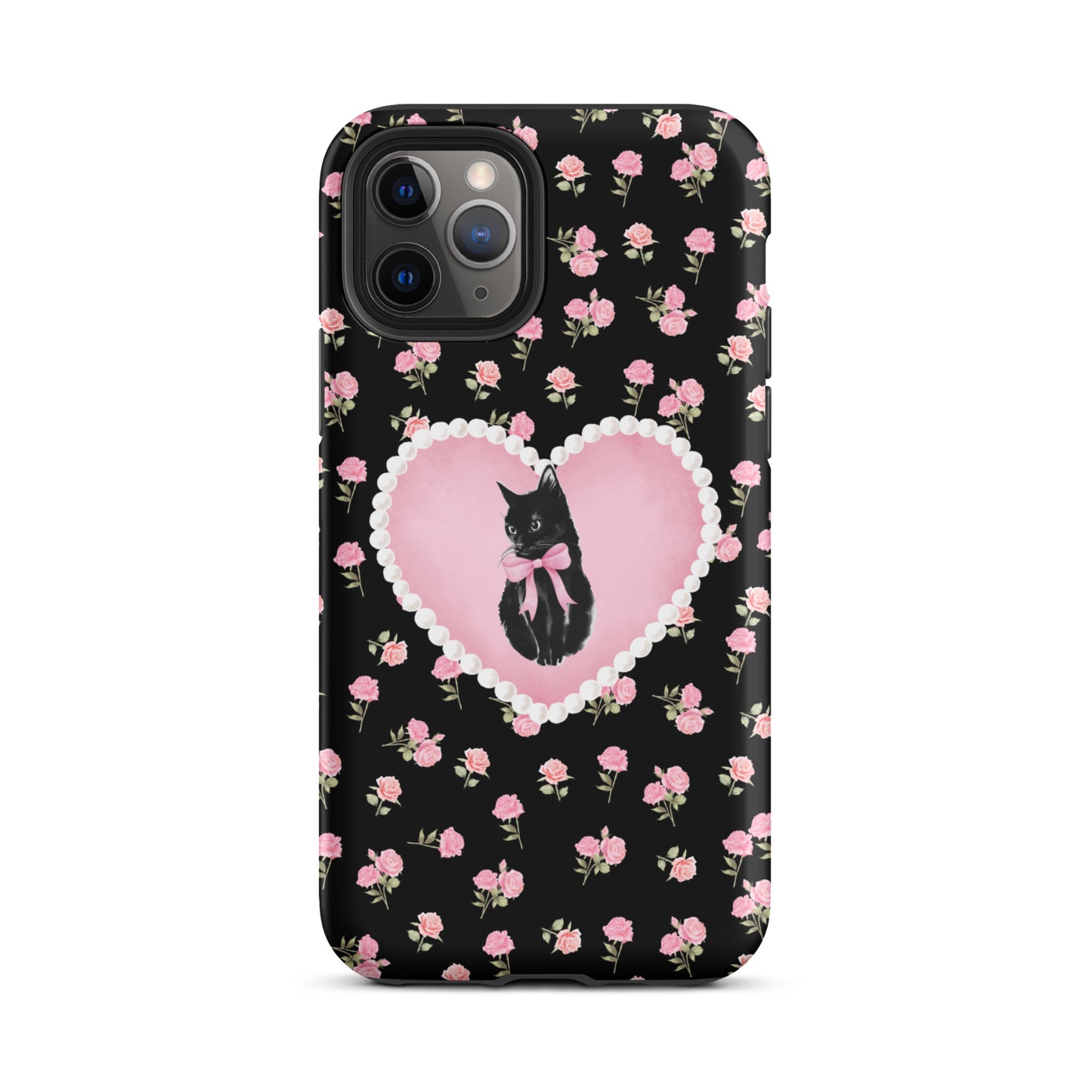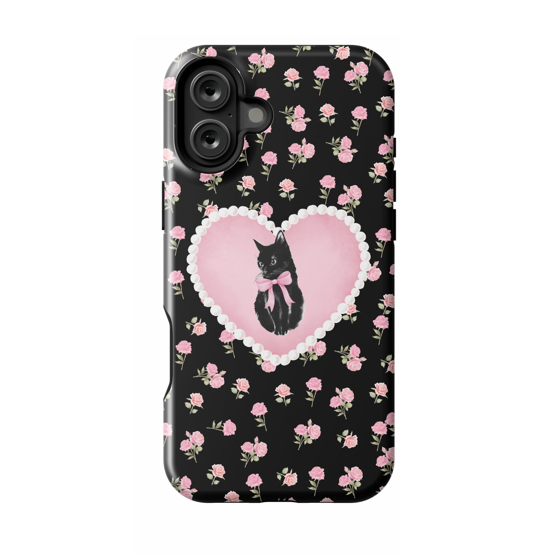 For the black and pink lovers, the Black Féline Roses iPhone Case is your perfect match! Featuring an adorable black cat with a pink bow, a pink heart outlined in pearls, and vintage pink roses on a chic black background, this case adds a sweet yet dark touch to your phone.