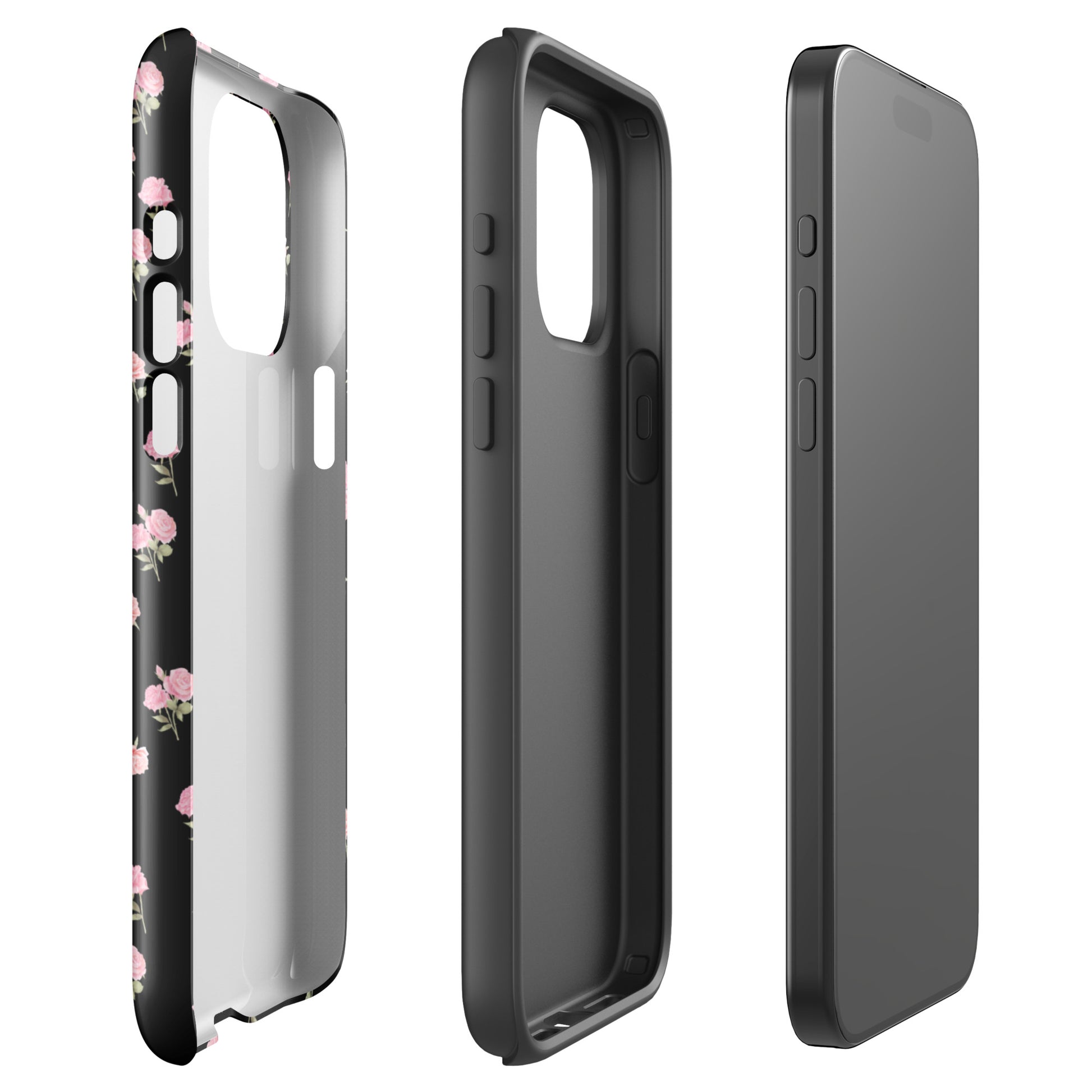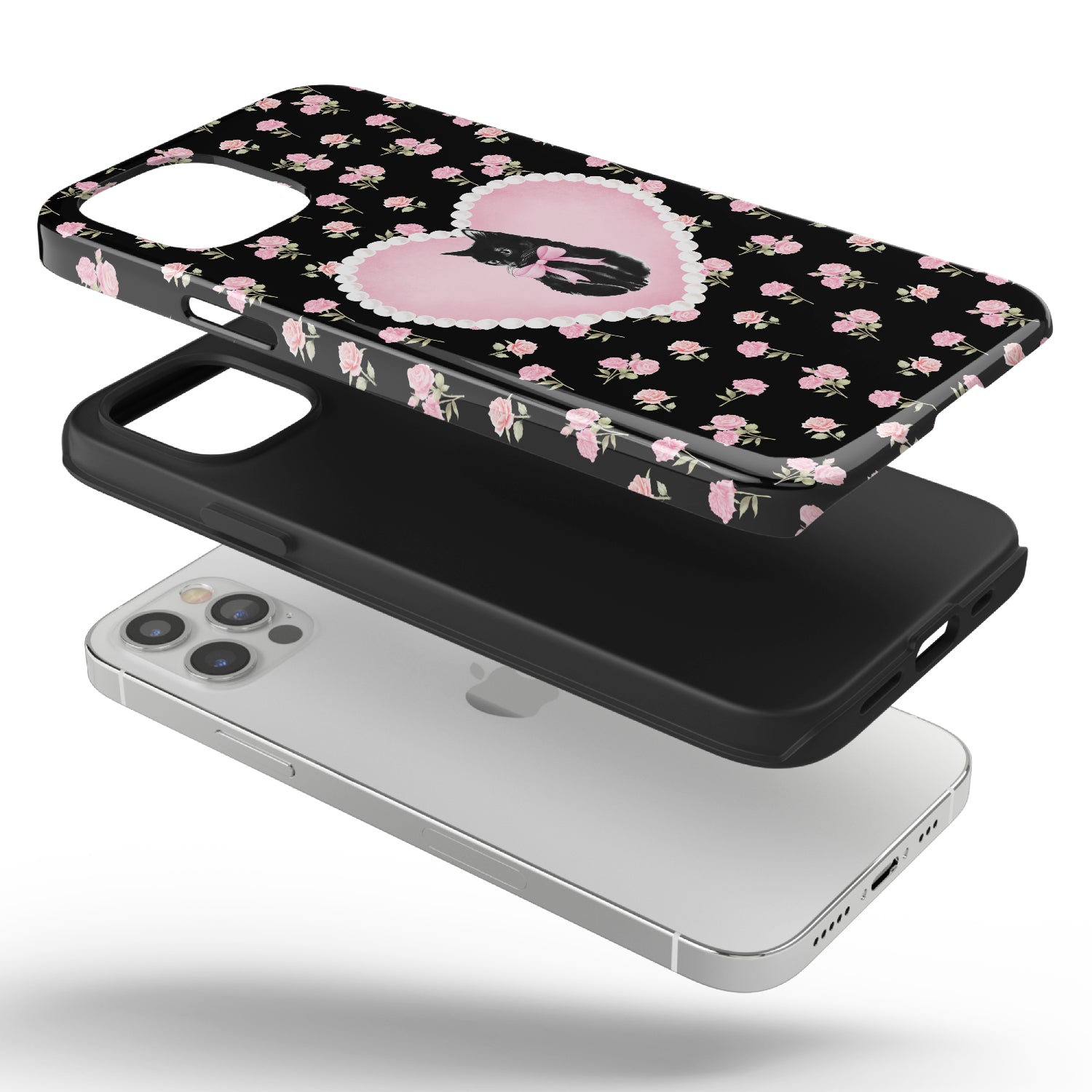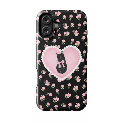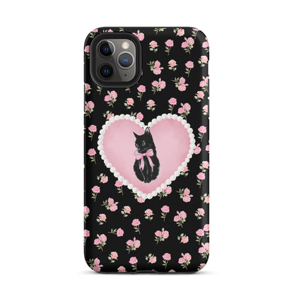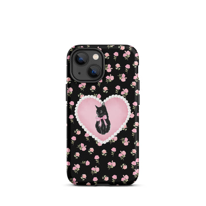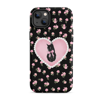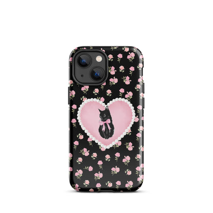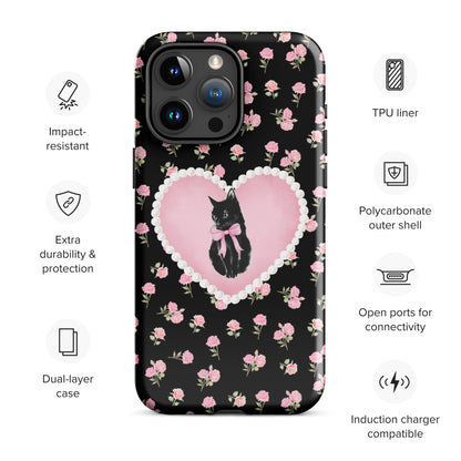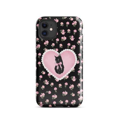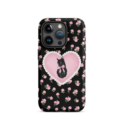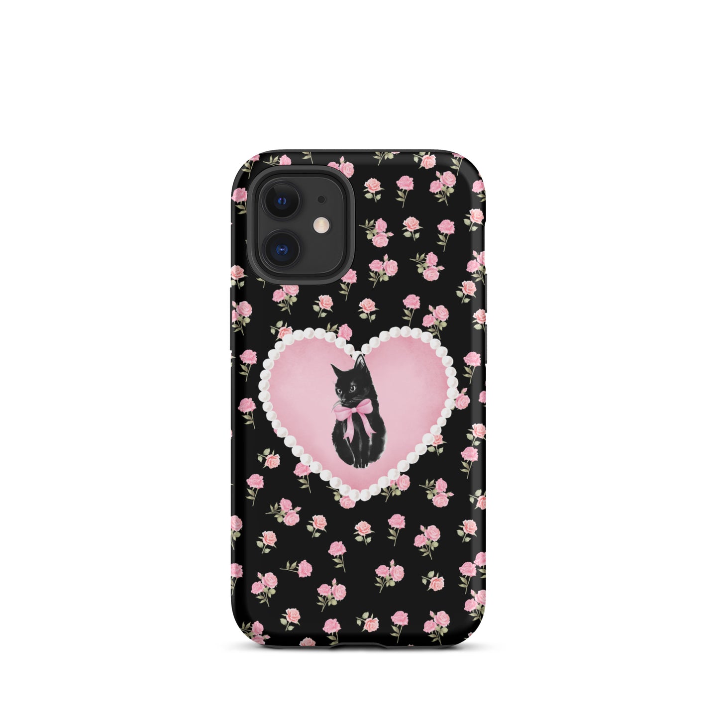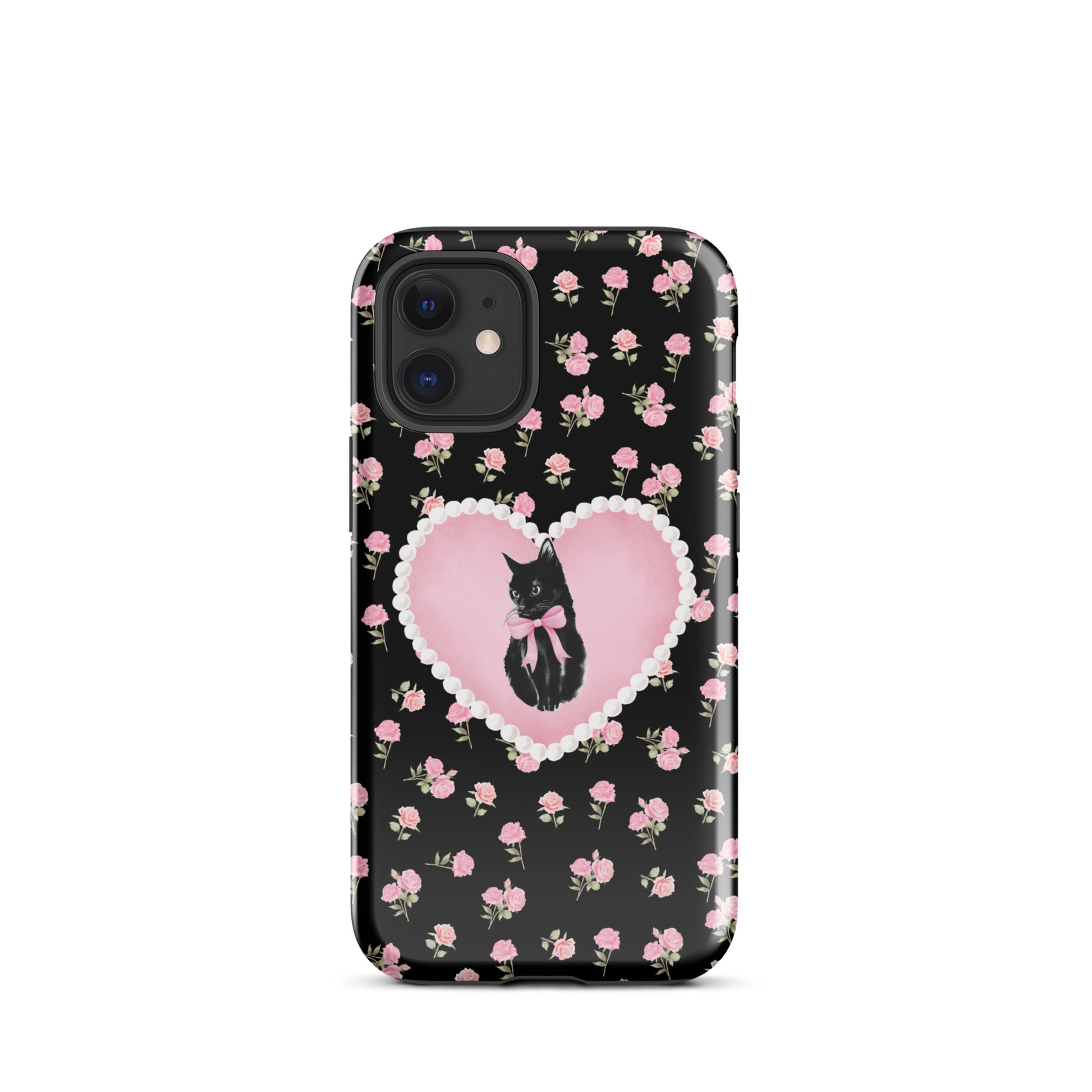 For the black and pink lovers, the Black Féline Roses iPhone Case is your perfect match! Featuring an adorable black cat with a pink bow, a pink heart outlined in pearls, and vintage pink roses on a chic black background, this case adds a sweet yet dark touch to your phone.