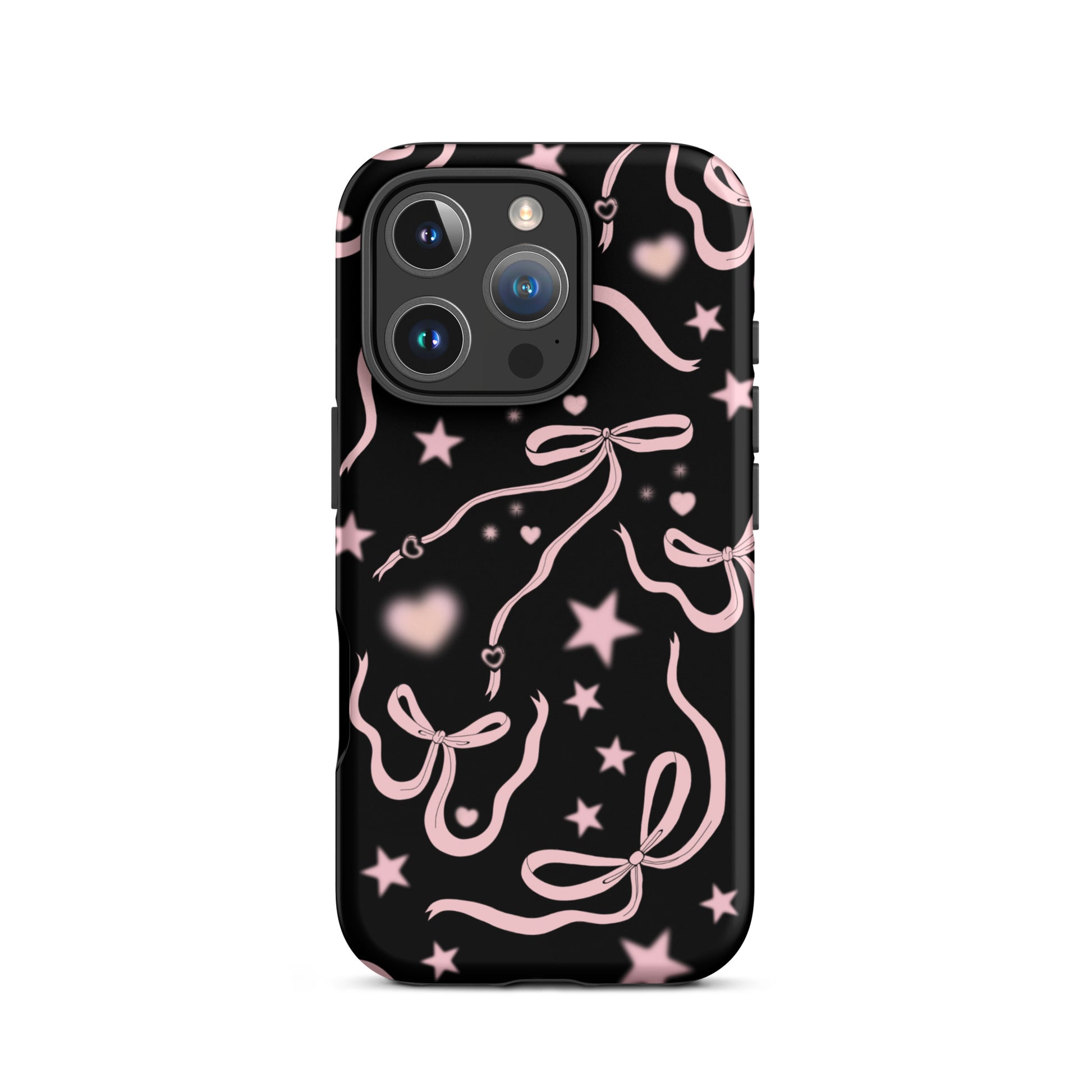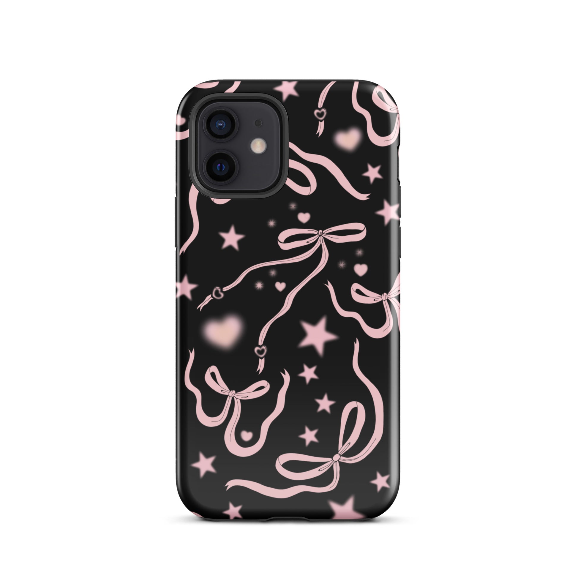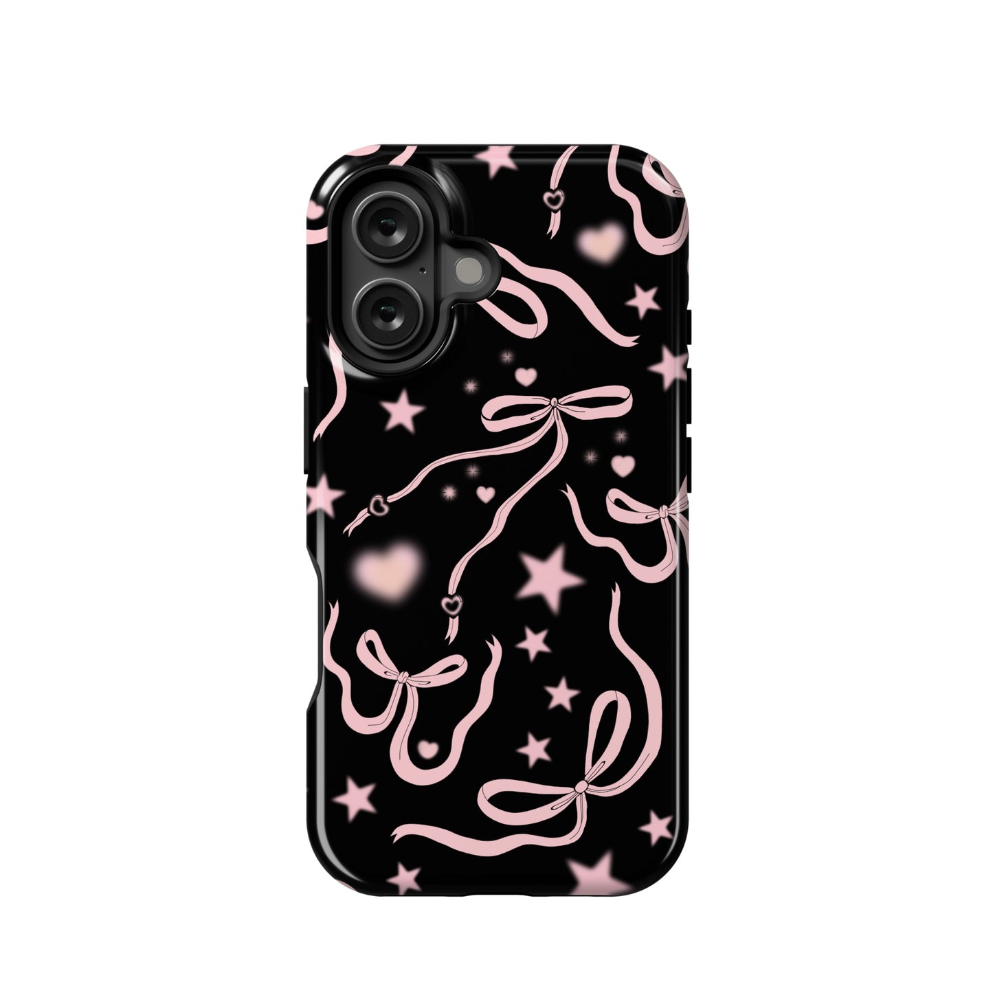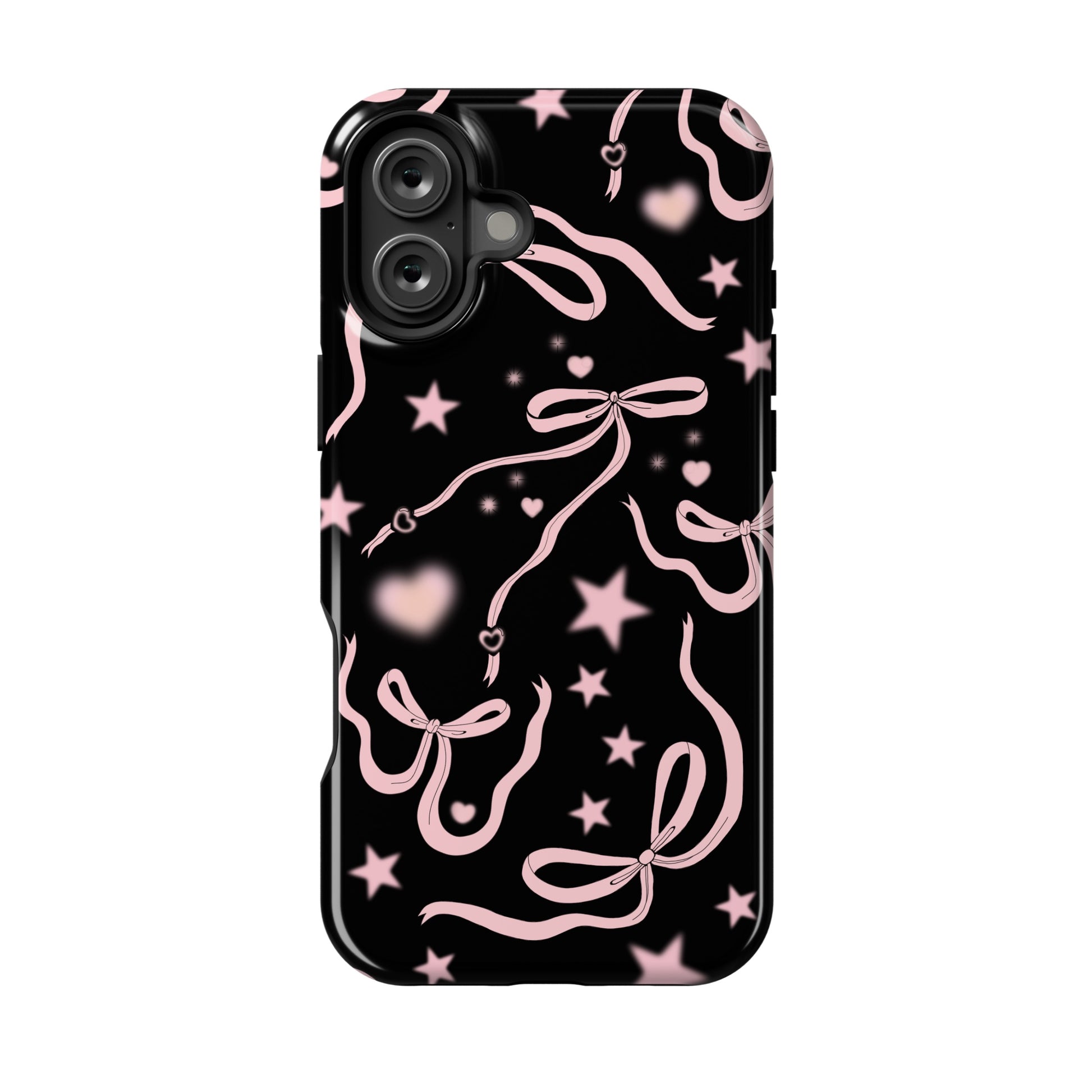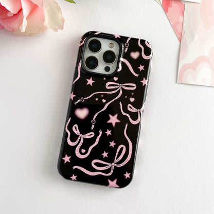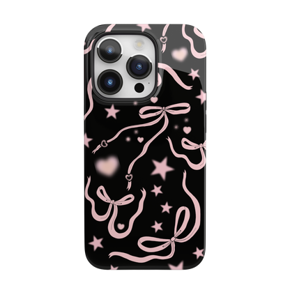 Step into a coquette-inspired Y2K dream with the Black Cosmic Bows iPhone Case! Featuring cute light pink ribbon bows and soft gradient pink stars and hearts on a sleek black background, this case brings a bold yet whimsical touch to your phone. Perfect for adding a dreamy, nostalgic vibe to your style.