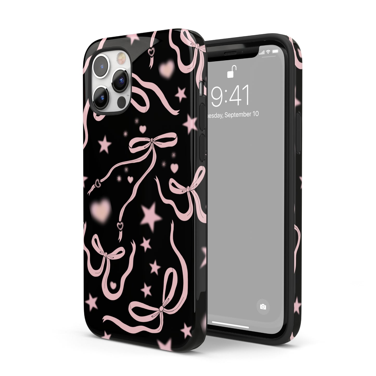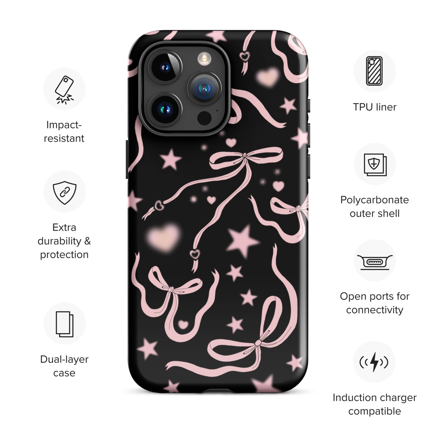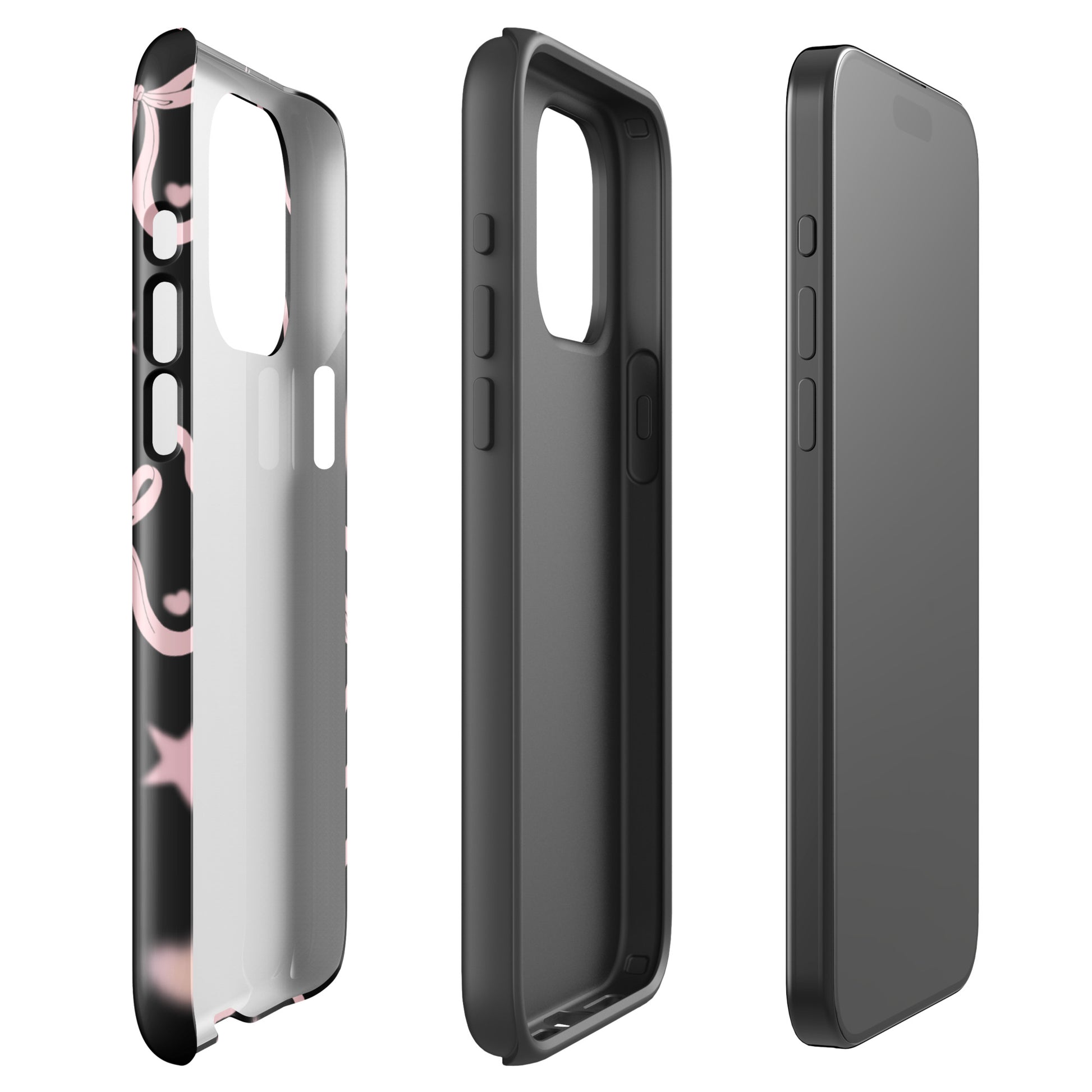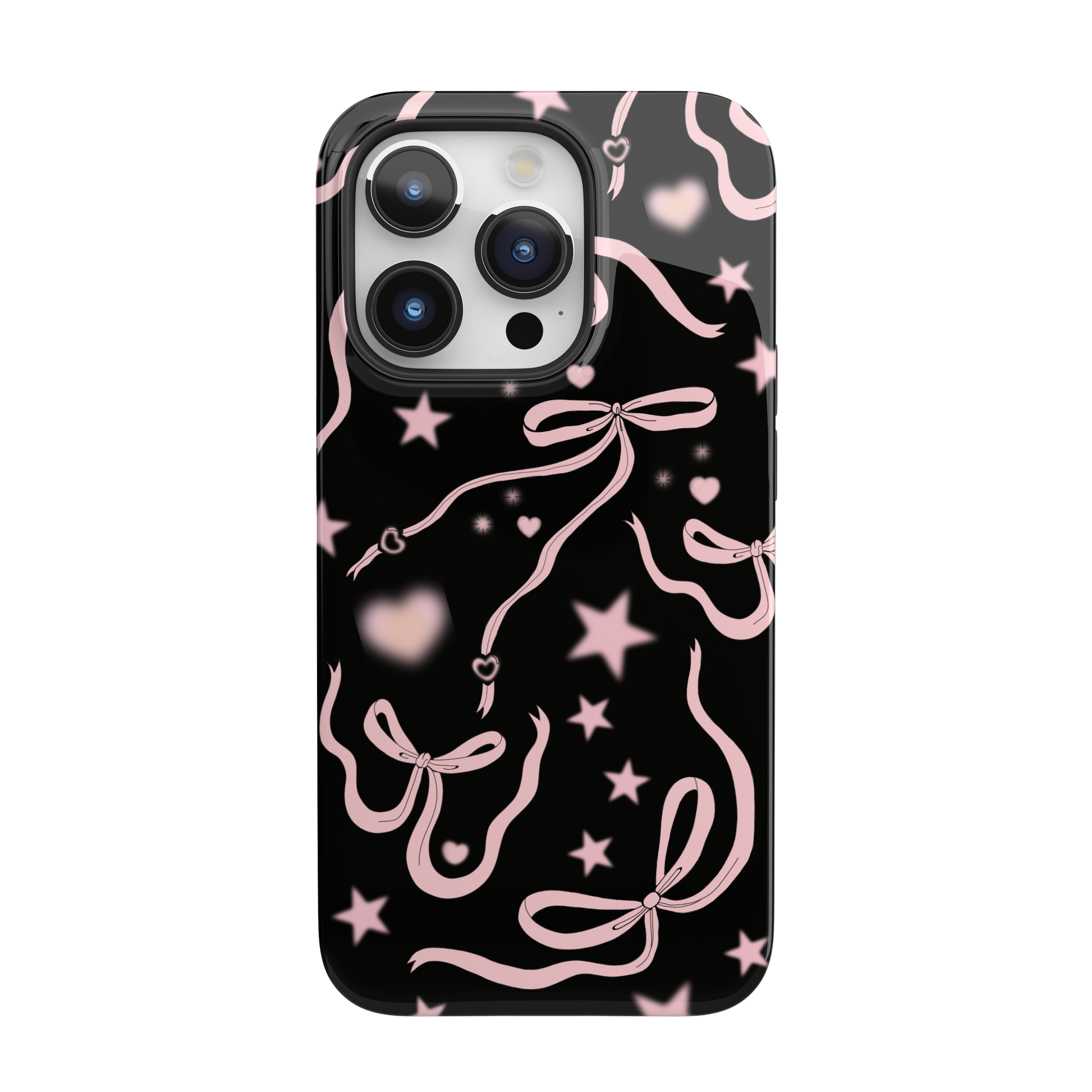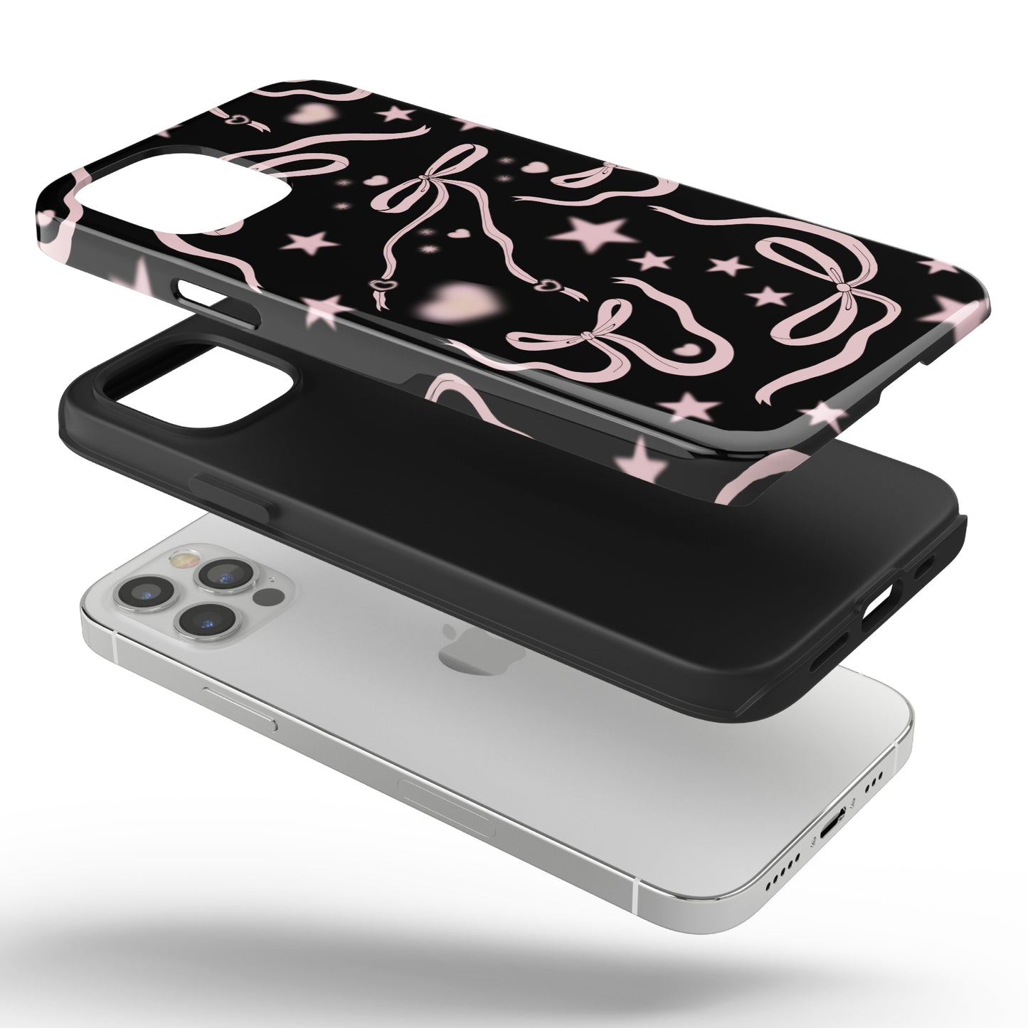 Step into a coquette-inspired Y2K dream with the Black Cosmic Bows iPhone Case! Featuring cute light pink ribbon bows and soft gradient pink stars and hearts on a sleek black background, this case brings a bold yet whimsical touch to your phone. Perfect for adding a dreamy, nostalgic vibe to your style.