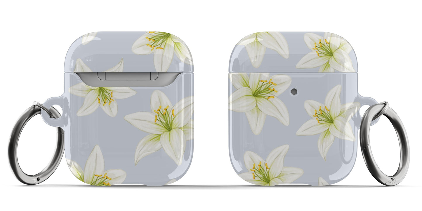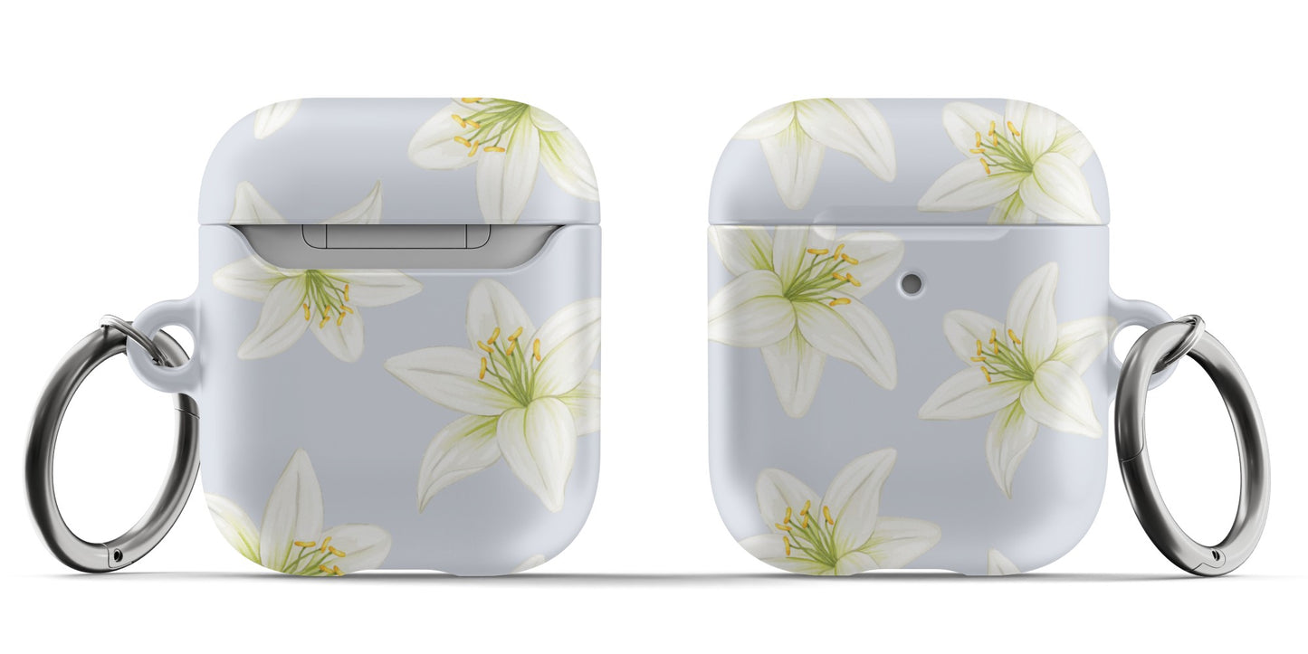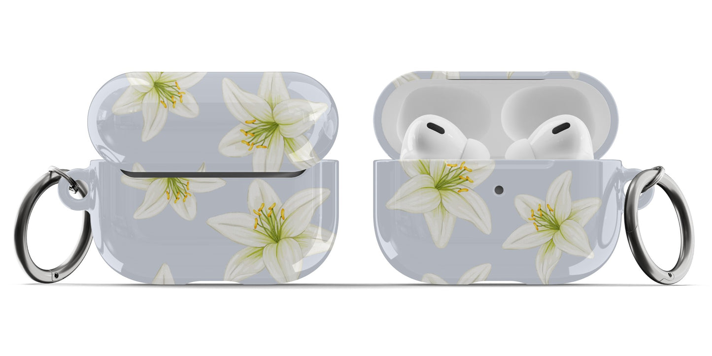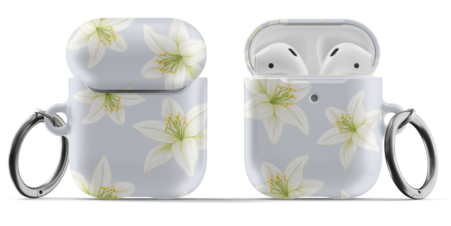 Protect your AirPods with our Blue Tiger Lily AirPods Case! This cute AirPods case features white tiger lilies on a blue background.