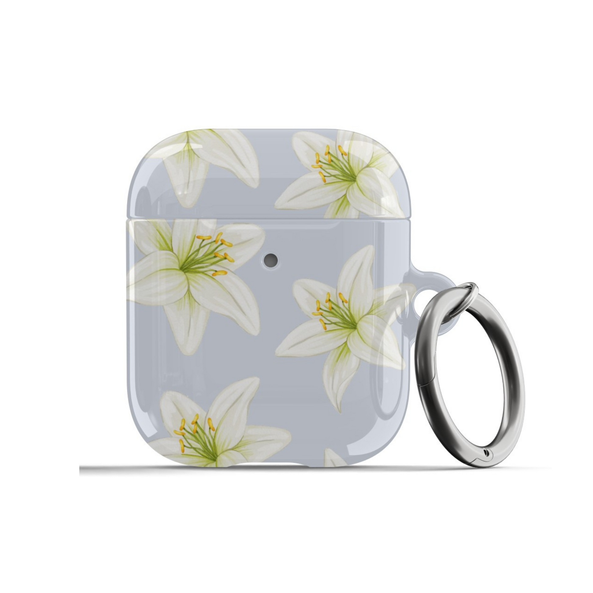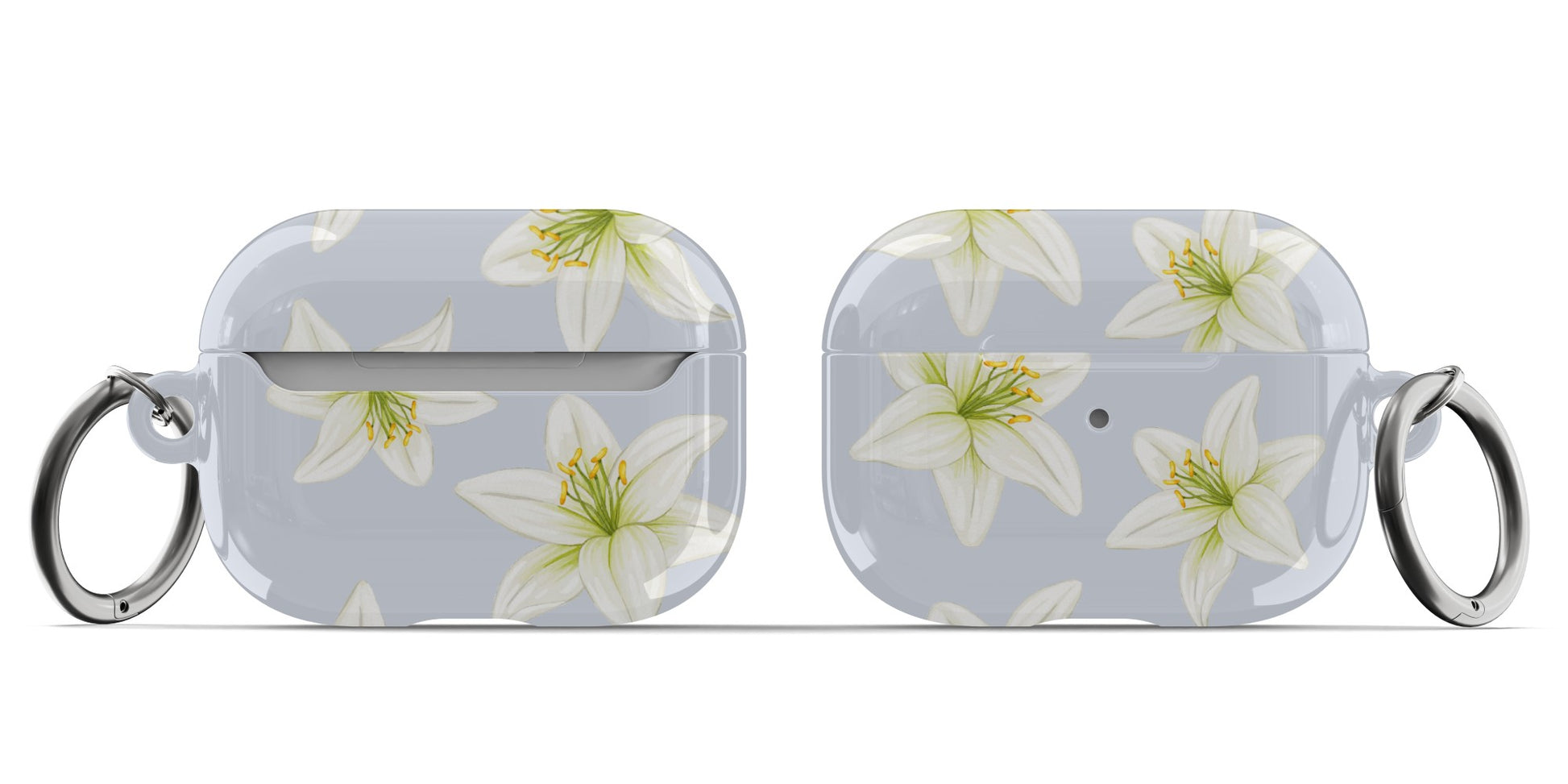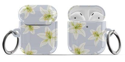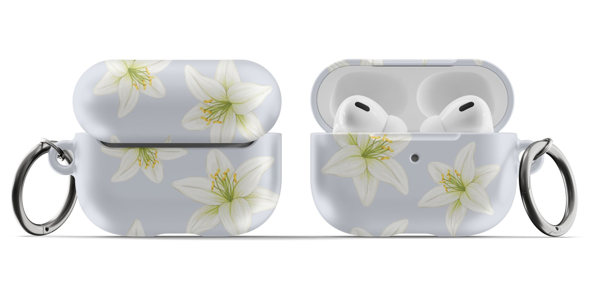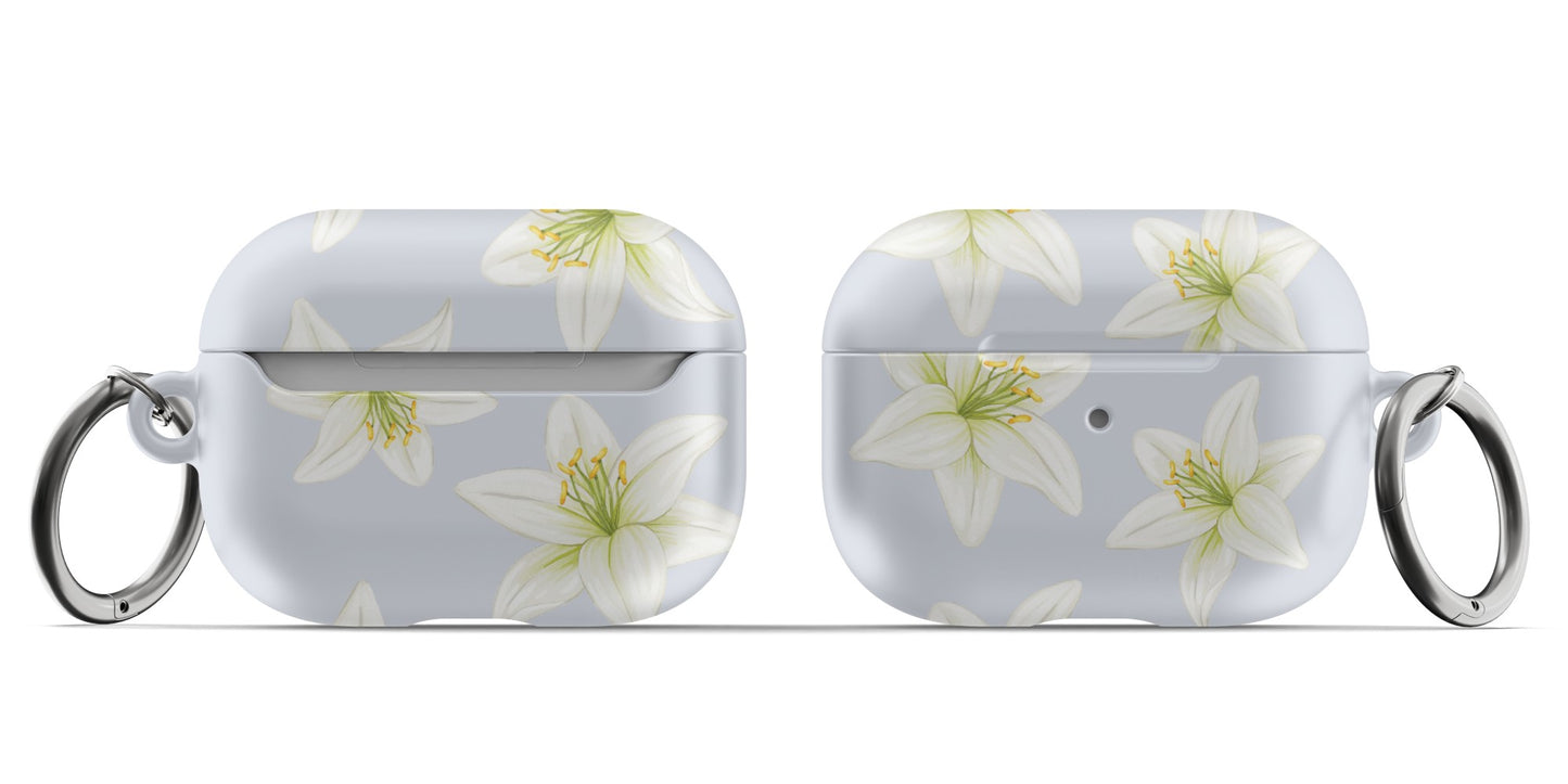 Protect your AirPods with our Blue Tiger Lily AirPods Case! This cute AirPods case features white tiger lilies on a blue background.
