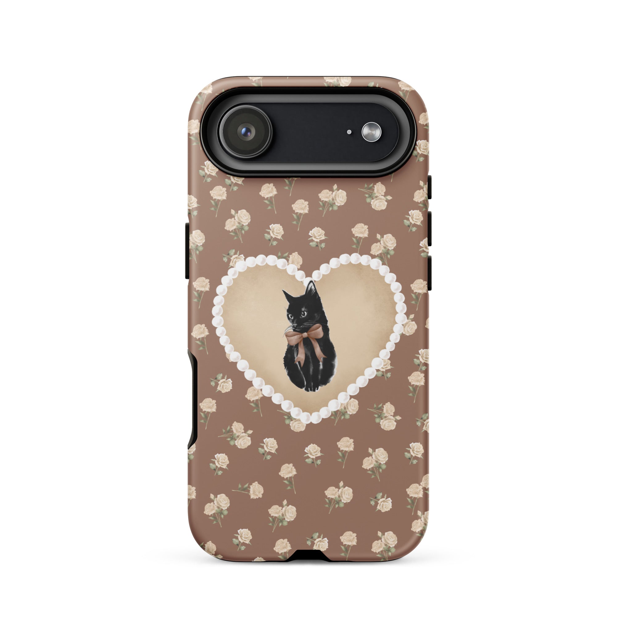 Embrace the brown coquette charm of the Brown Féline Roses iPhone Case! Featuring an adorable black cat with a brown bow, a light brown heart outlined in pearls, and vintage beige roses on a warm brown background, this case brings a cozy, coquette vibe to your phone.