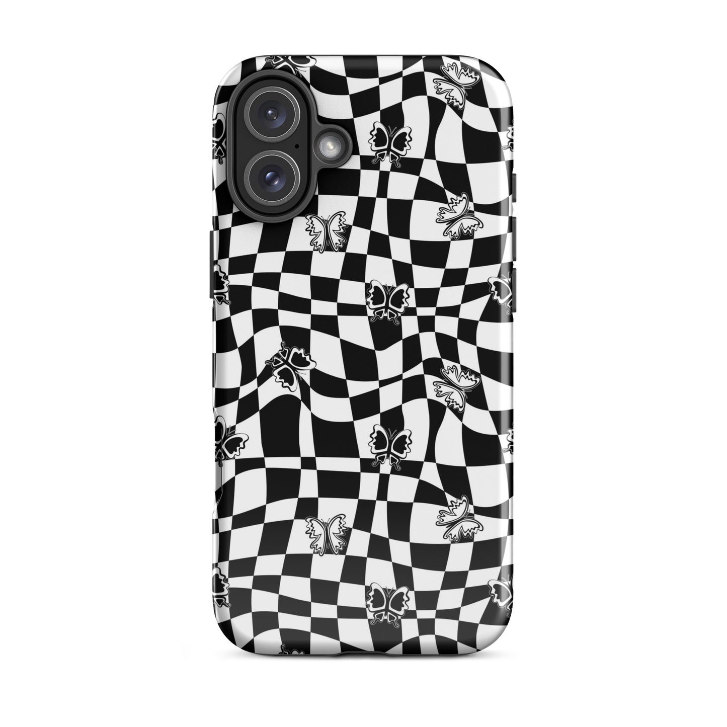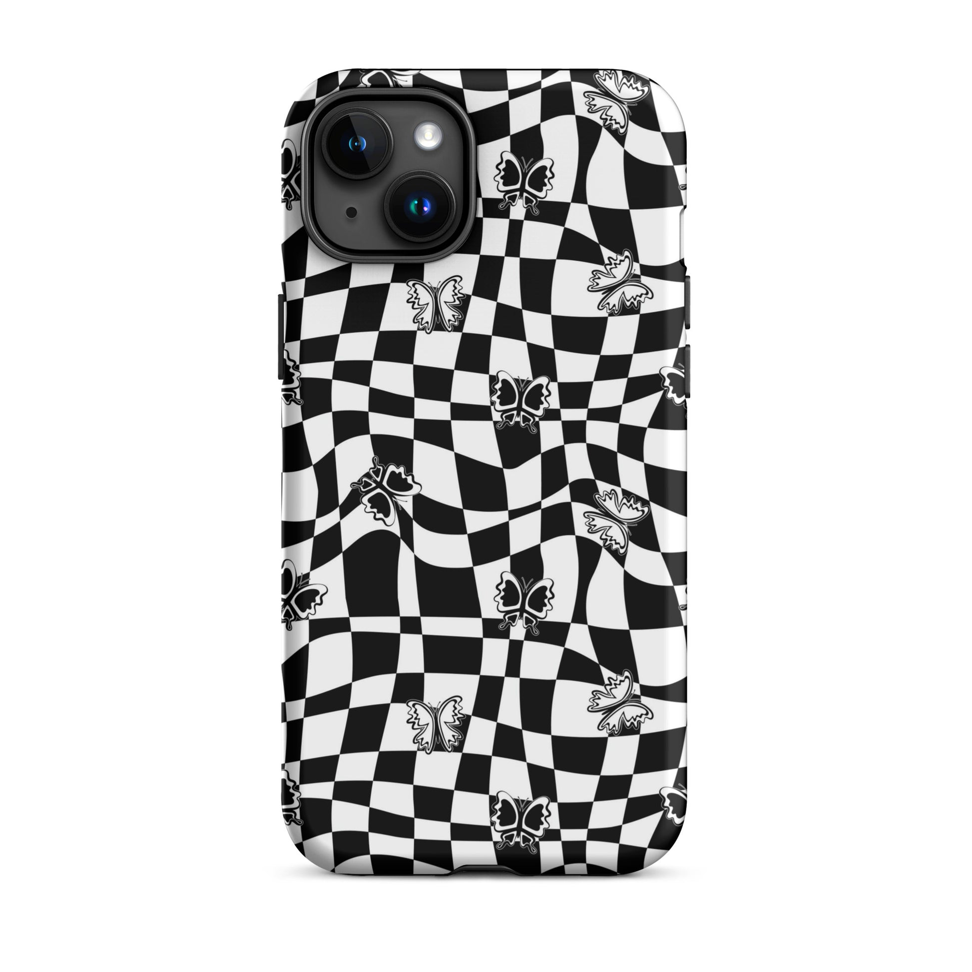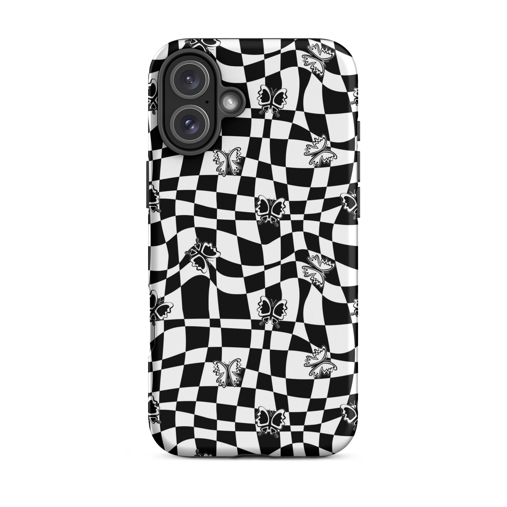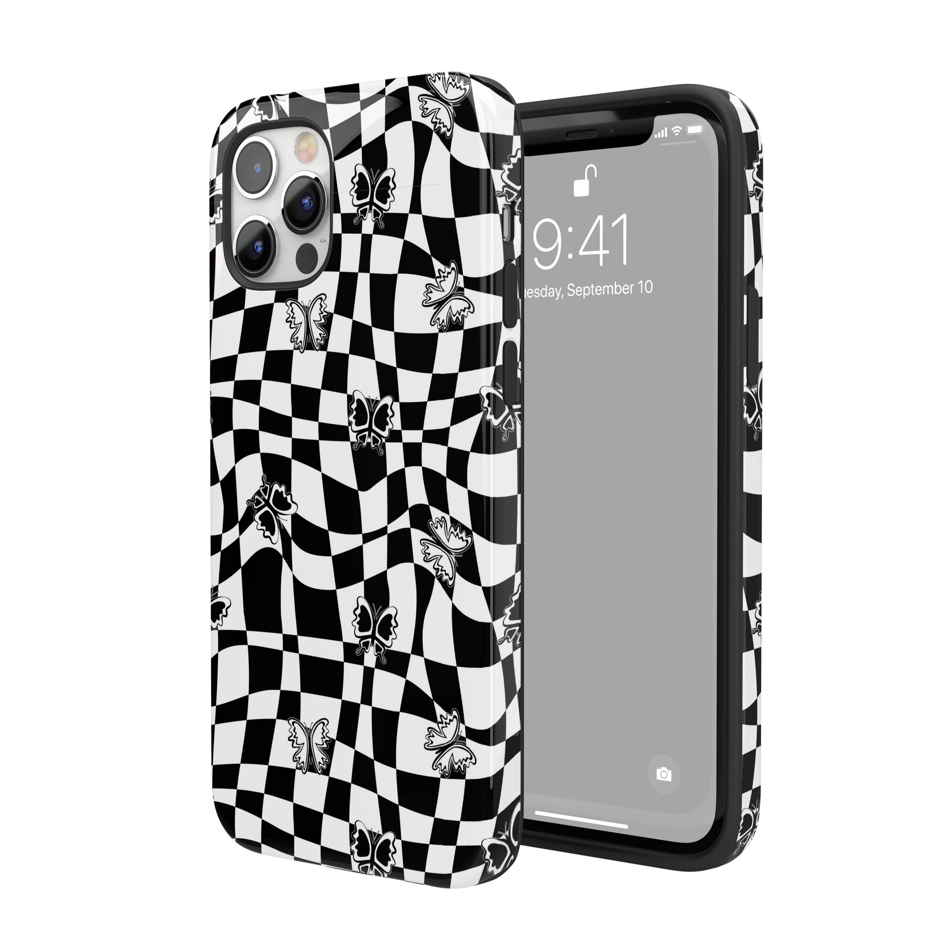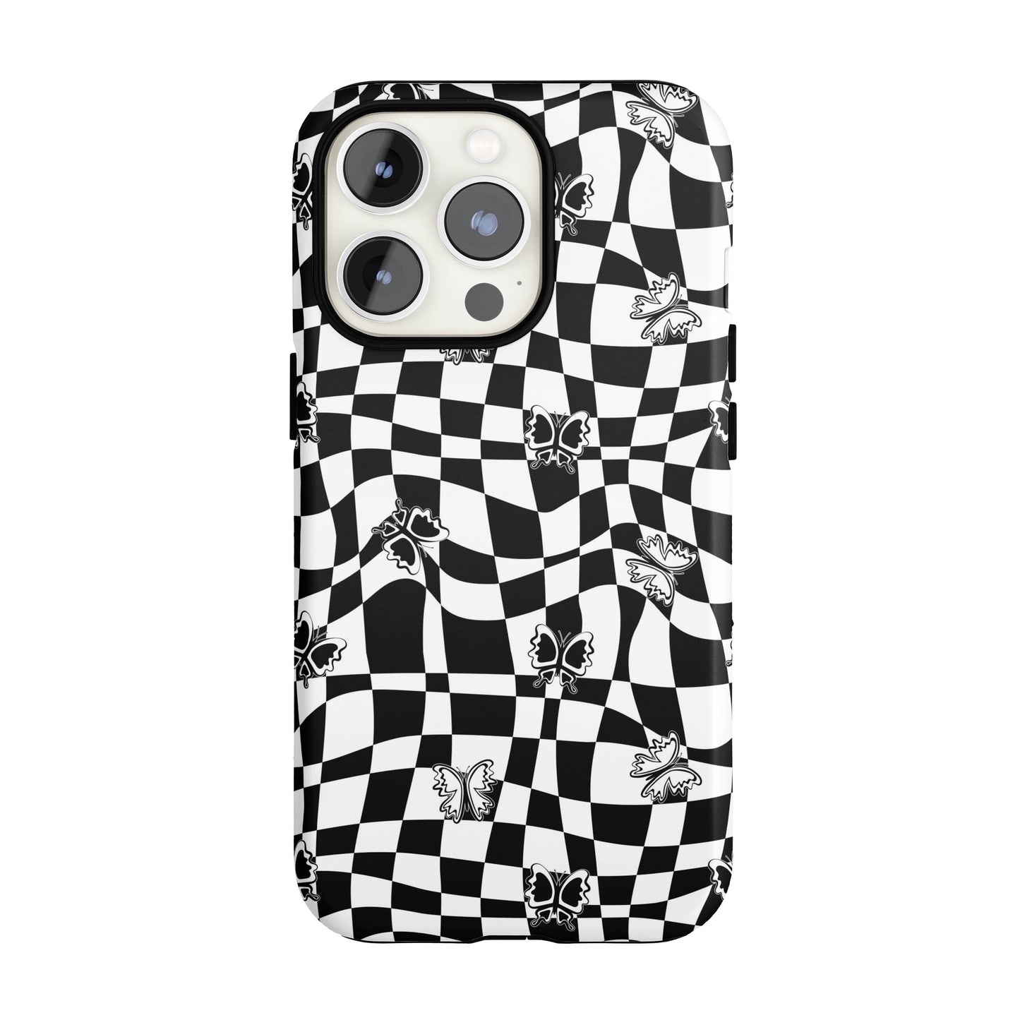 Fancy adding some flutter to your phone? This cute case features retro white and black butterflies on a wavy black and white checkered design.