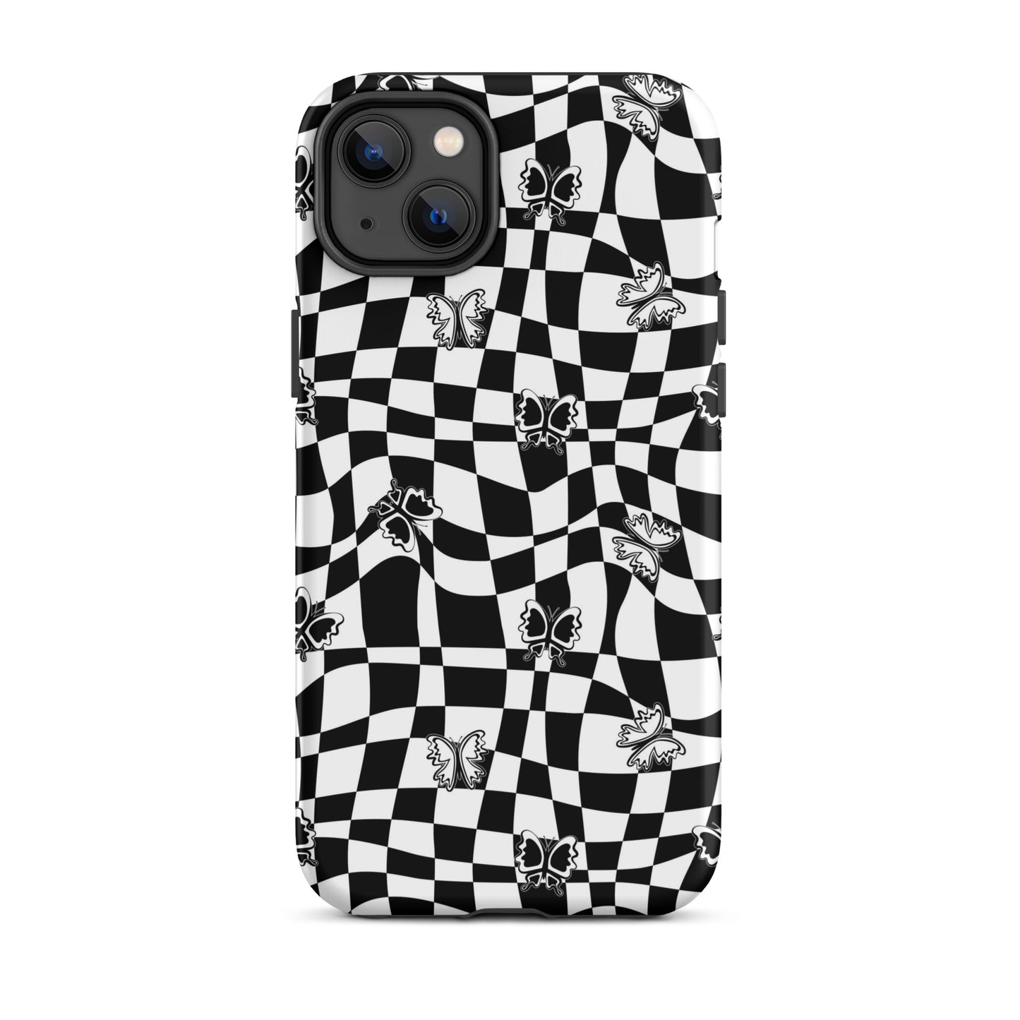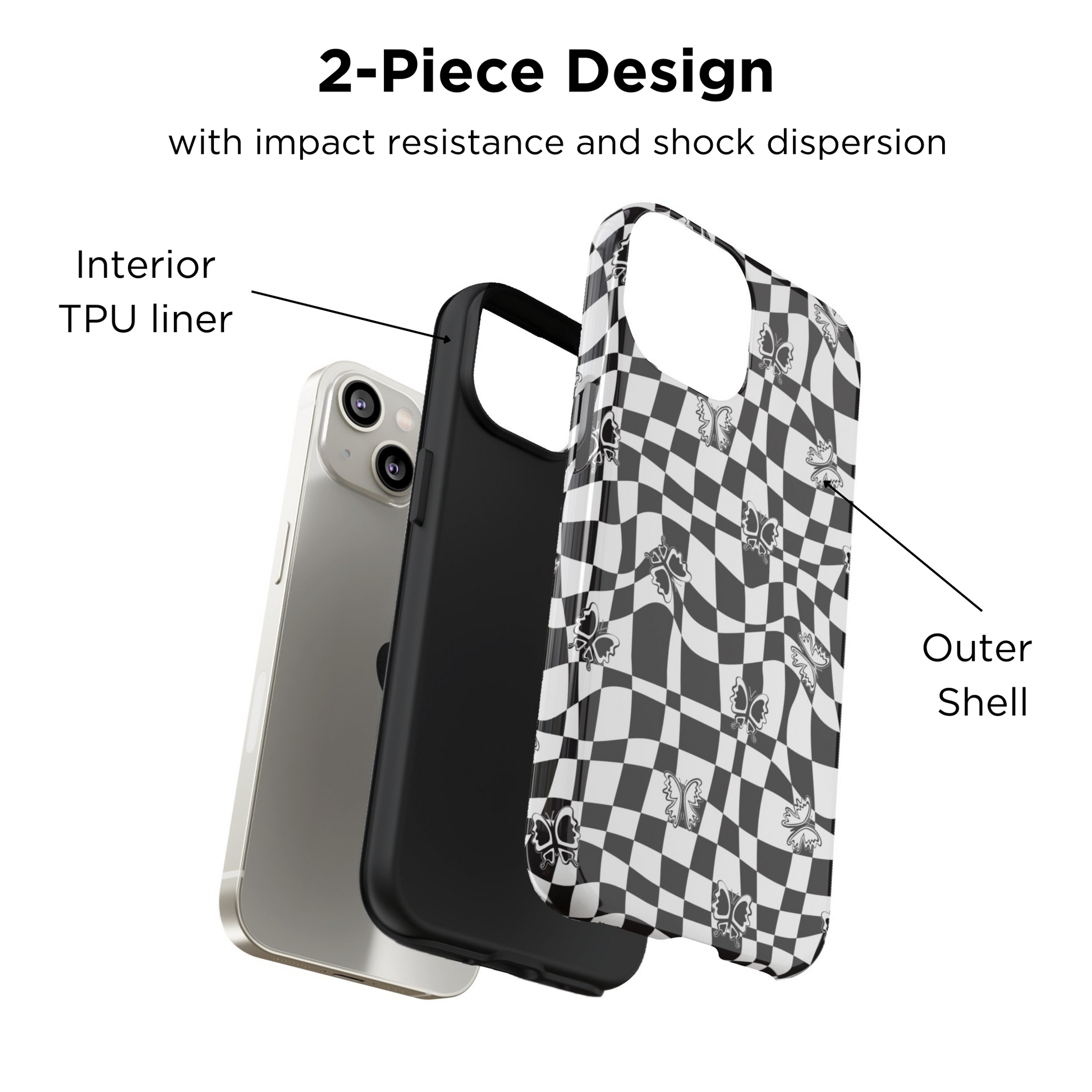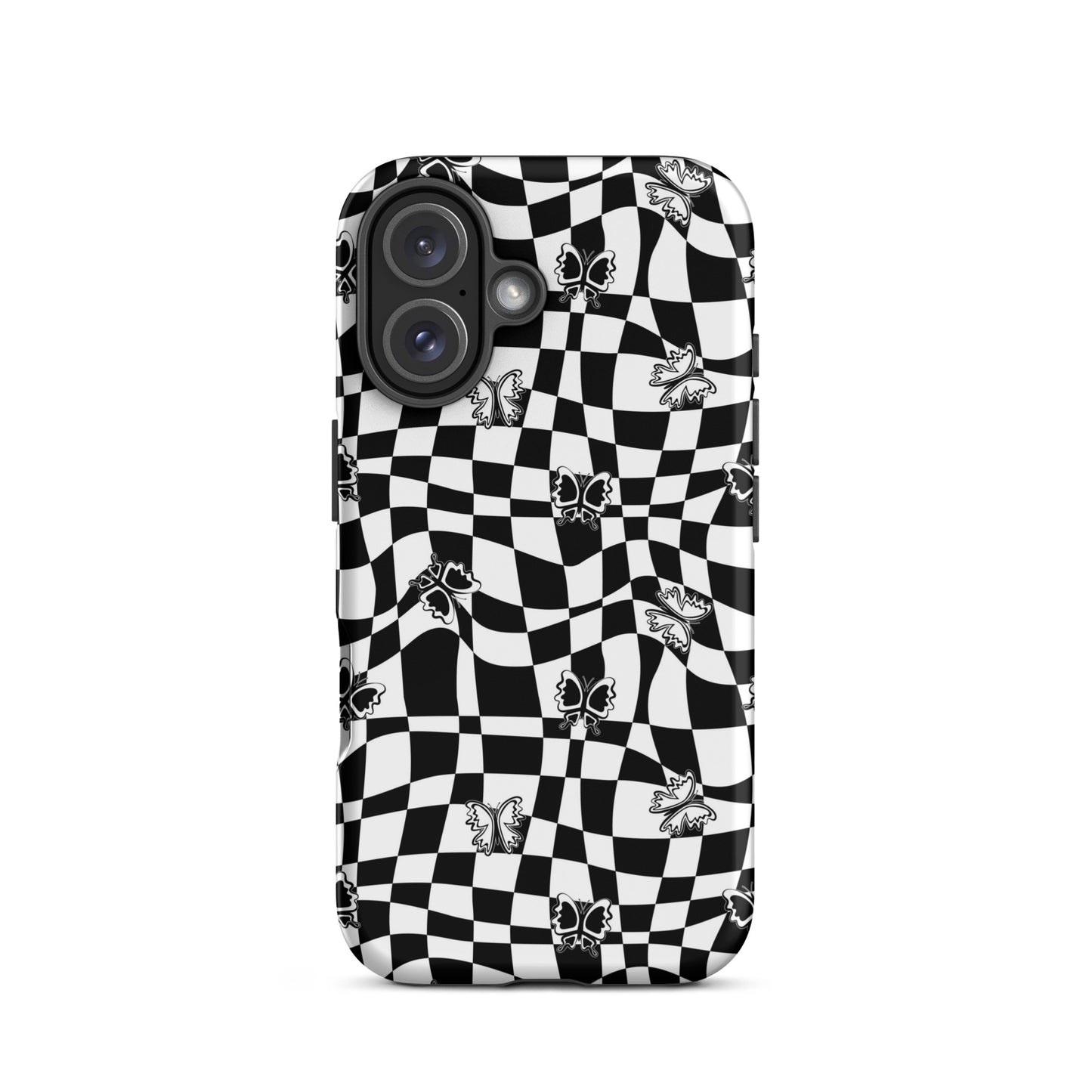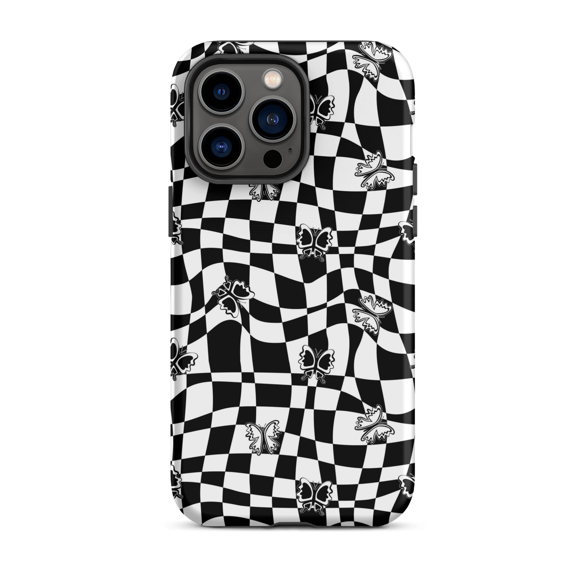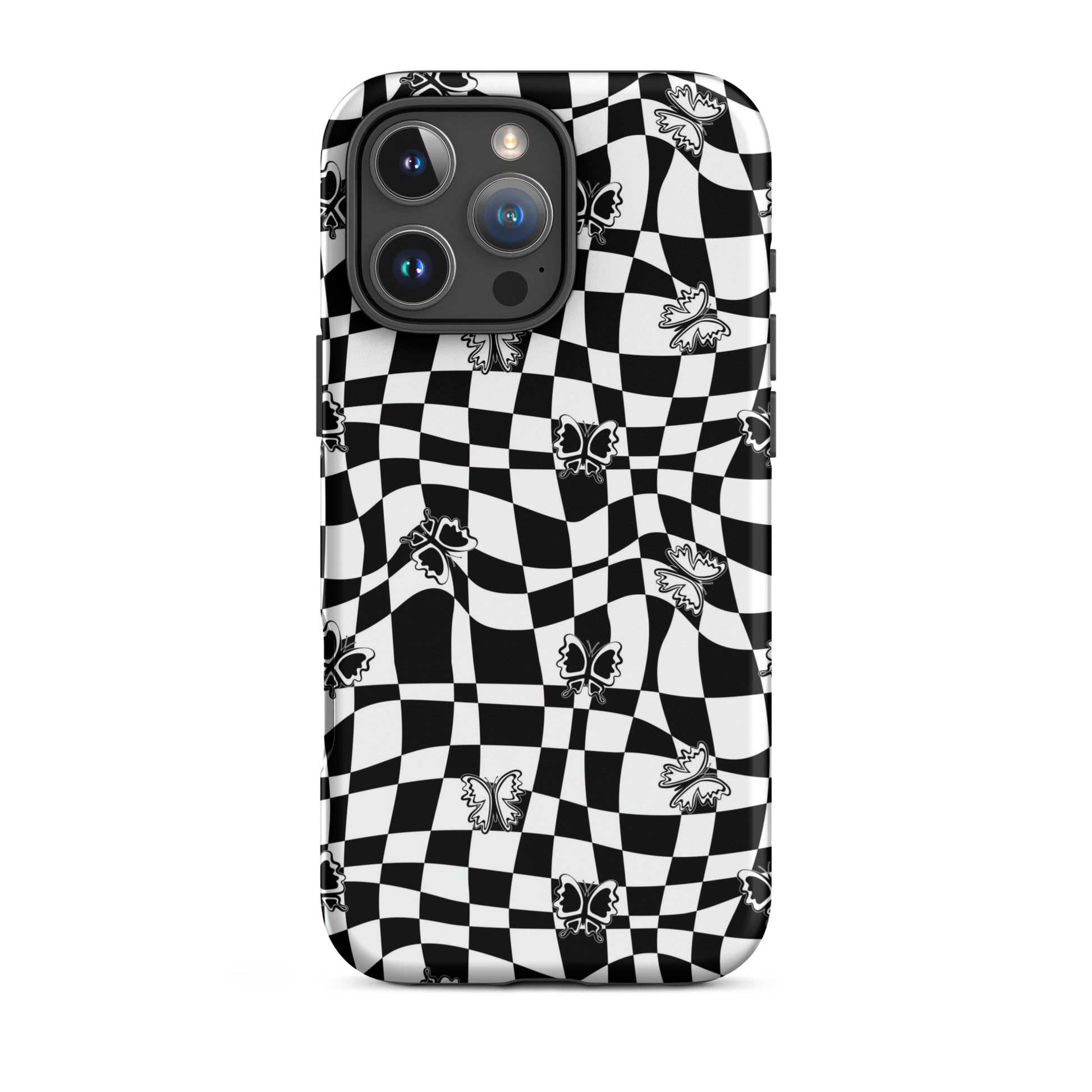 Fancy adding some flutter to your phone? This cute case features retro white and black butterflies on a wavy black and white checkered design.