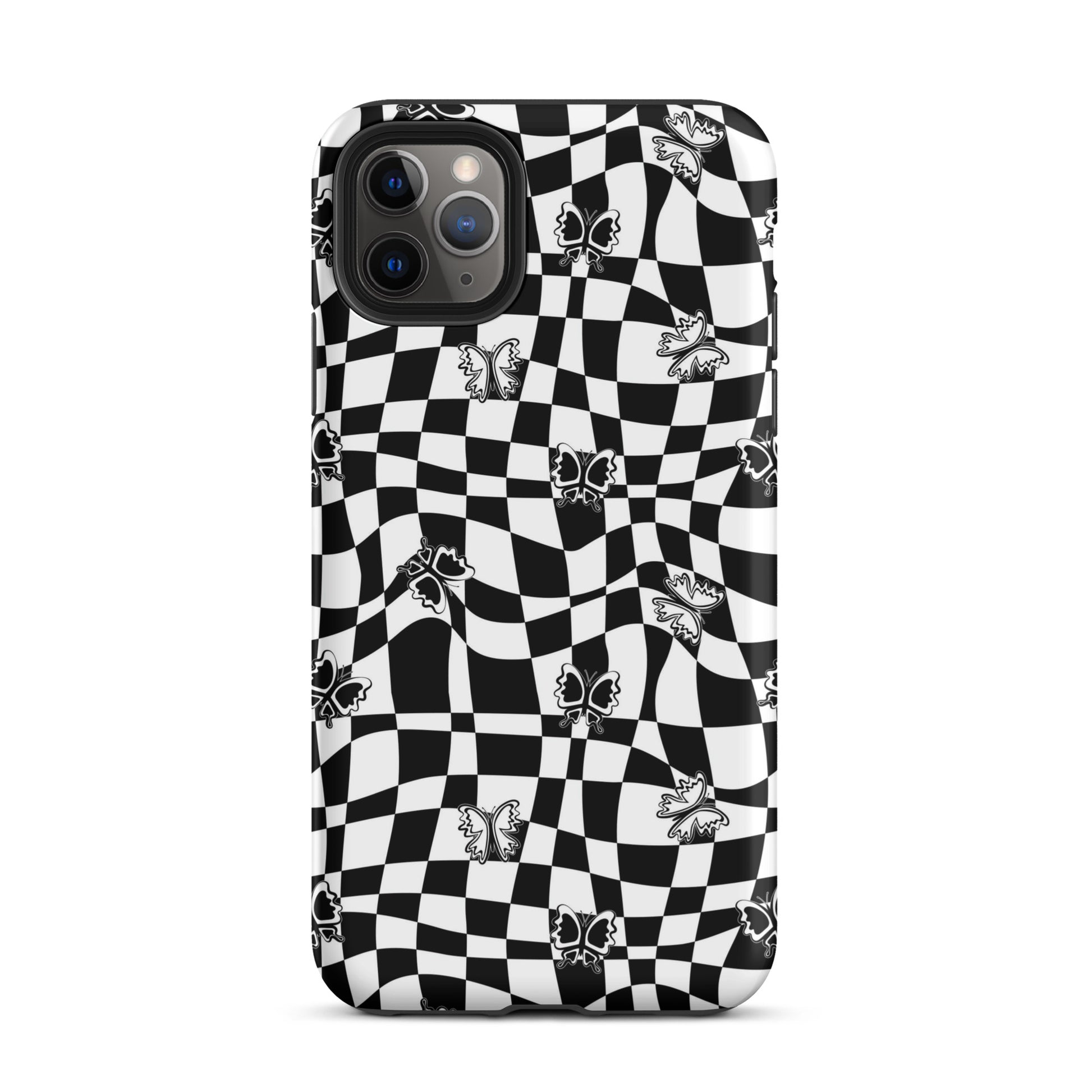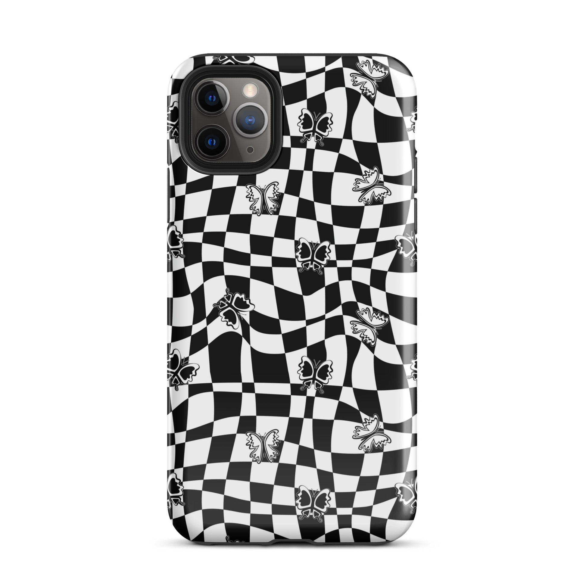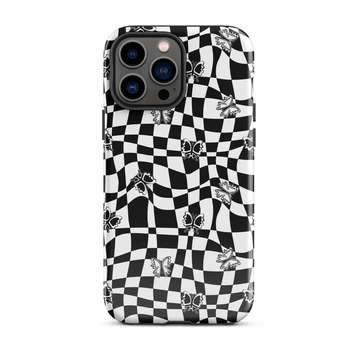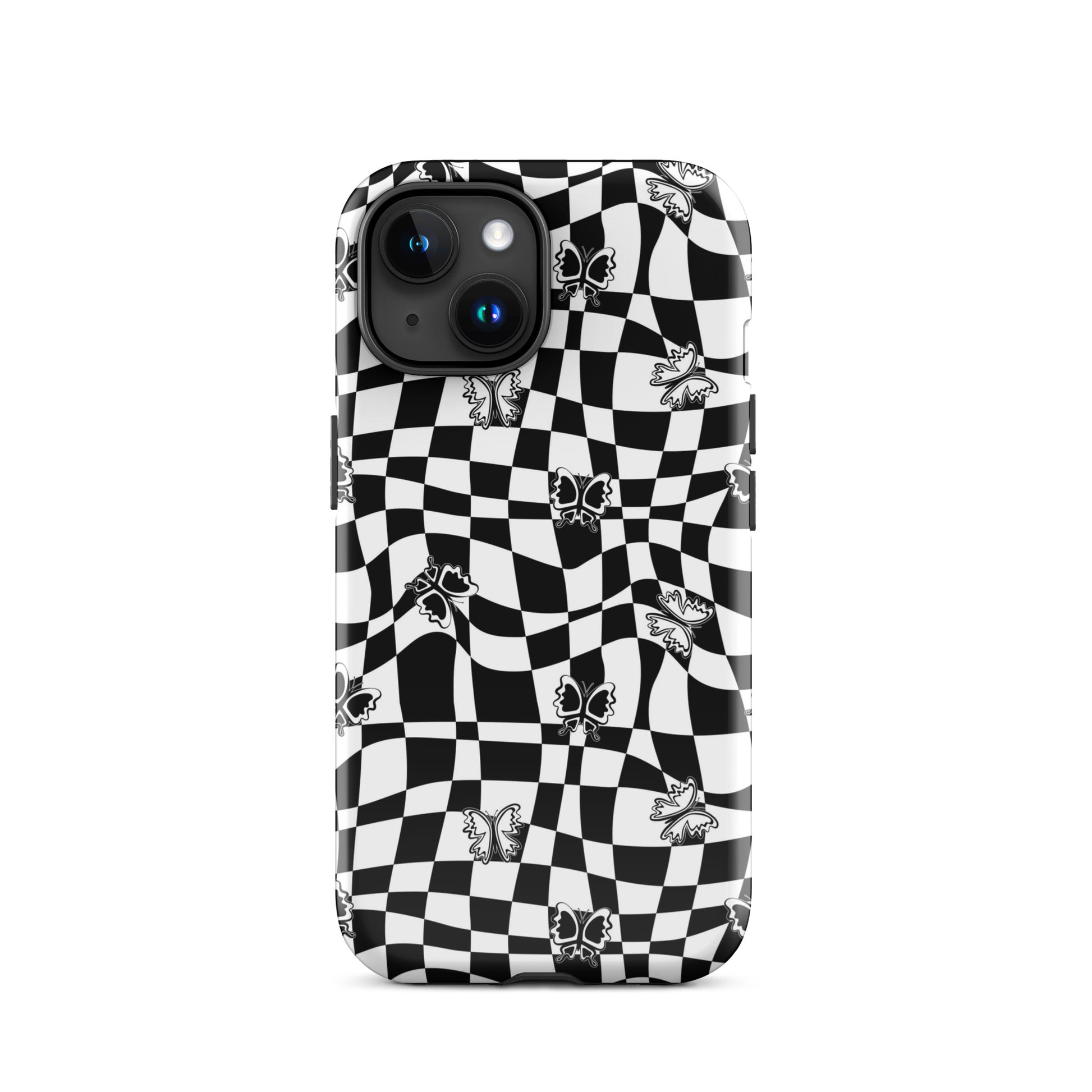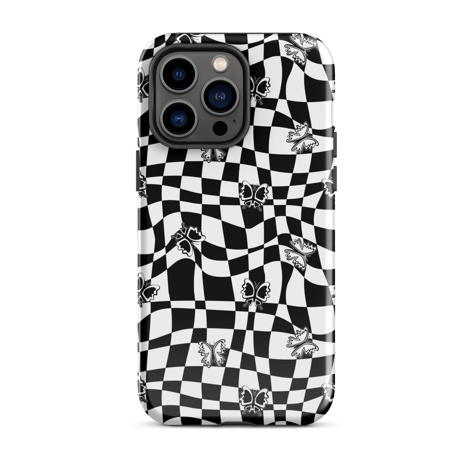 Fancy adding some flutter to your phone? This cute case features retro white and black butterflies on a wavy black and white checkered design.