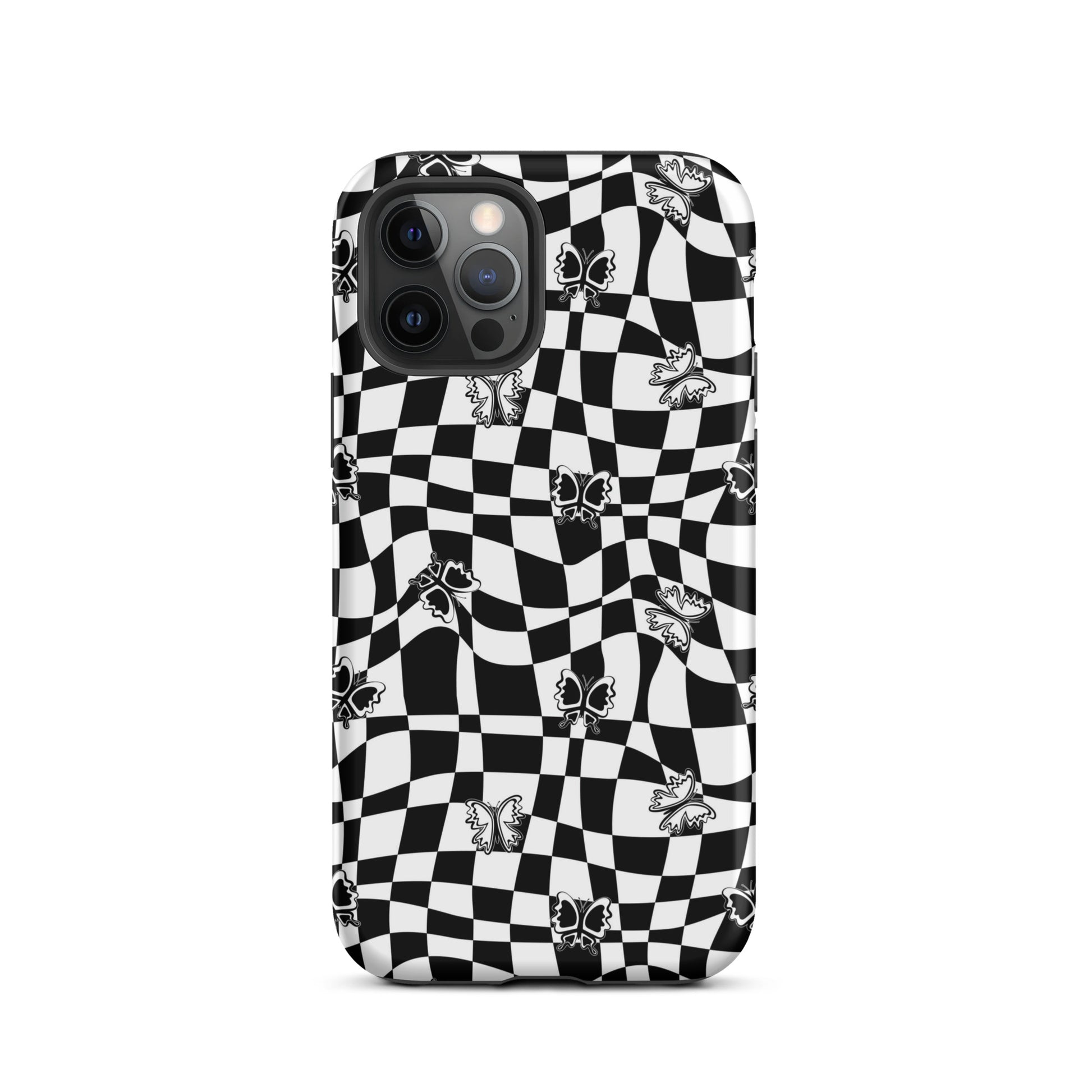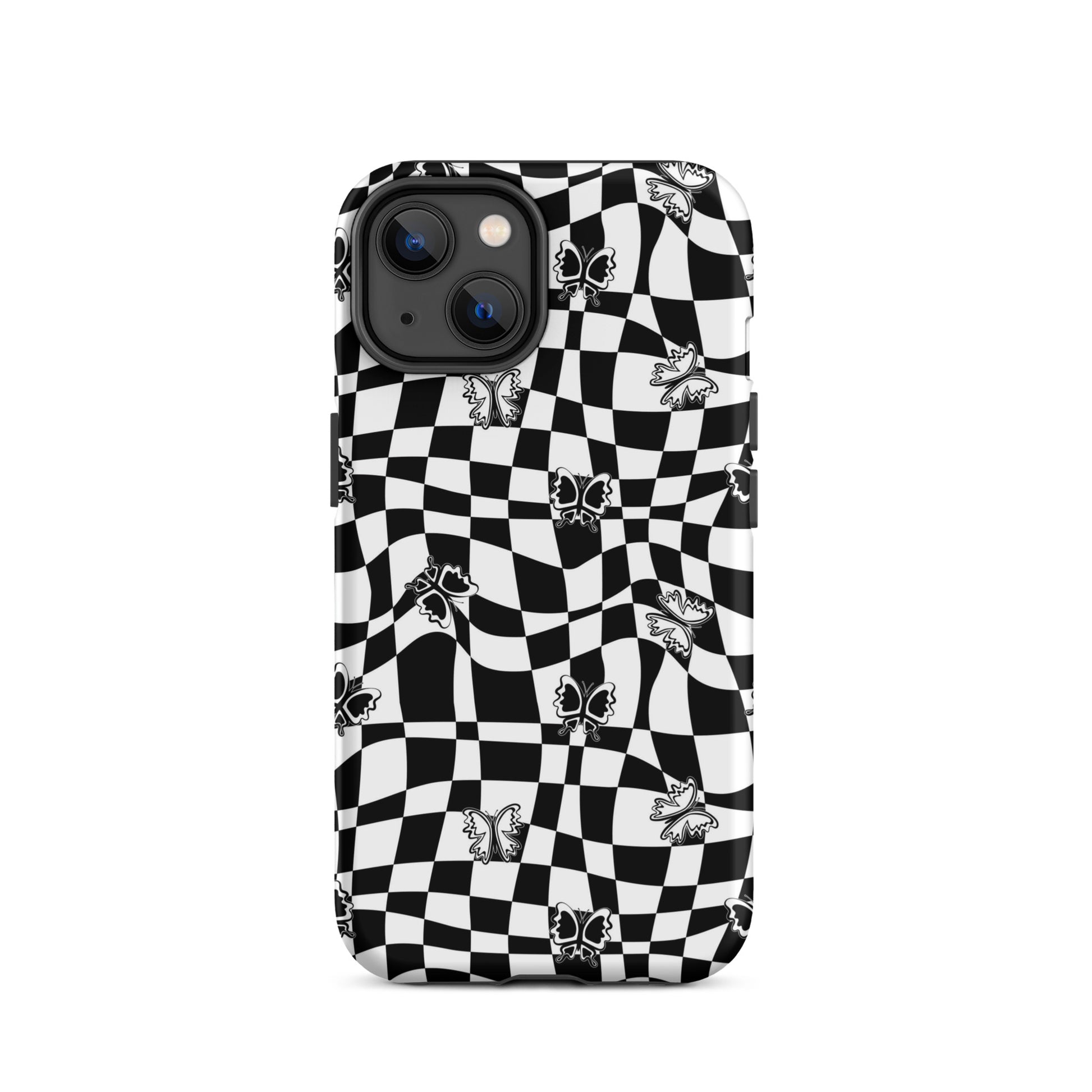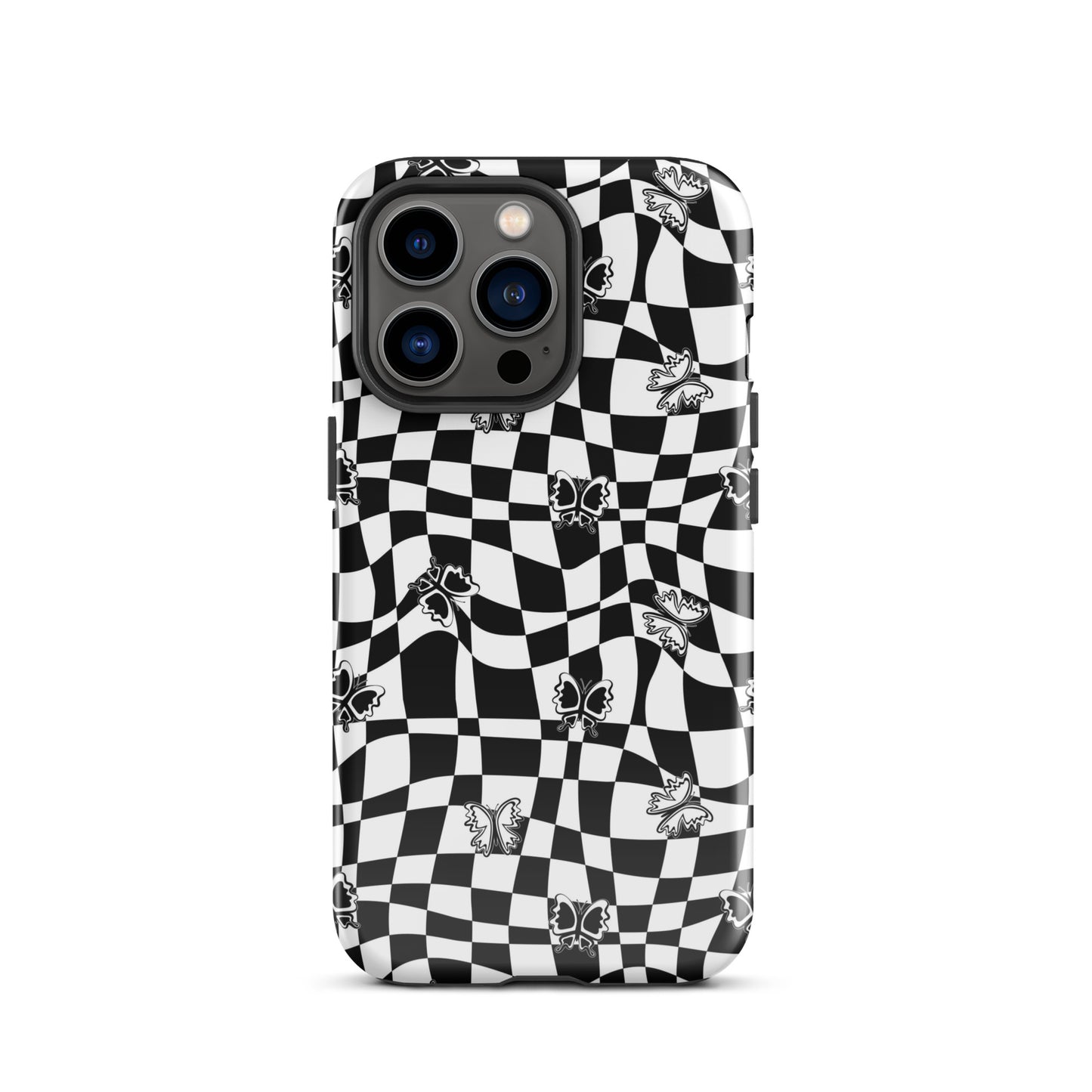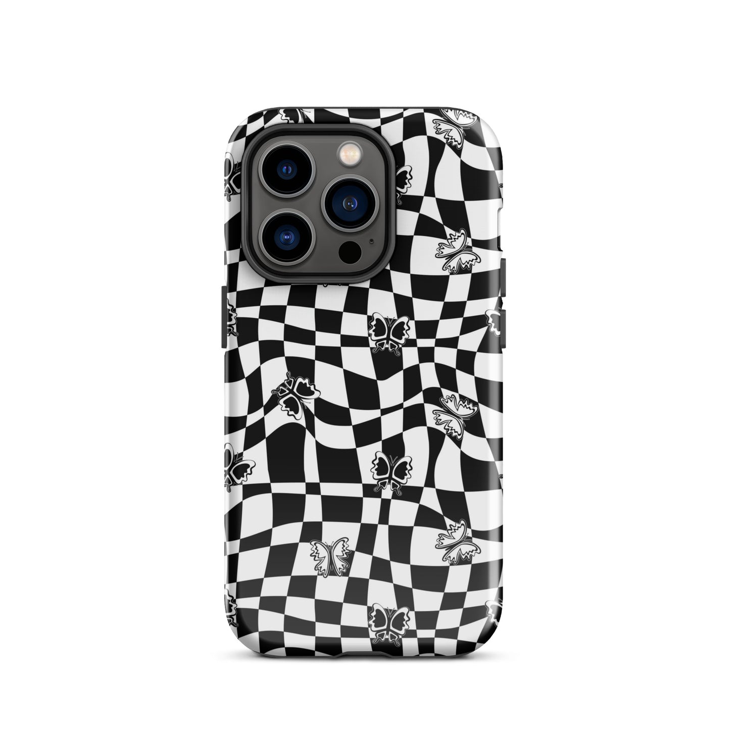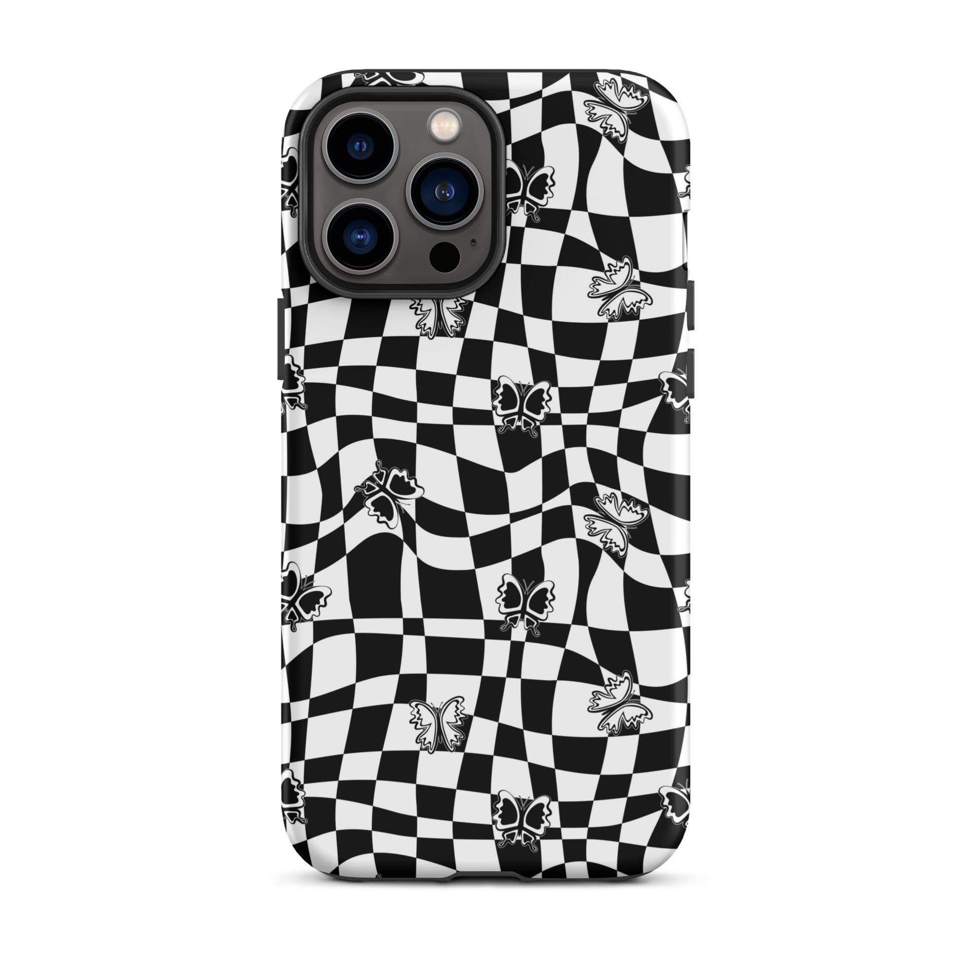 Fancy adding some flutter to your phone? This cute case features retro white and black butterflies on a wavy black and white checkered design.