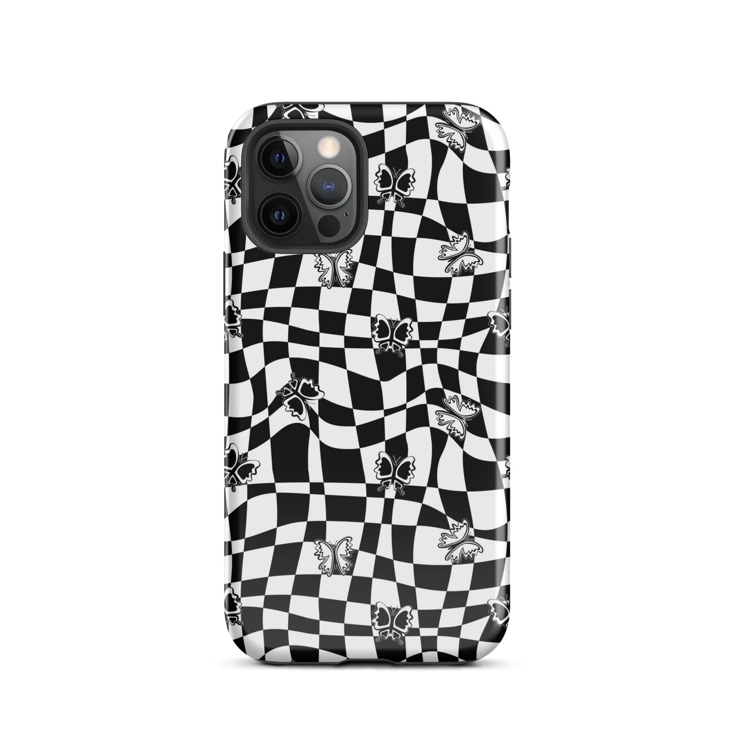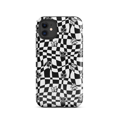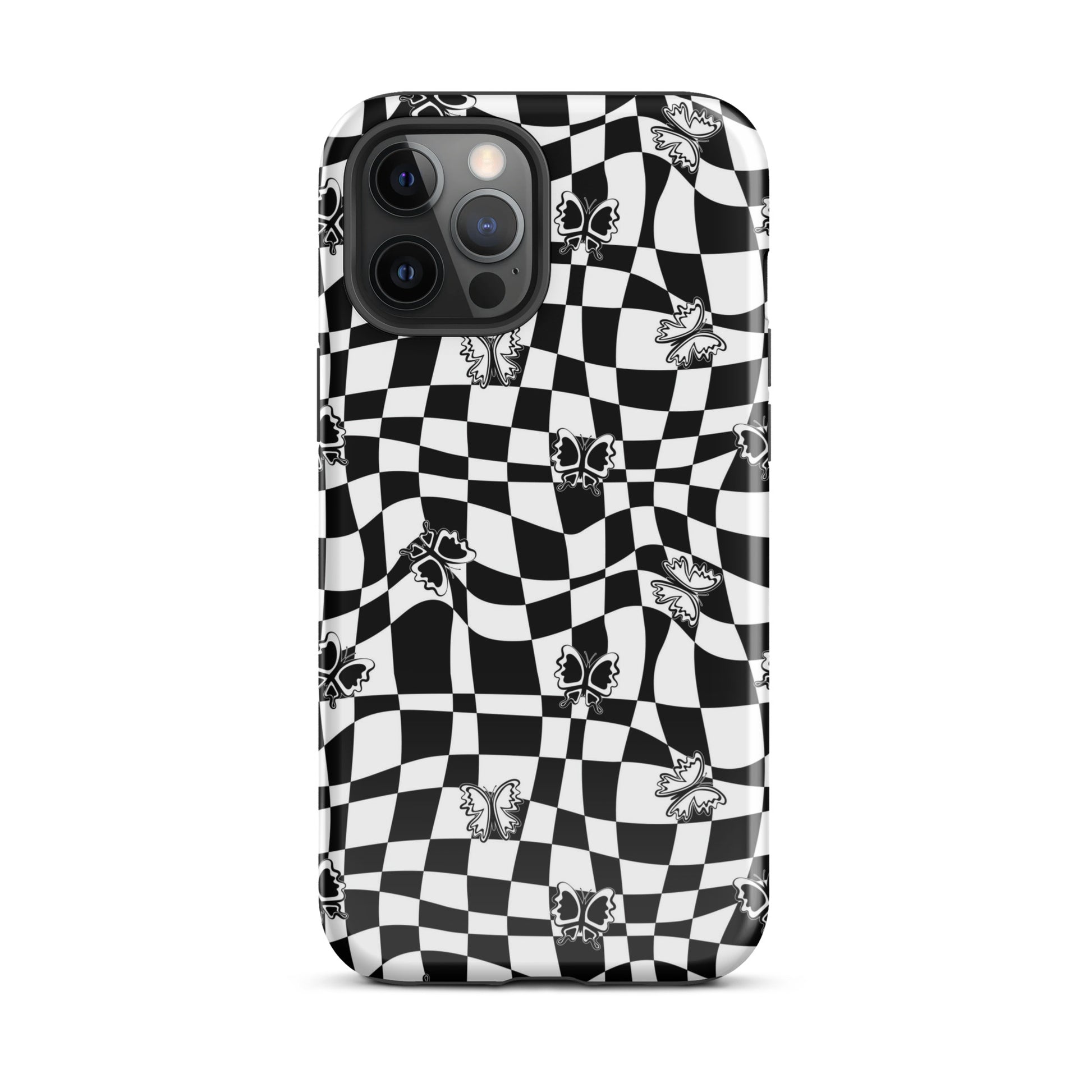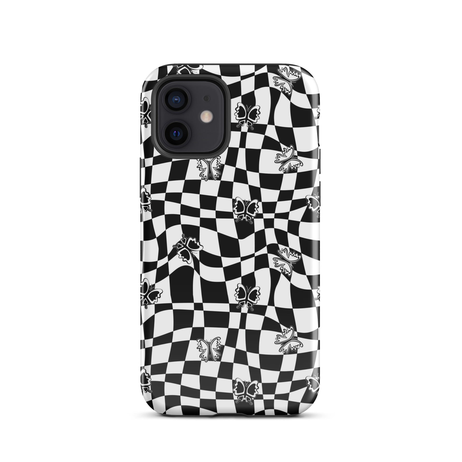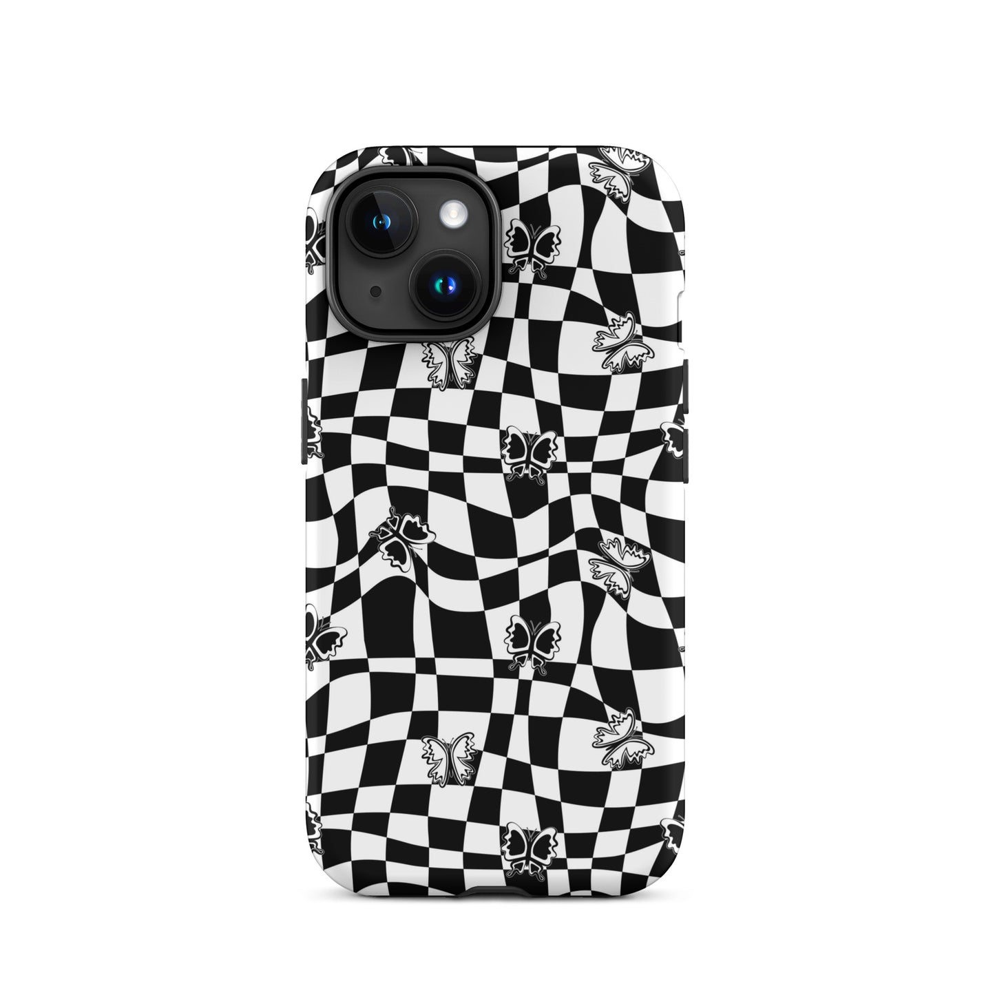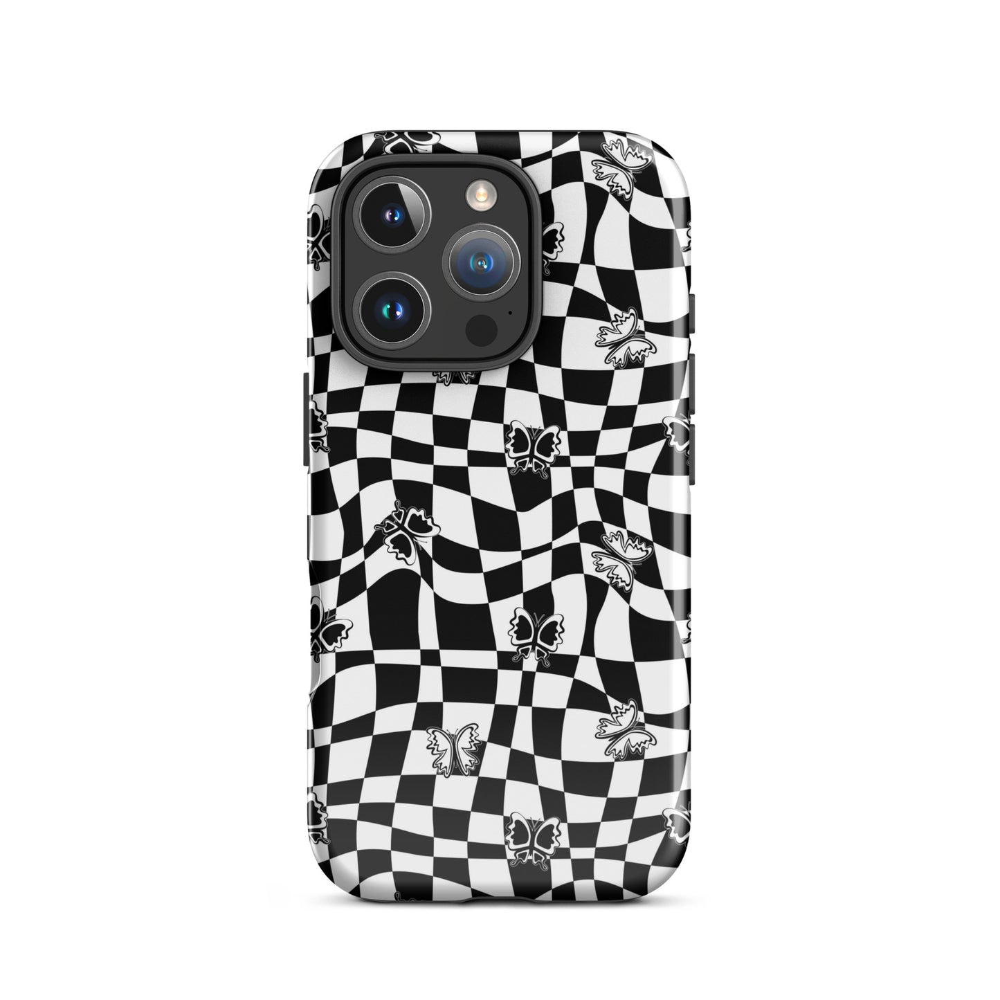 Fancy adding some flutter to your phone? This cute case features retro white and black butterflies on a wavy black and white checkered design.