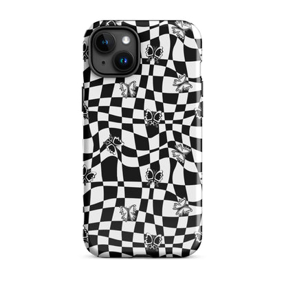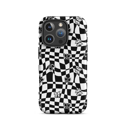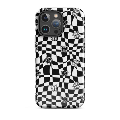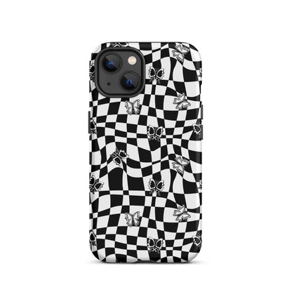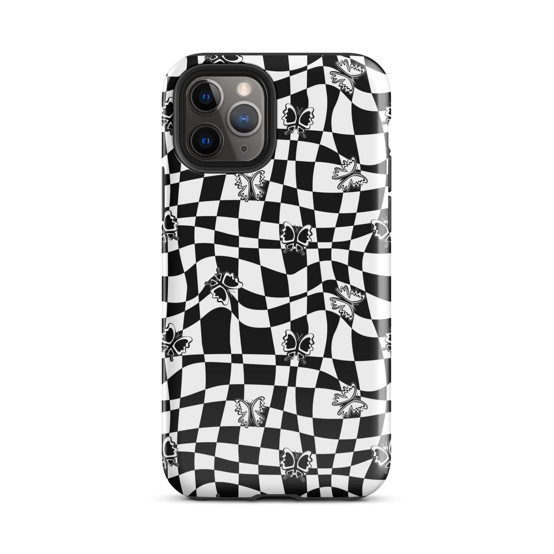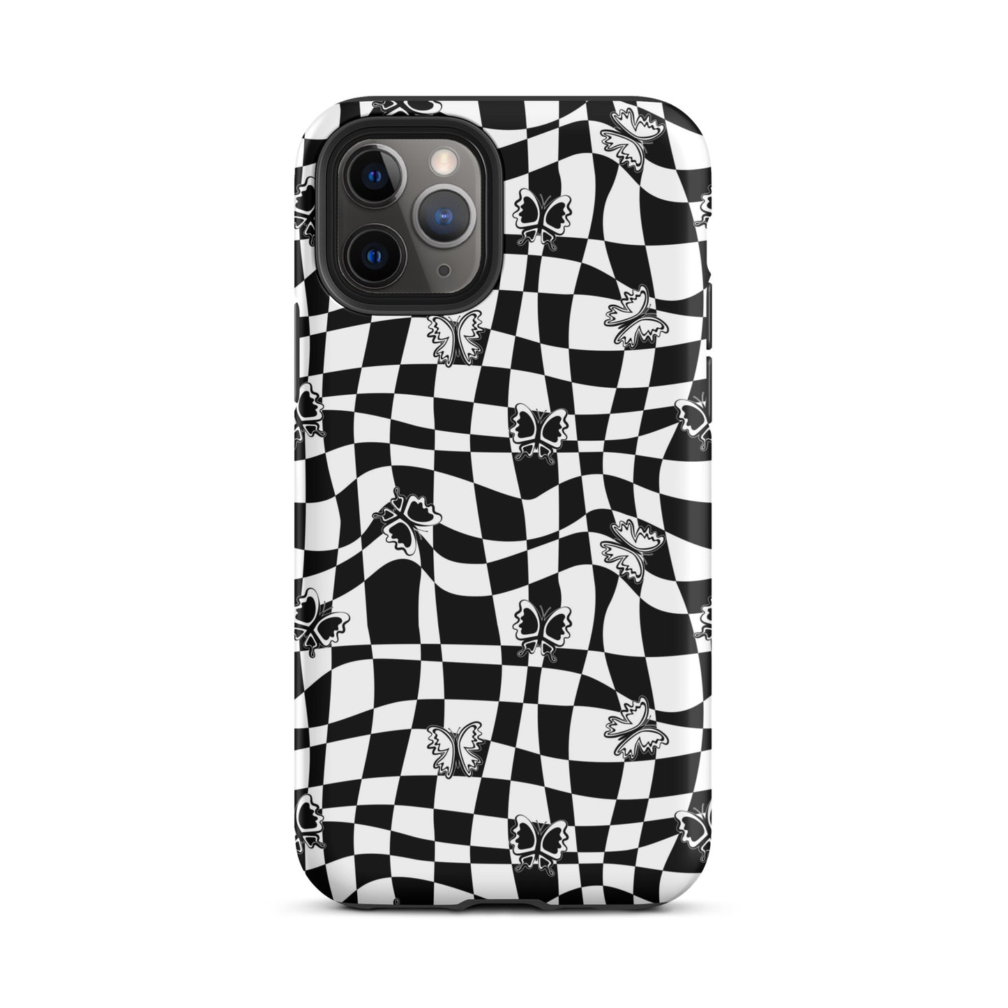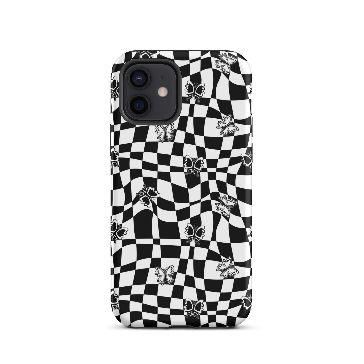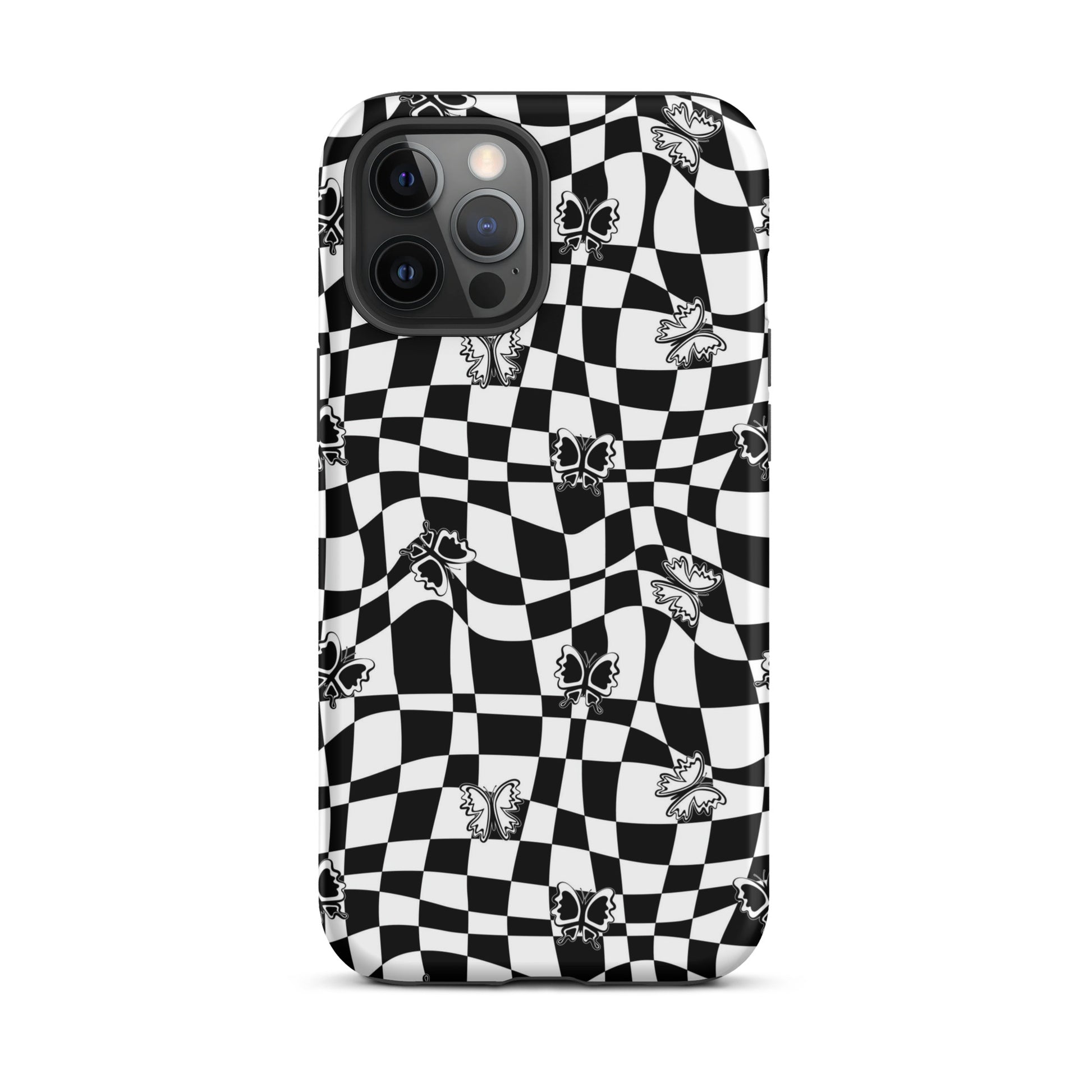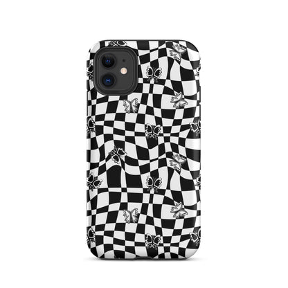 Fancy adding some flutter to your phone? This cute case features retro white and black butterflies on a wavy black and white checkered design.