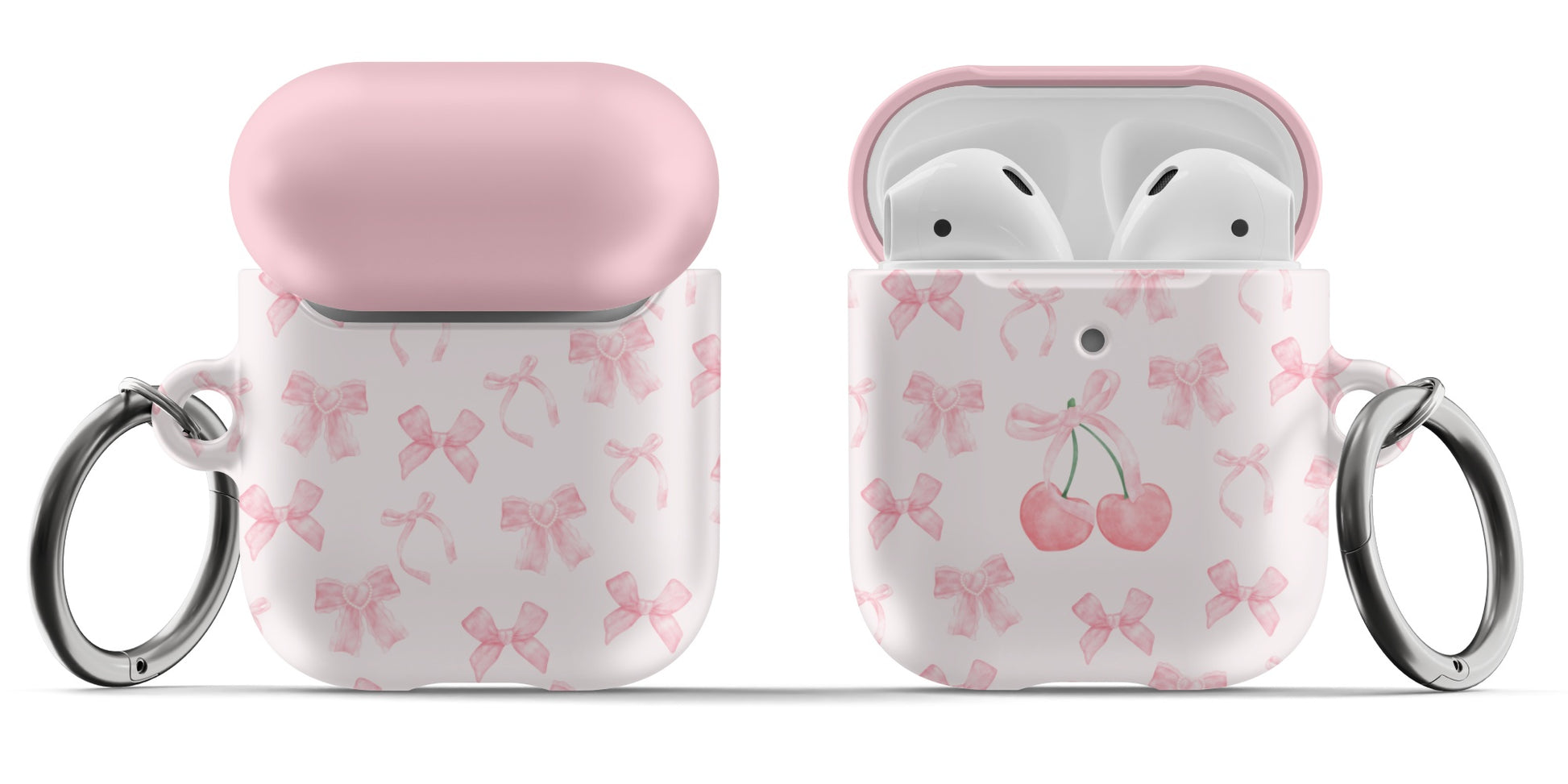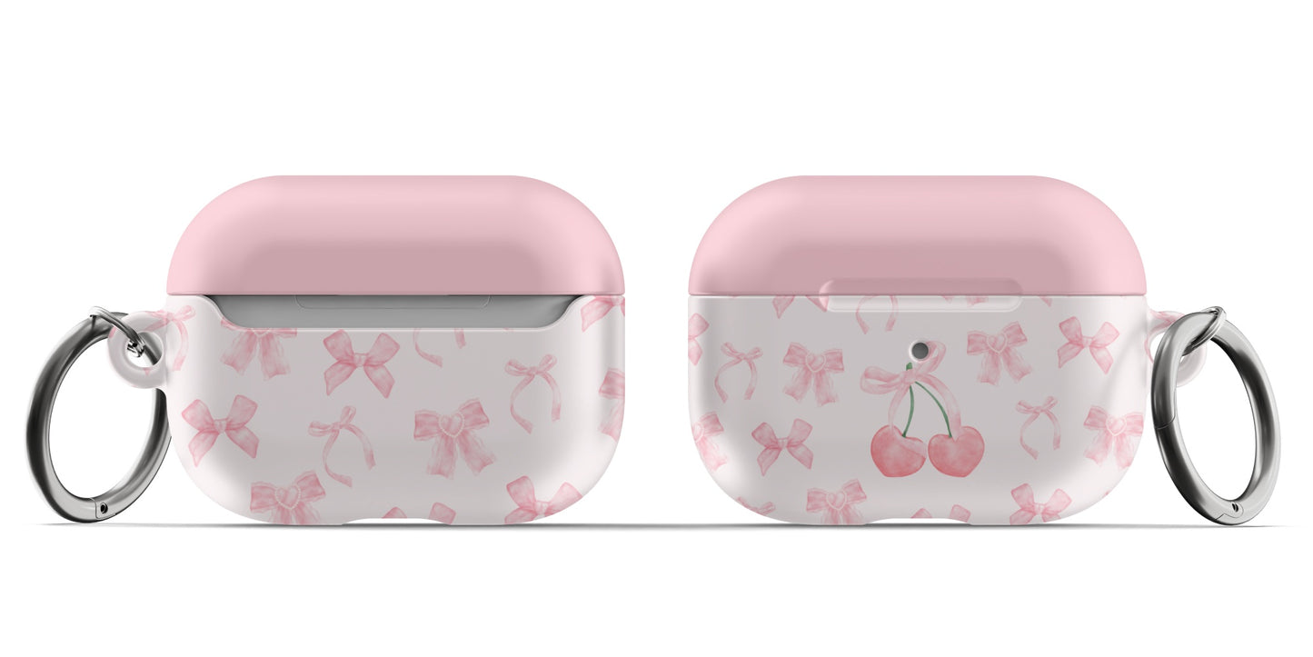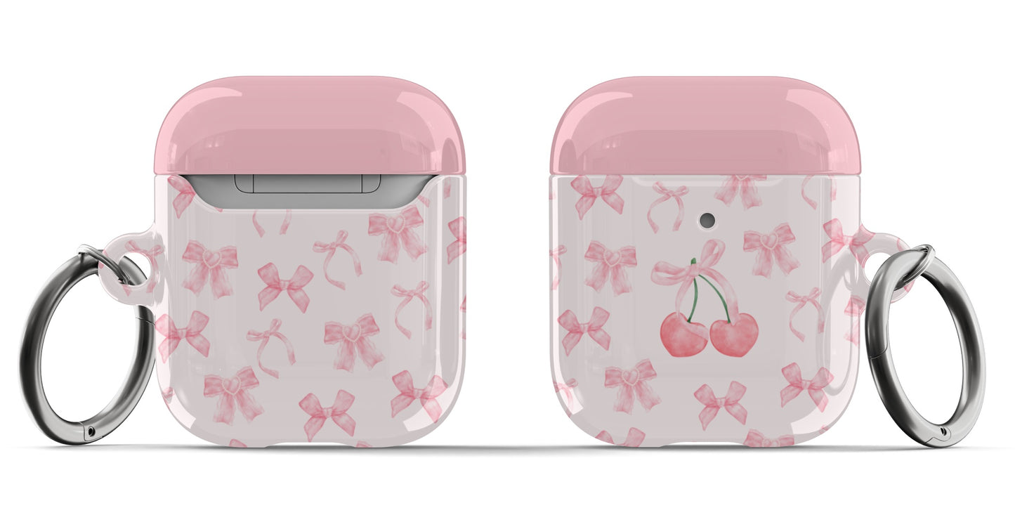 Protect your AirPods with our Cherry Pink Bows AirPods Case! This cute AirPods case features cute light pink bows and red cherries on a light pink background.