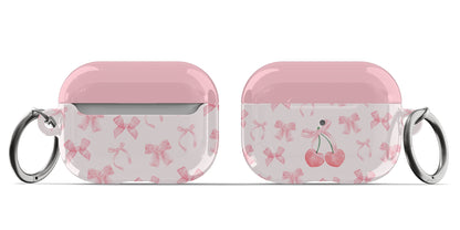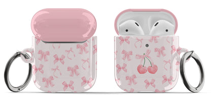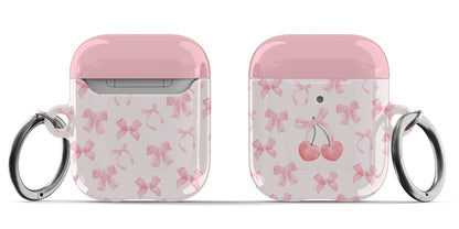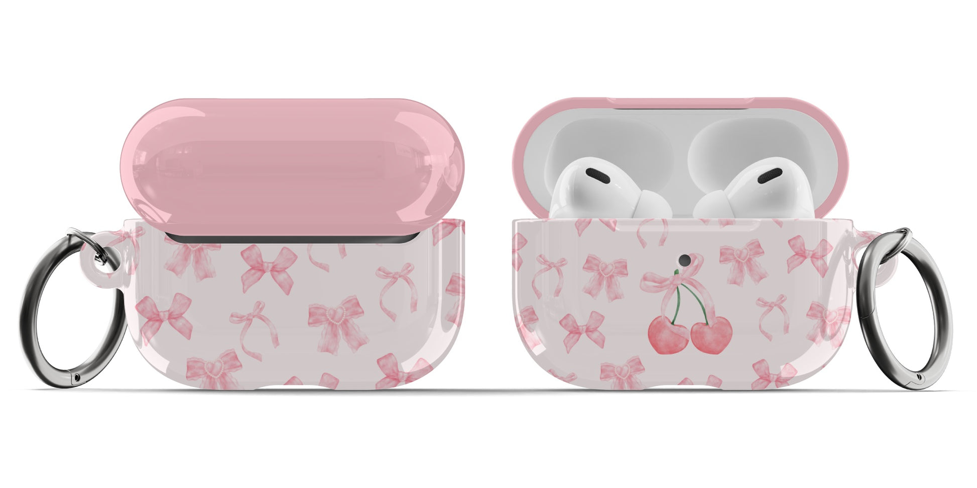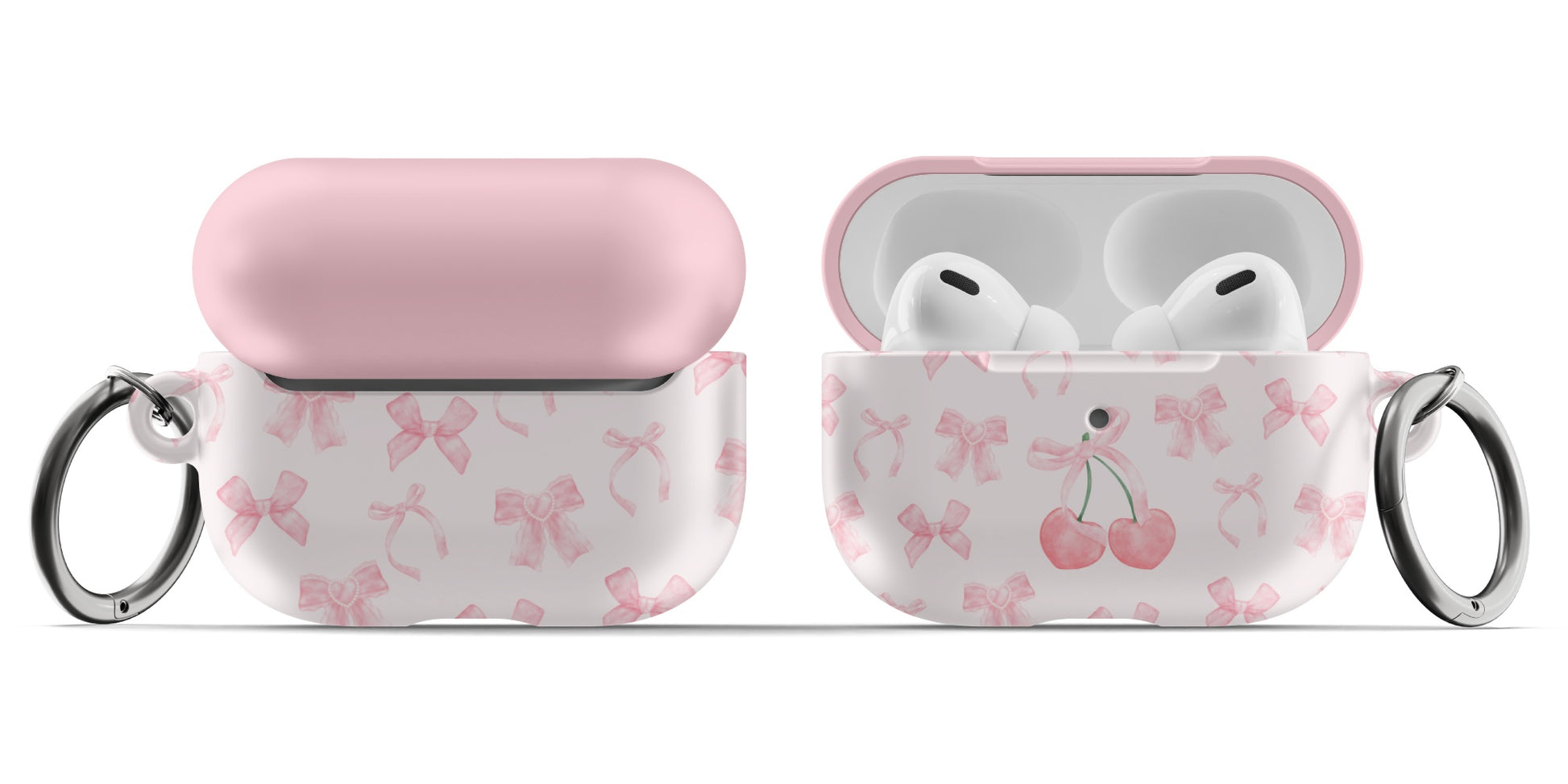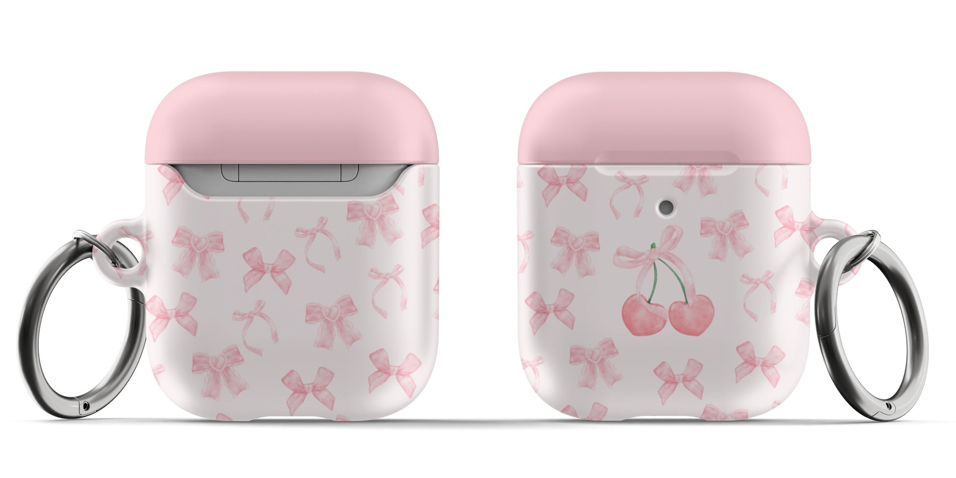 Protect your AirPods with our Cherry Pink Bows AirPods Case! This cute AirPods case features cute light pink bows and red cherries on a light pink background.
