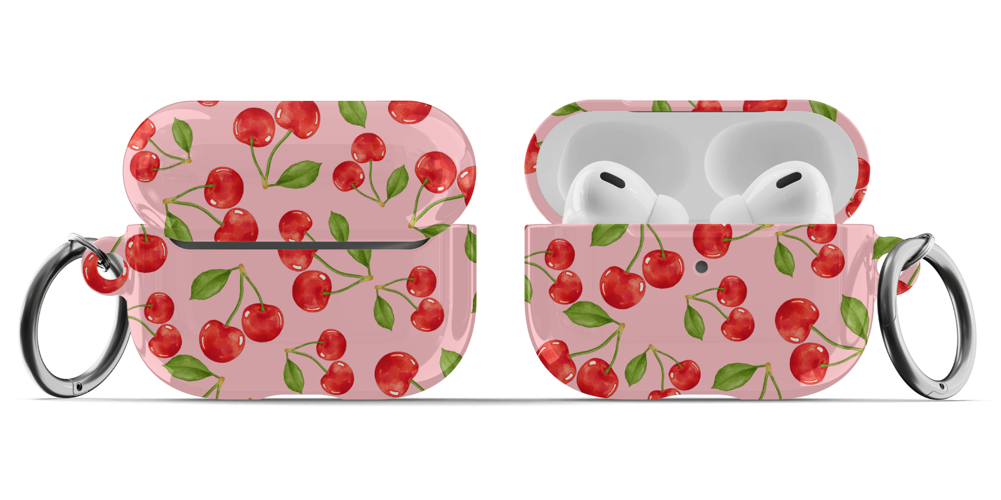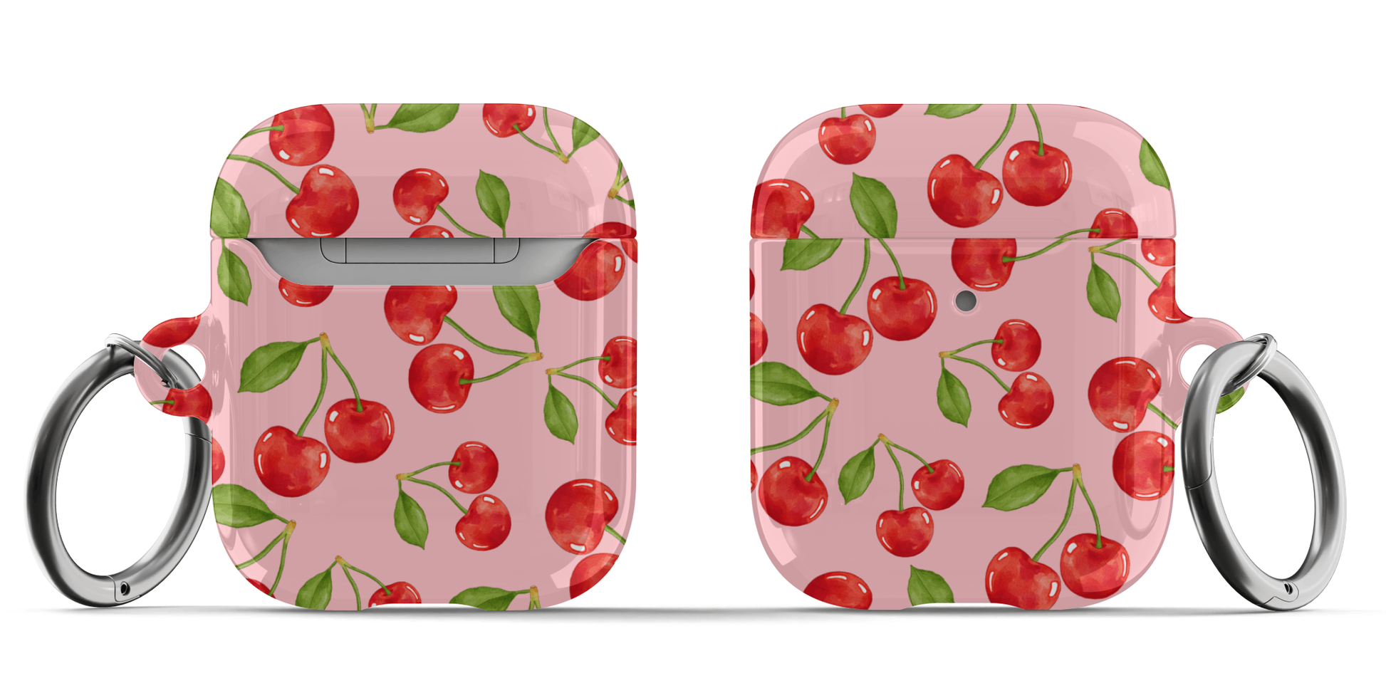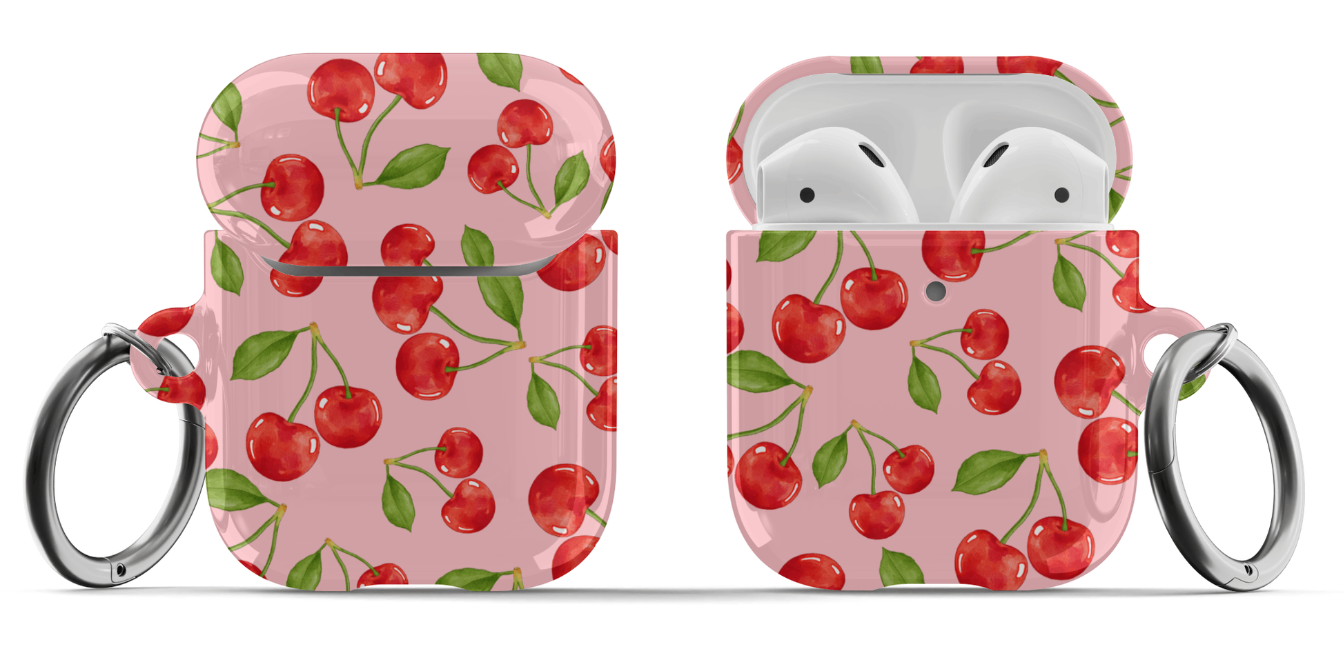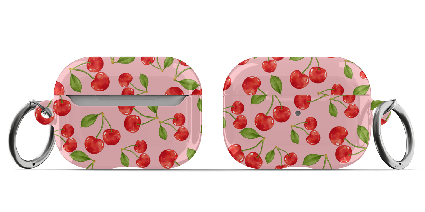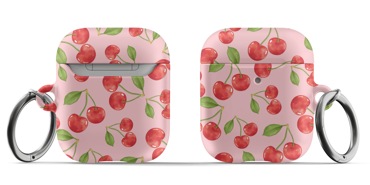 Protect your AirPods with our Cherry Rain AirPods Case! This Airpods Case features cherries on a pink background.
