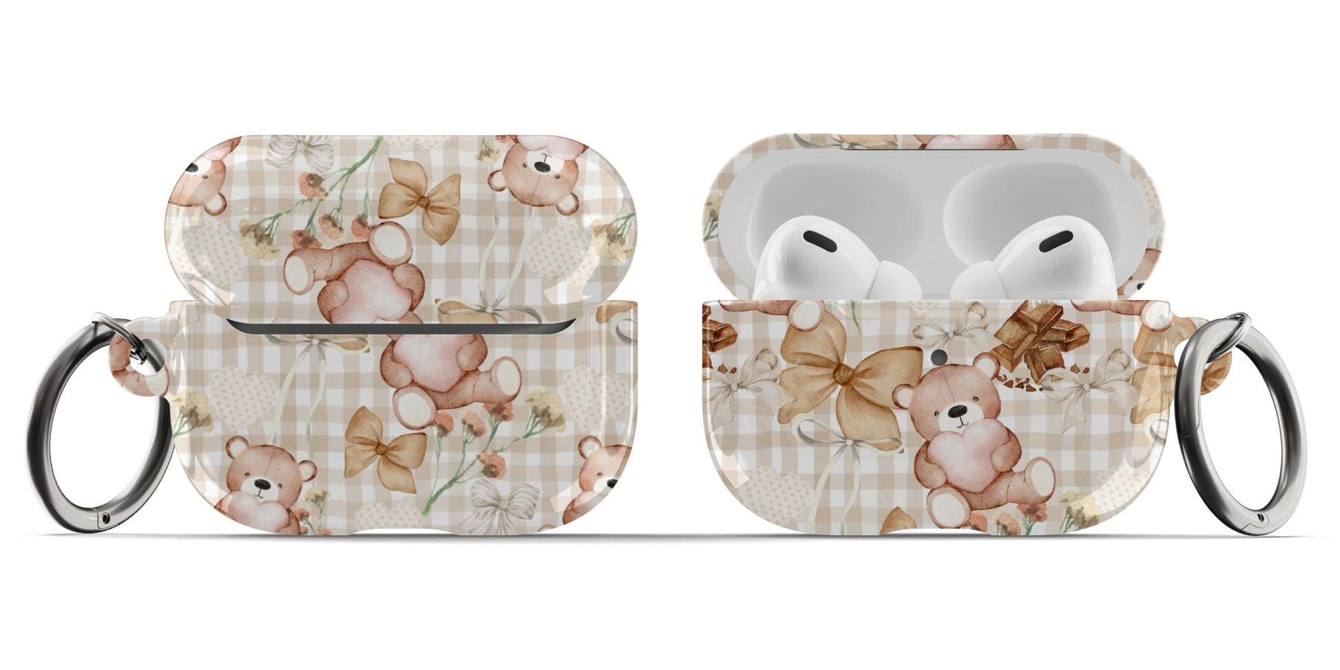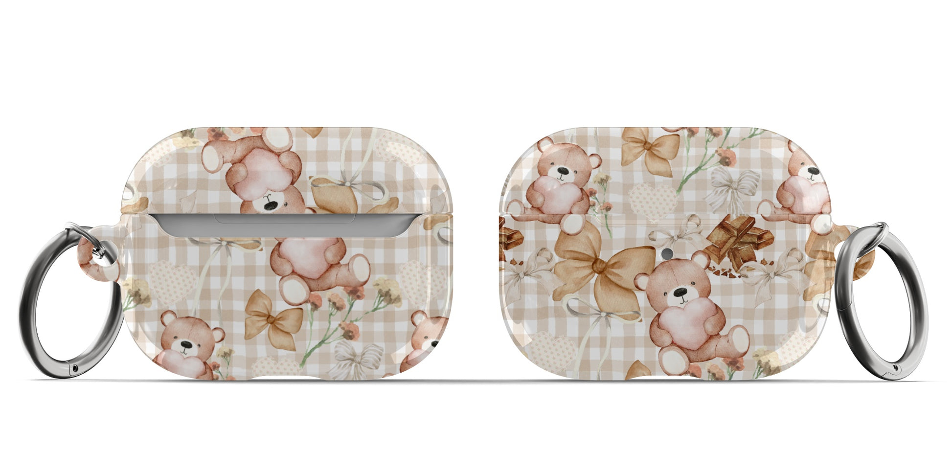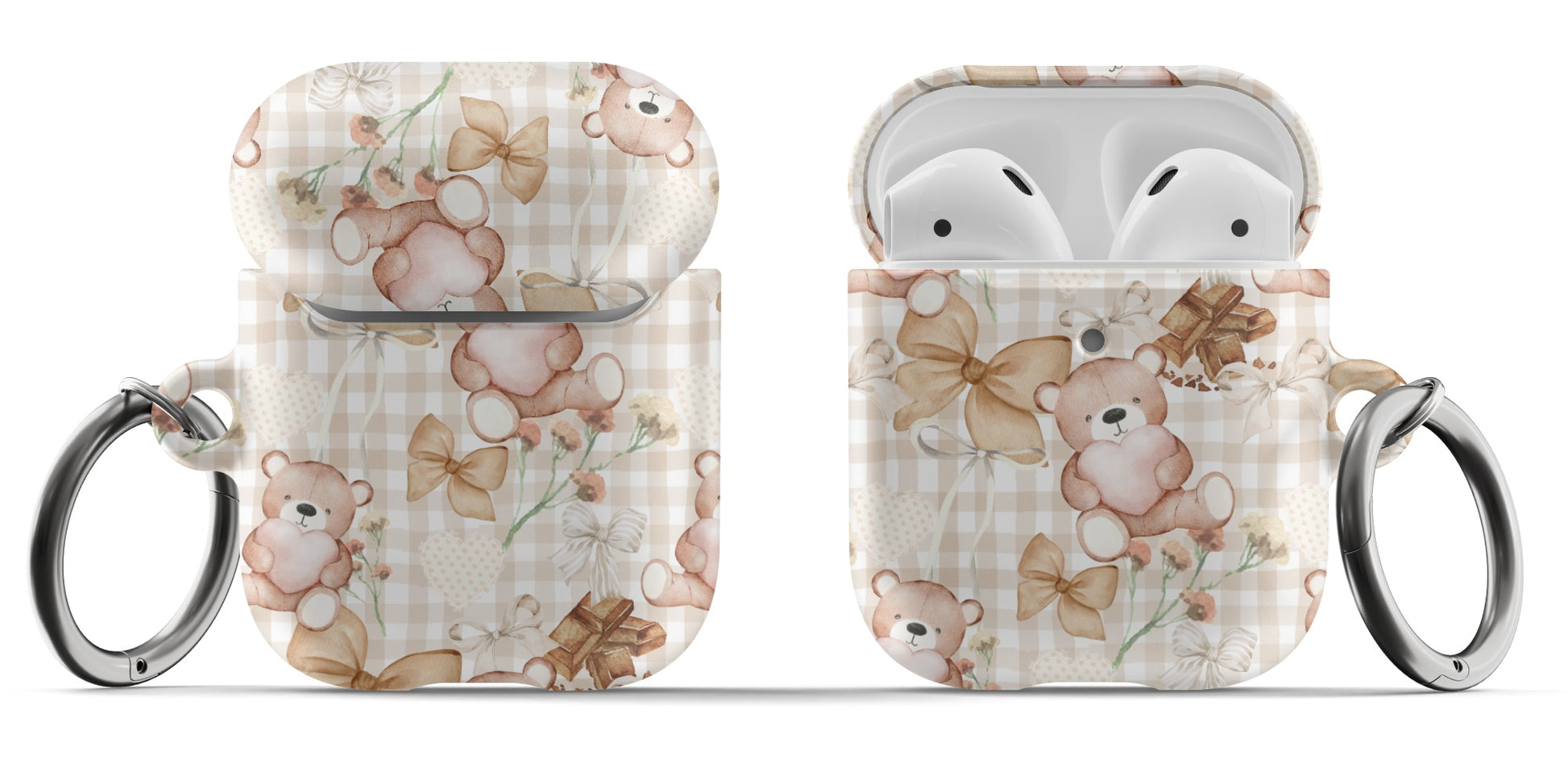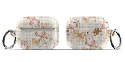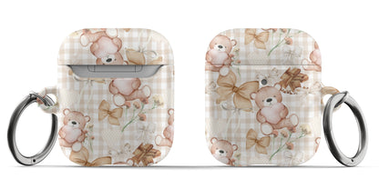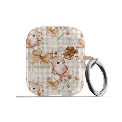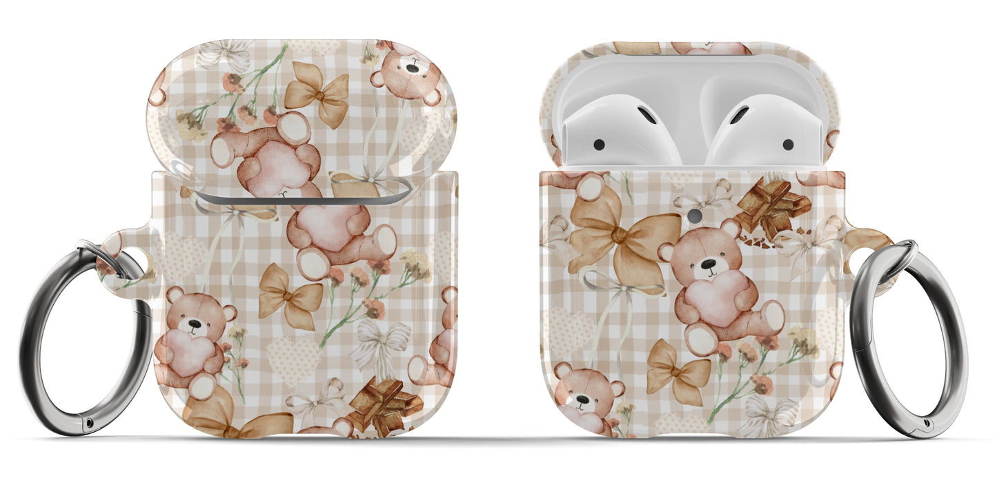 Protect your AirPods with our Choco Teddy Bear AirPods Case! This cute AirPods case features brown teddy bears, bows, flowers, hearts, and chocolate on a light brown gingham pattern.
