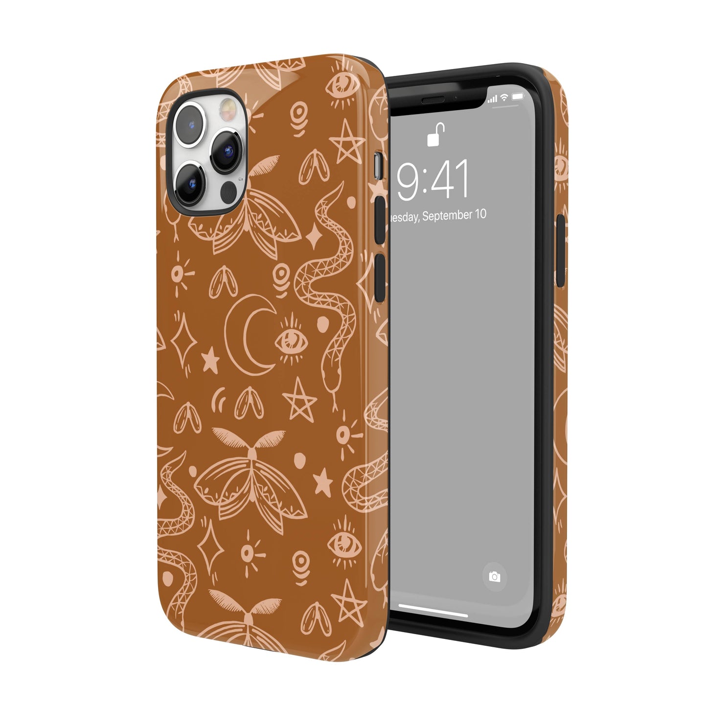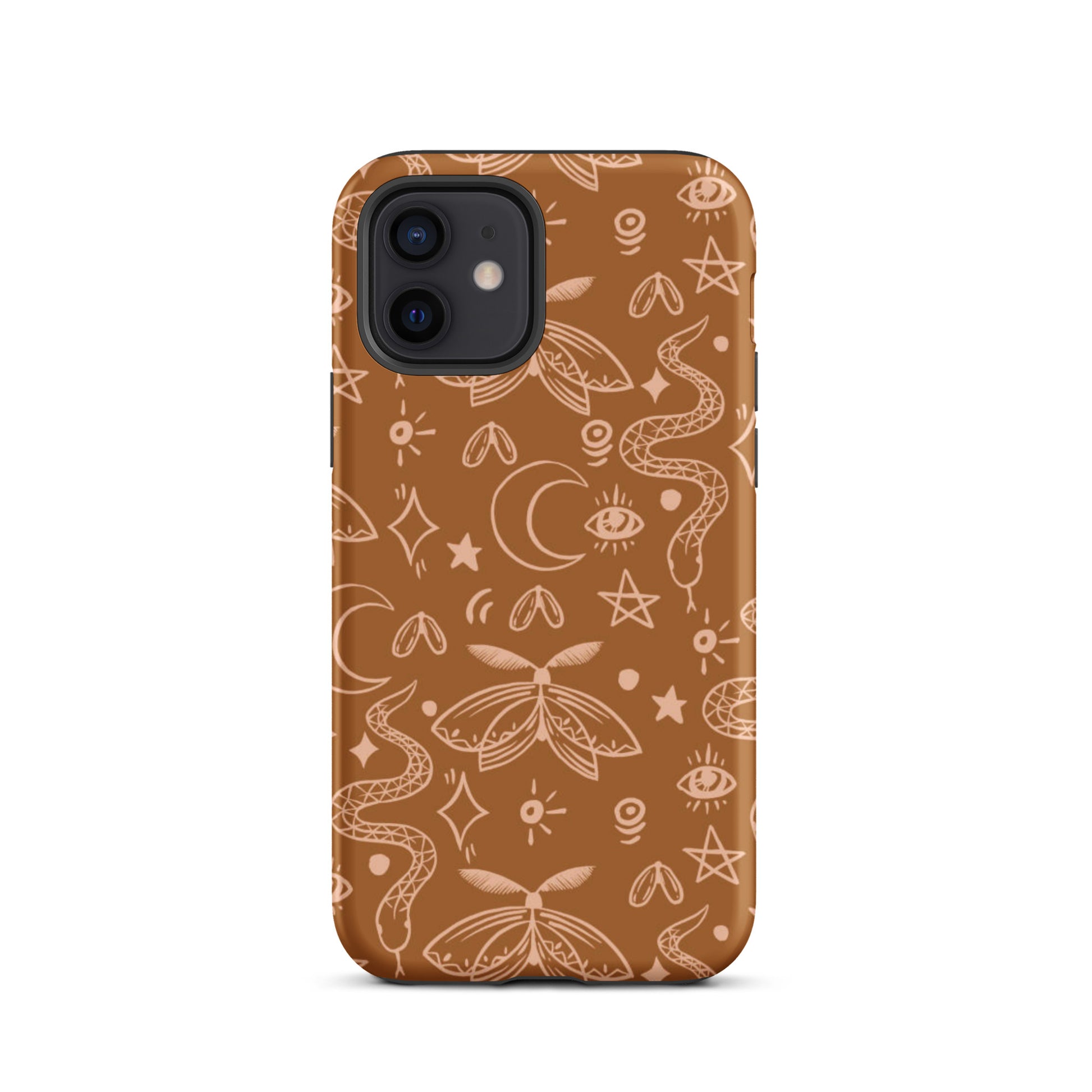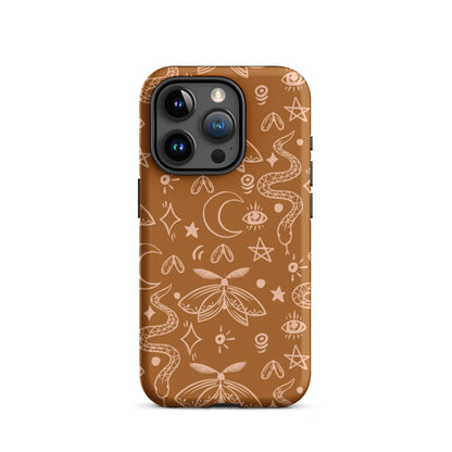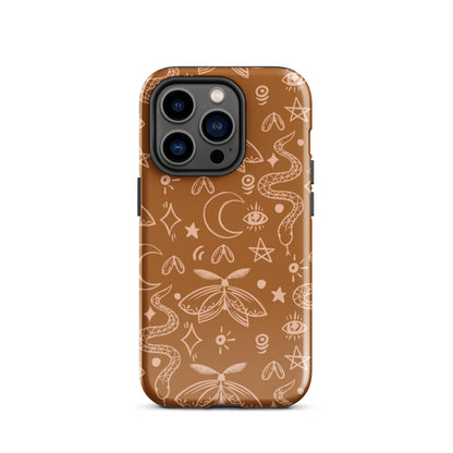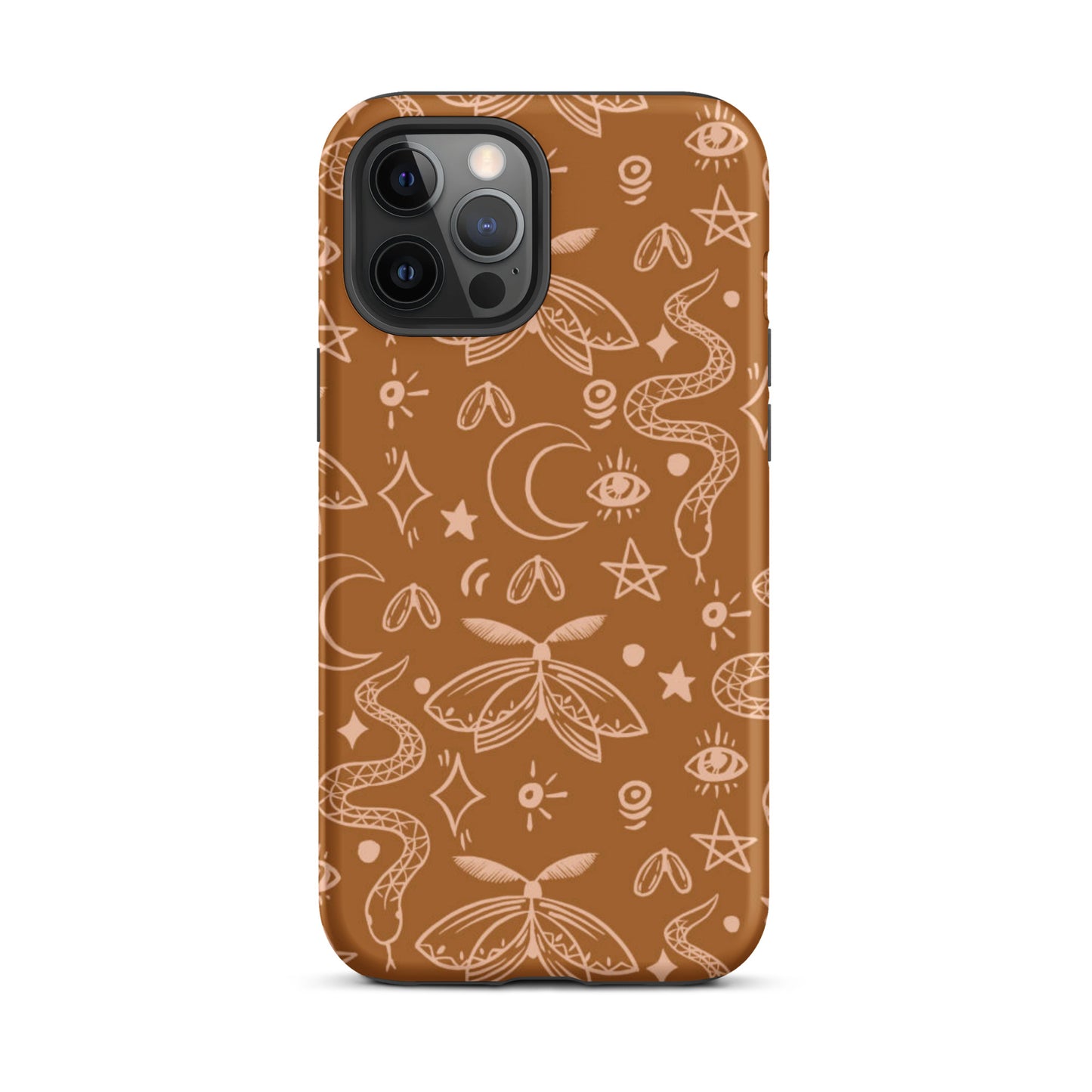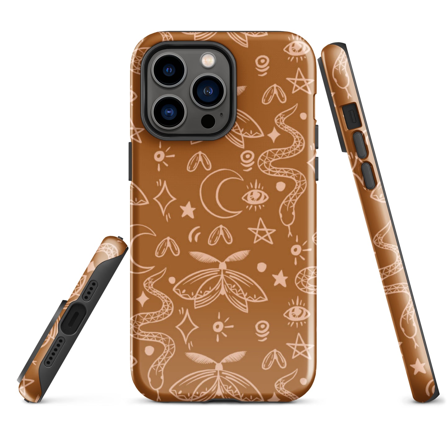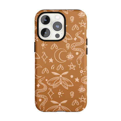 Be bold and elegant with the Golden Serpent iPhone Case! This elegant case features light tan serpents, moths, moons, eyes, and stars on a brown background.