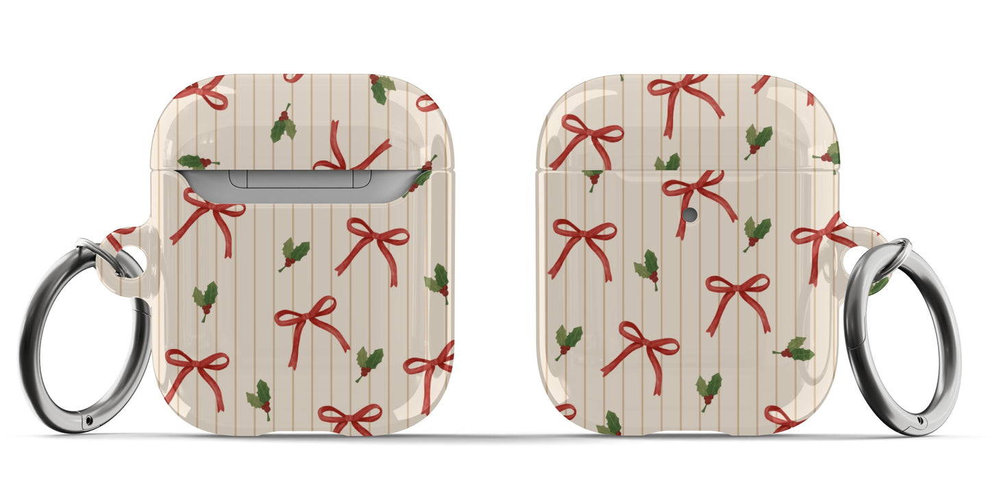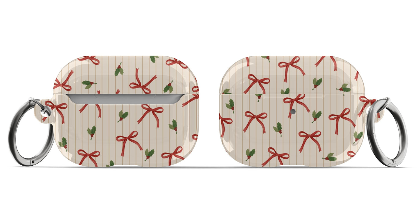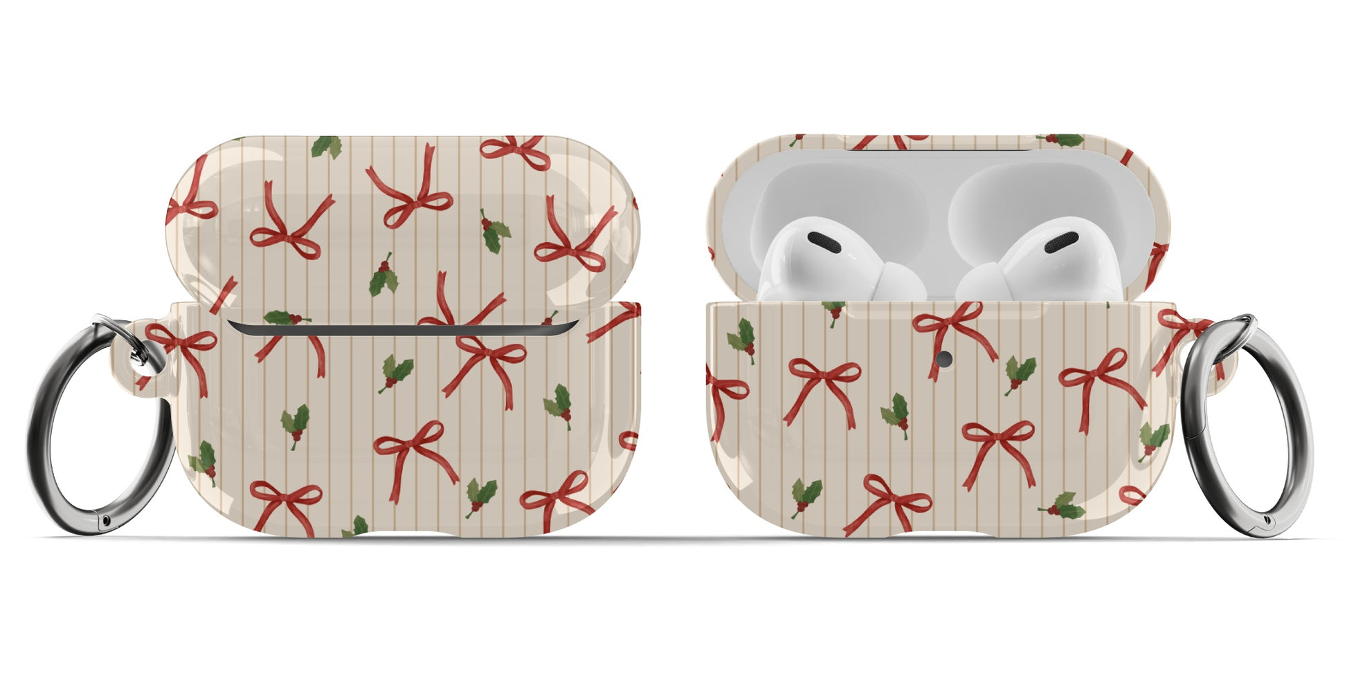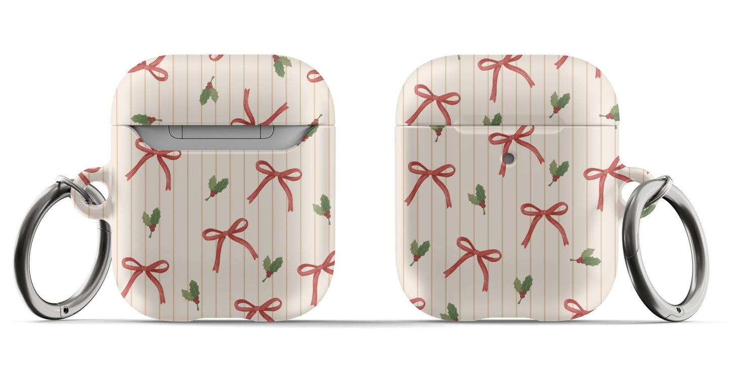 Protect your AirPods with our Festive Bowtique AirPods Case! This cute AirPods case features red bows and leaves on a striped beige background.