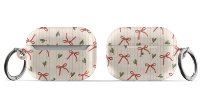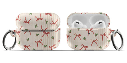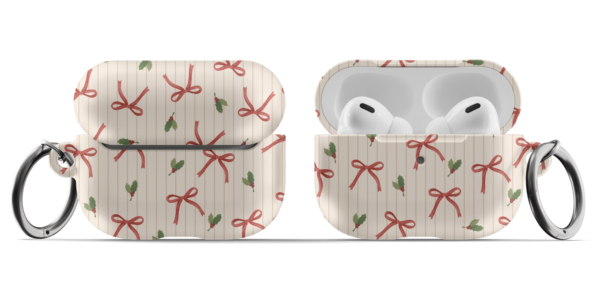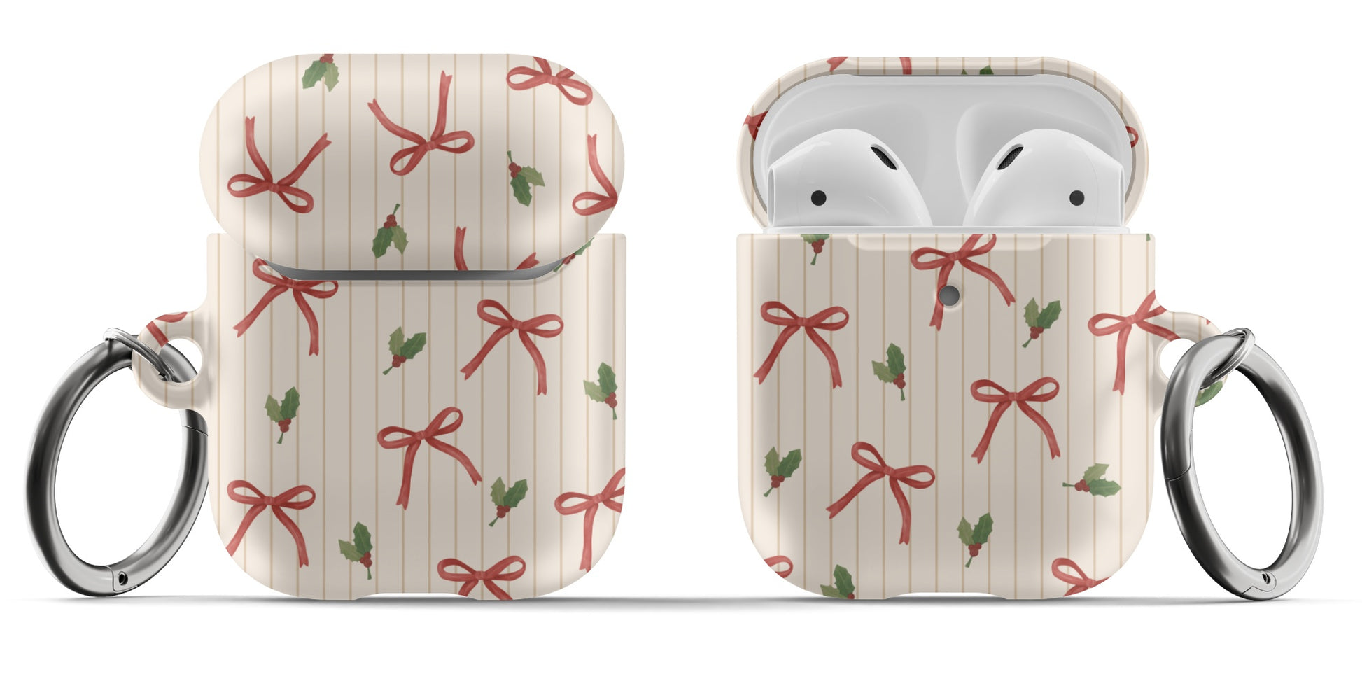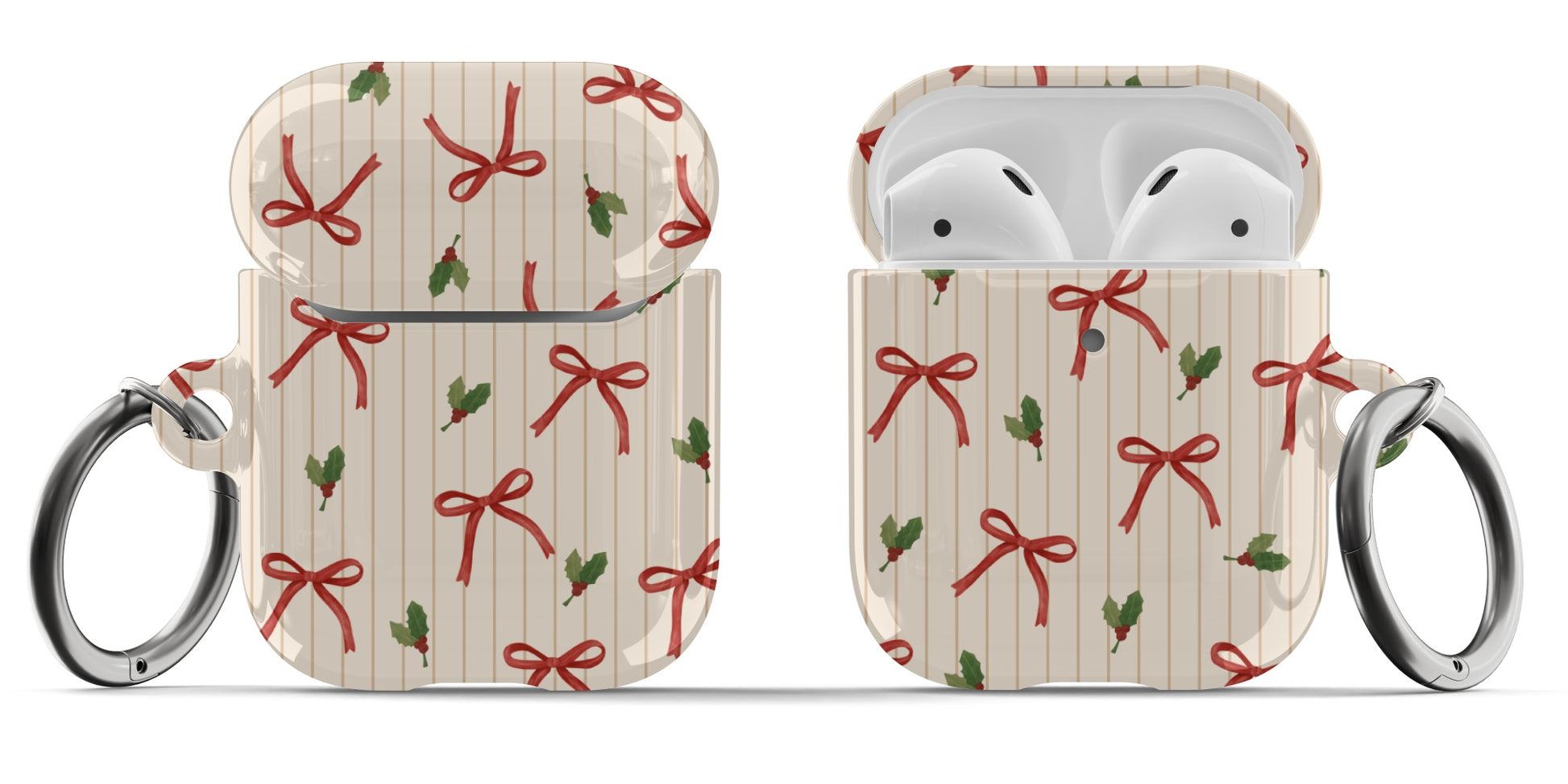Protect your AirPods with our Festive Bowtique AirPods Case! This cute AirPods case features red bows and leaves on a striped beige background.