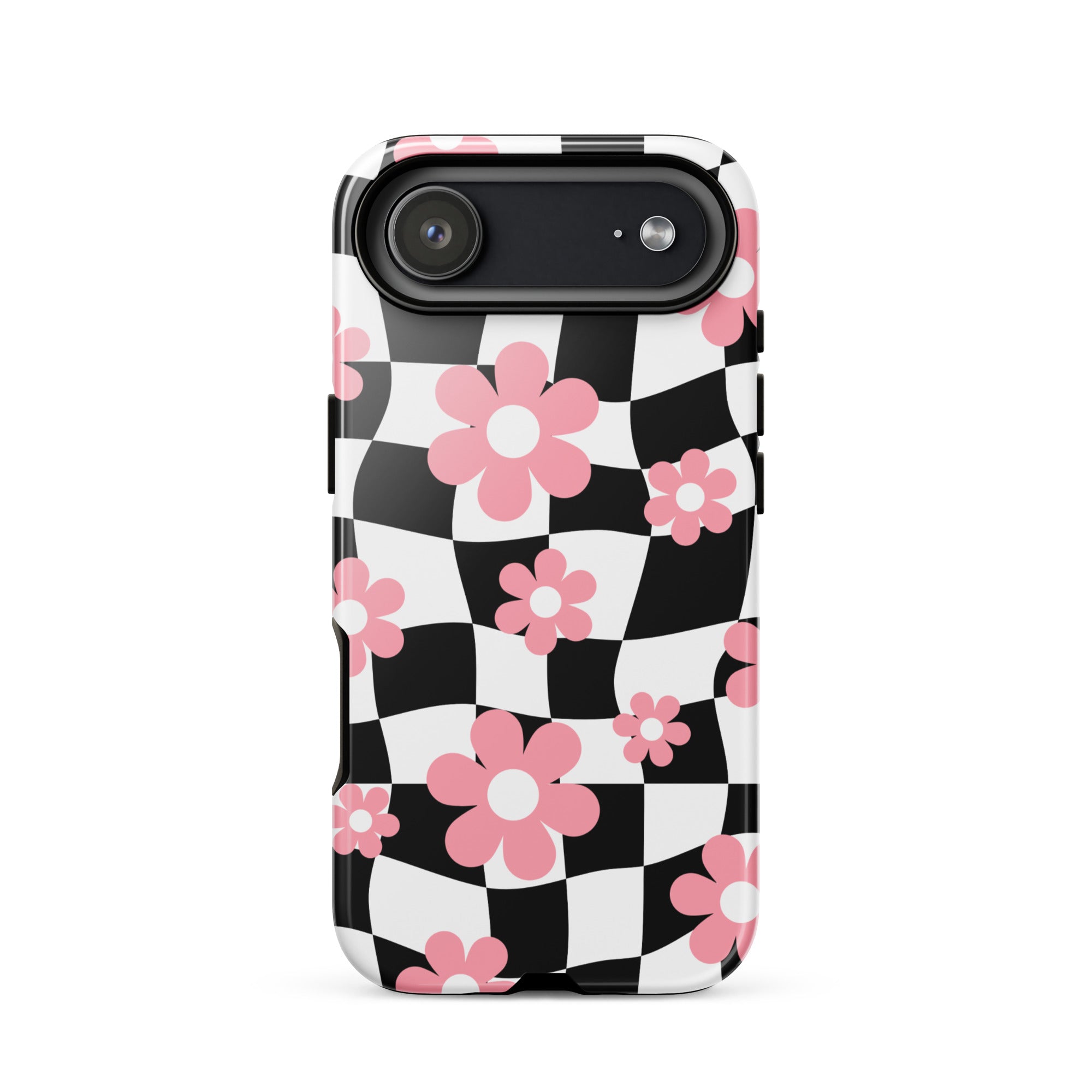 Groovy meets girly with the Floral Wavy Checkered iPhone Case! This design puts a vintage spin on a classic checkered print, featuring a black-and-white wavy pattern topped with charming pink retro flowers.