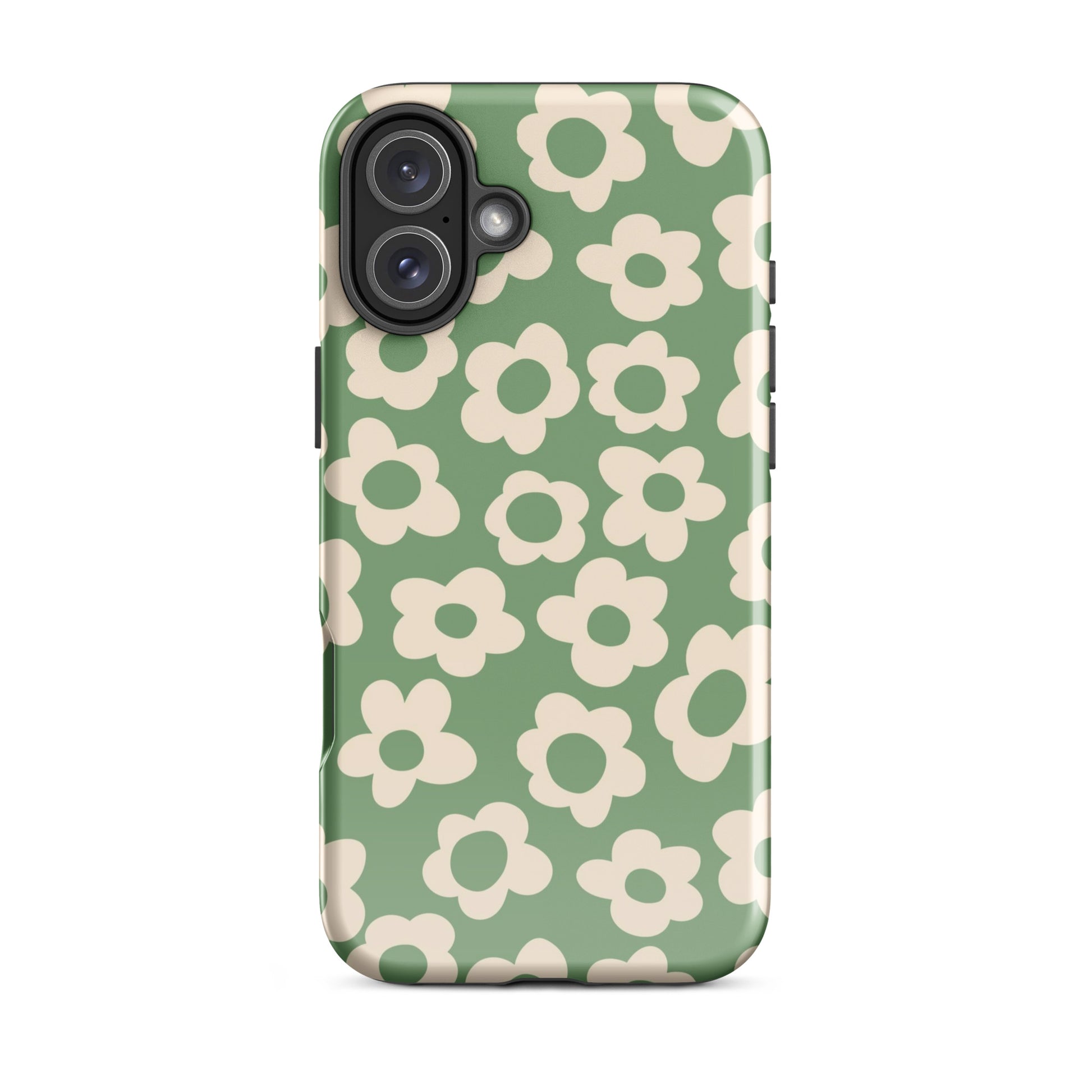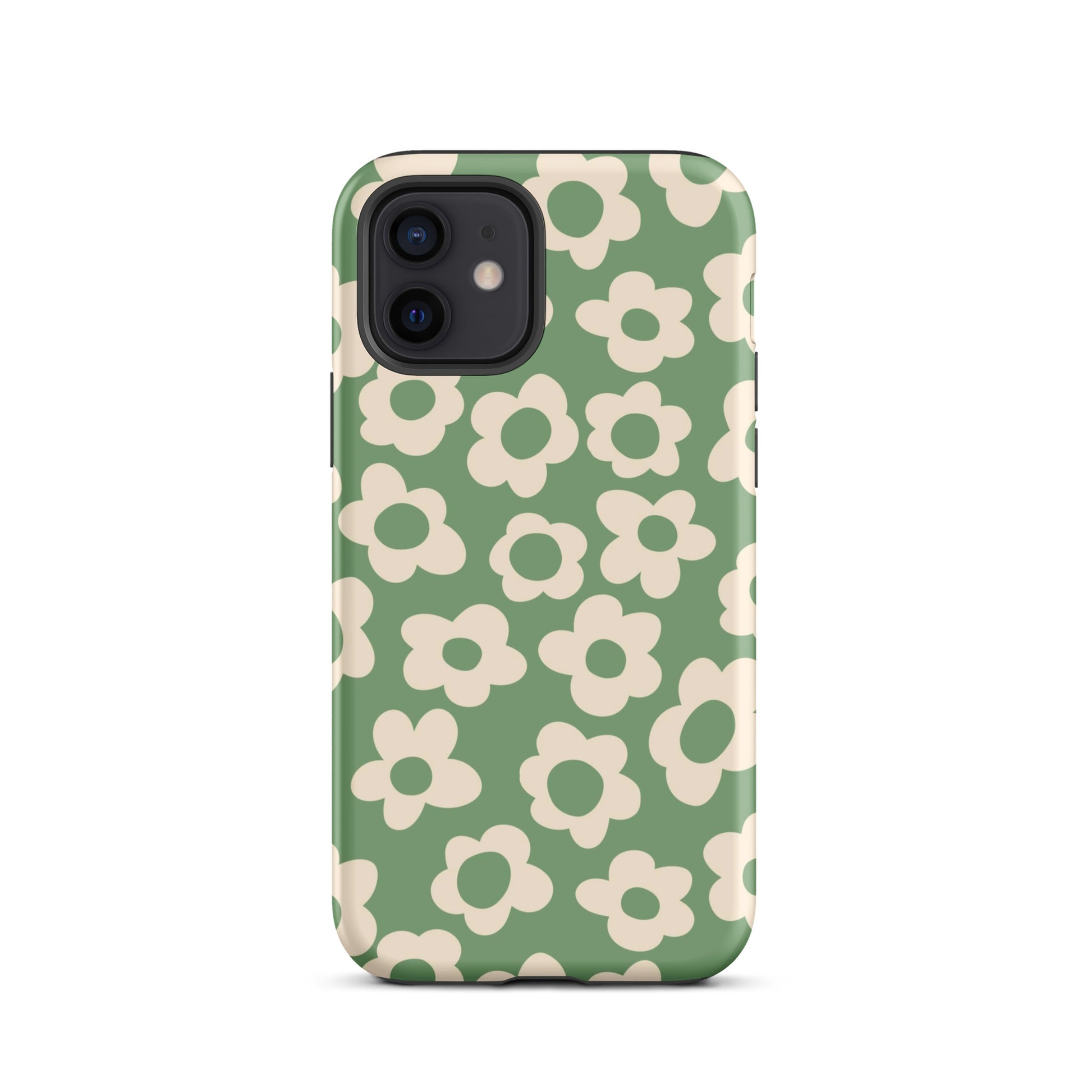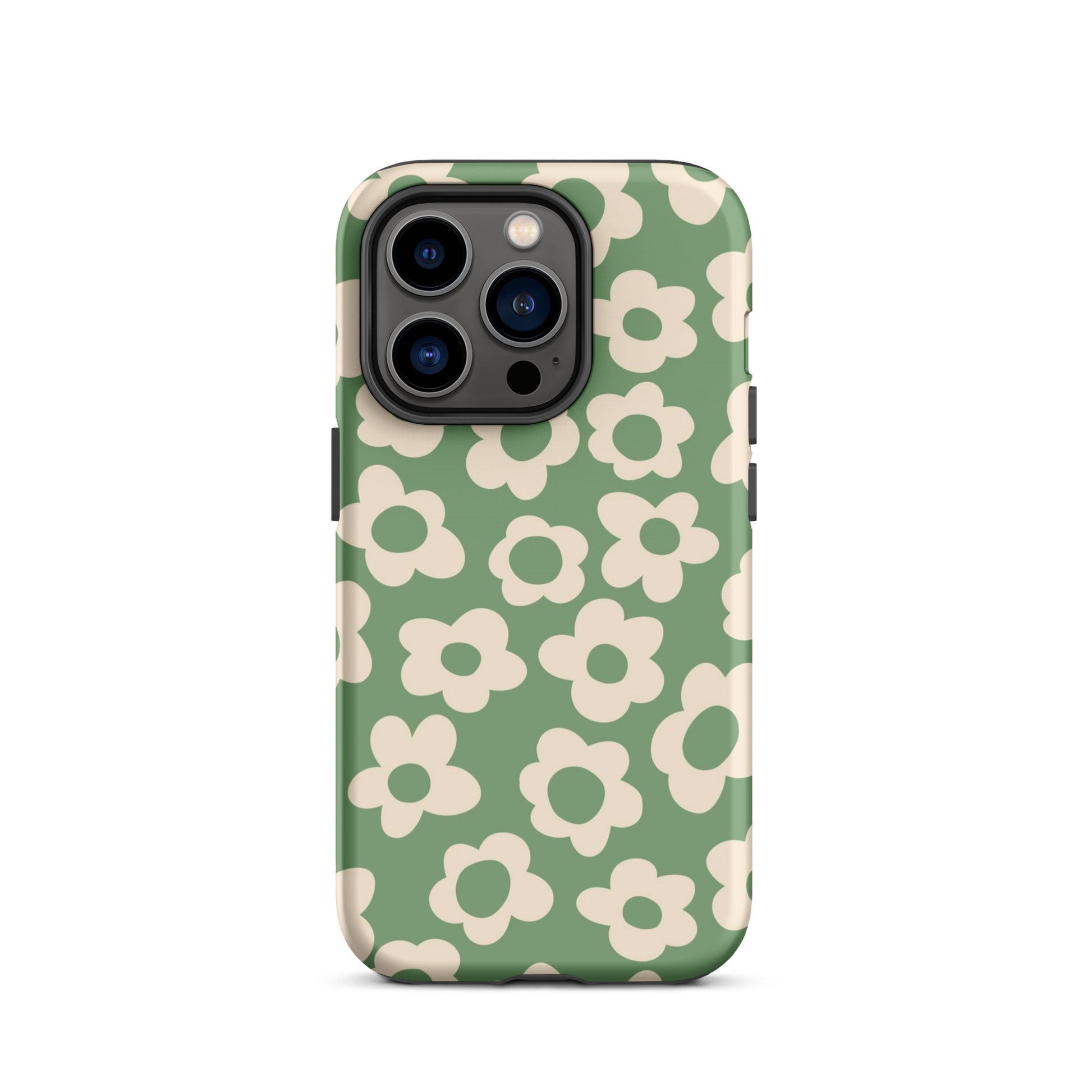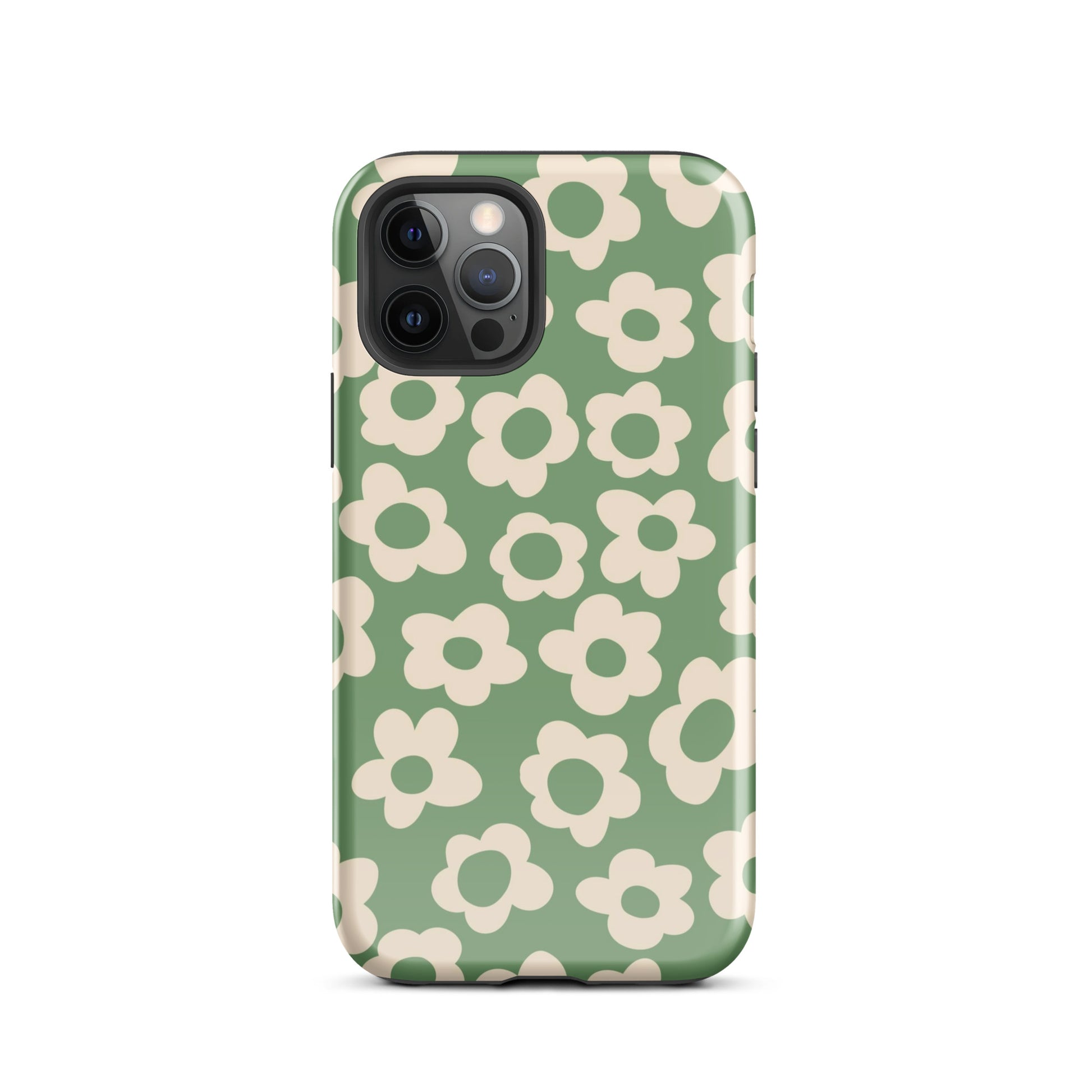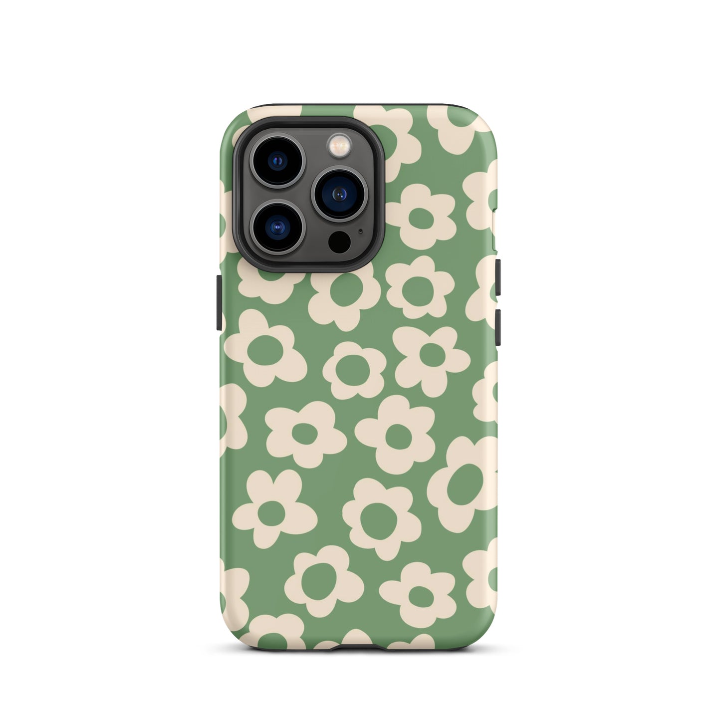 Protect your phone from harm in style with this Green Las Flores iPhone Case! This case features 70s inspired flowers on a green background.