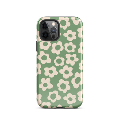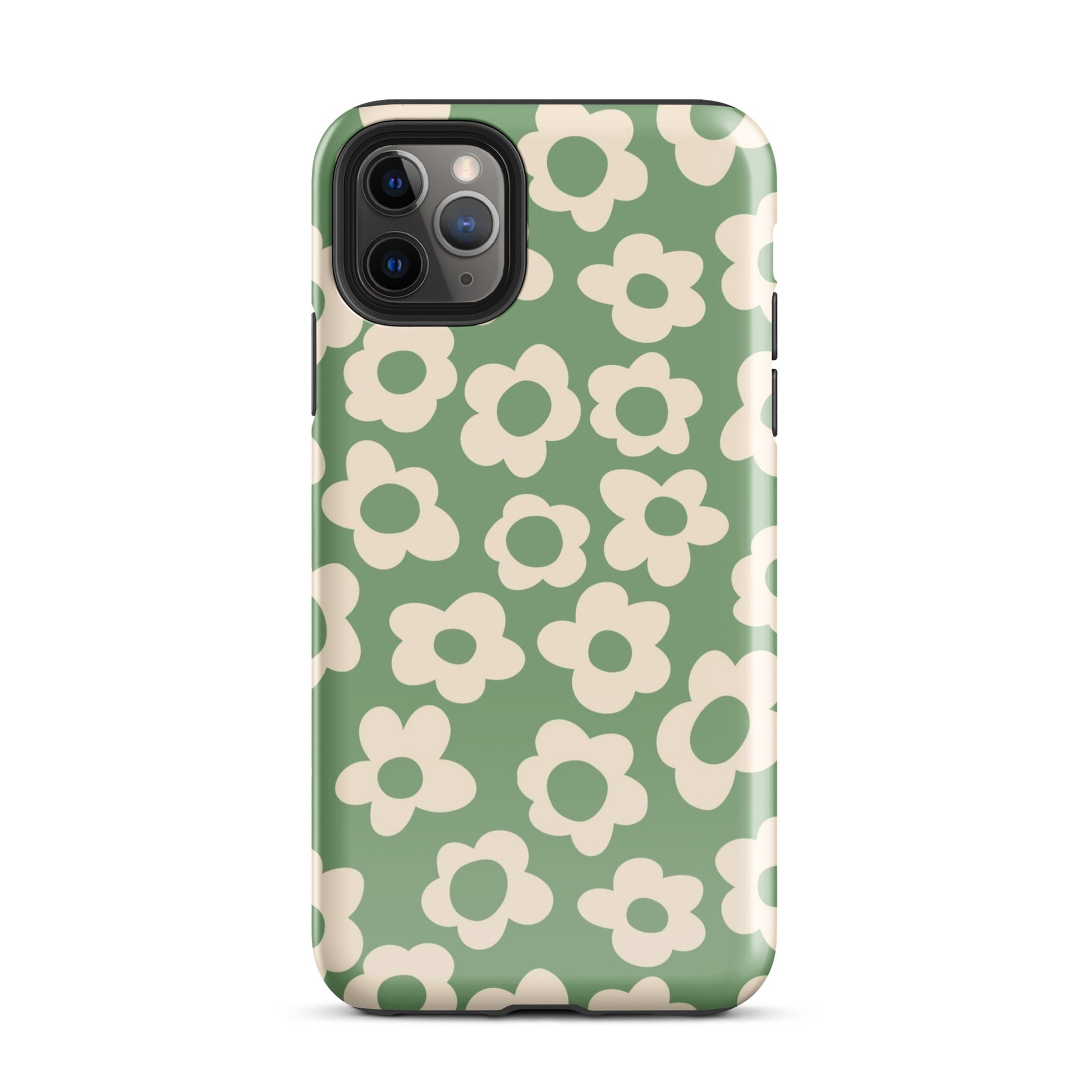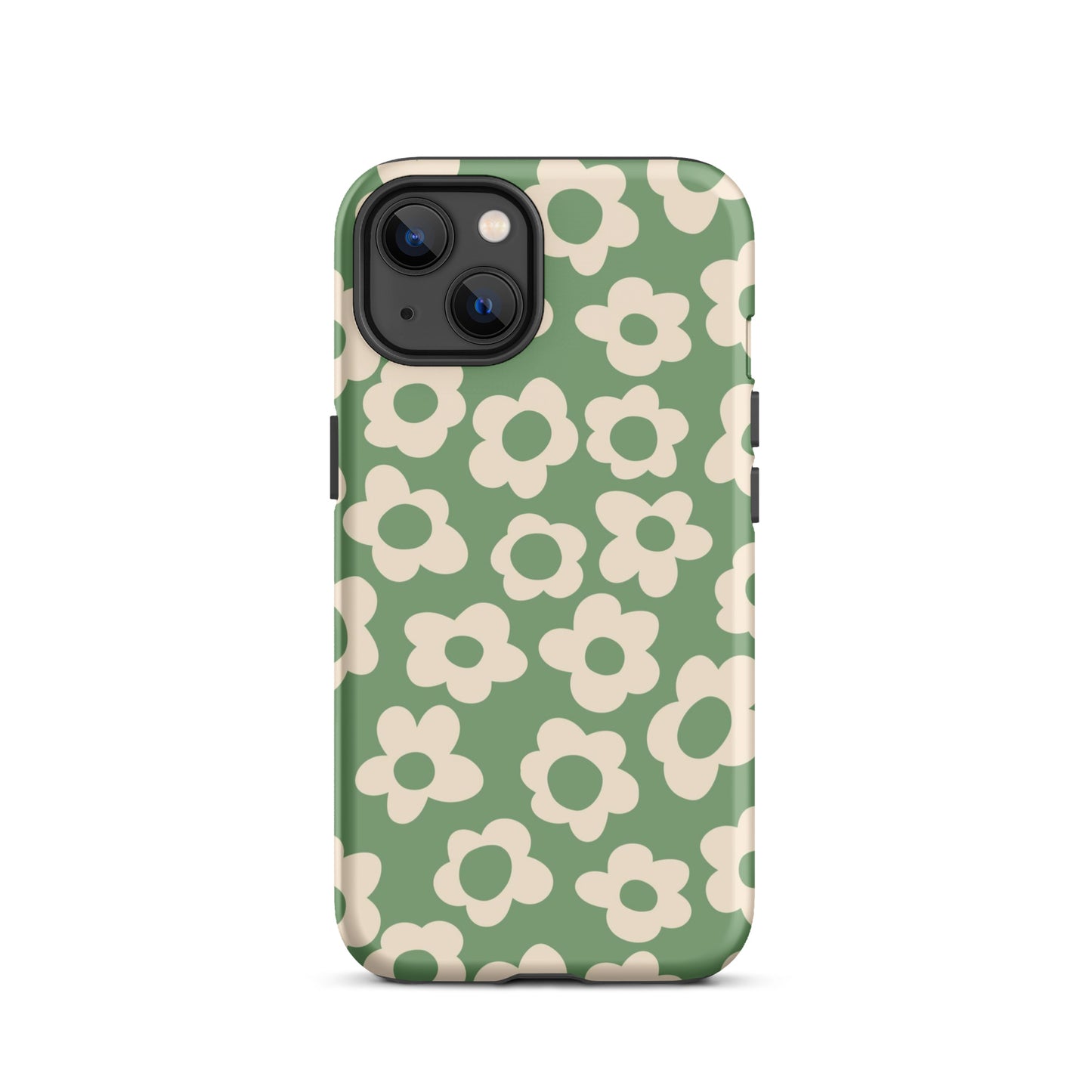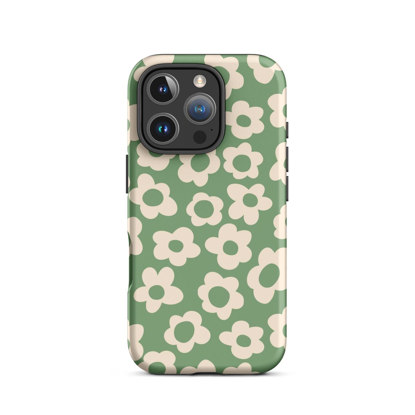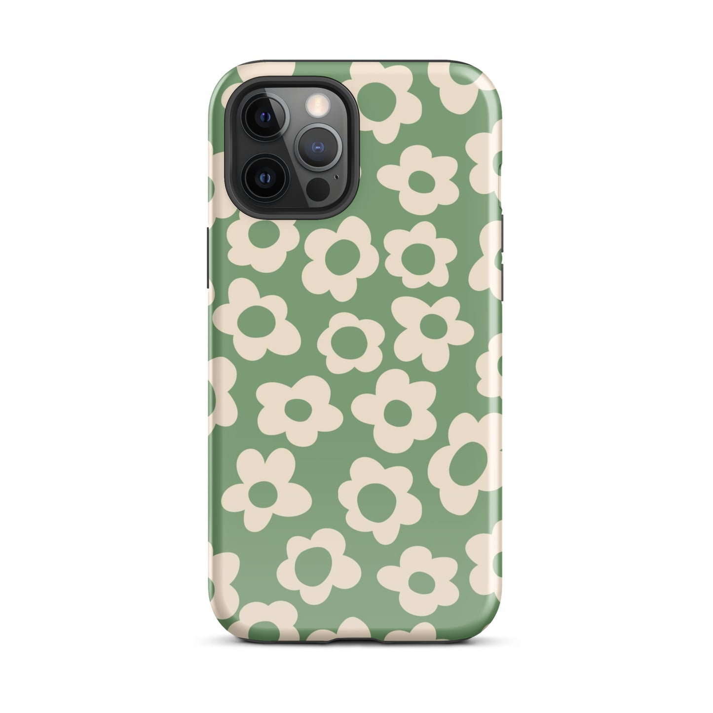 Protect your phone from harm in style with this Green Las Flores iPhone Case! This case features 70s inspired flowers on a green background.