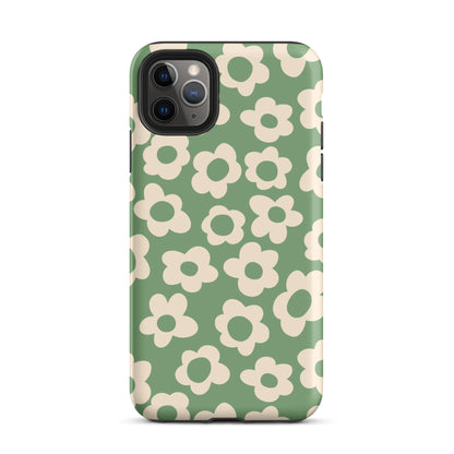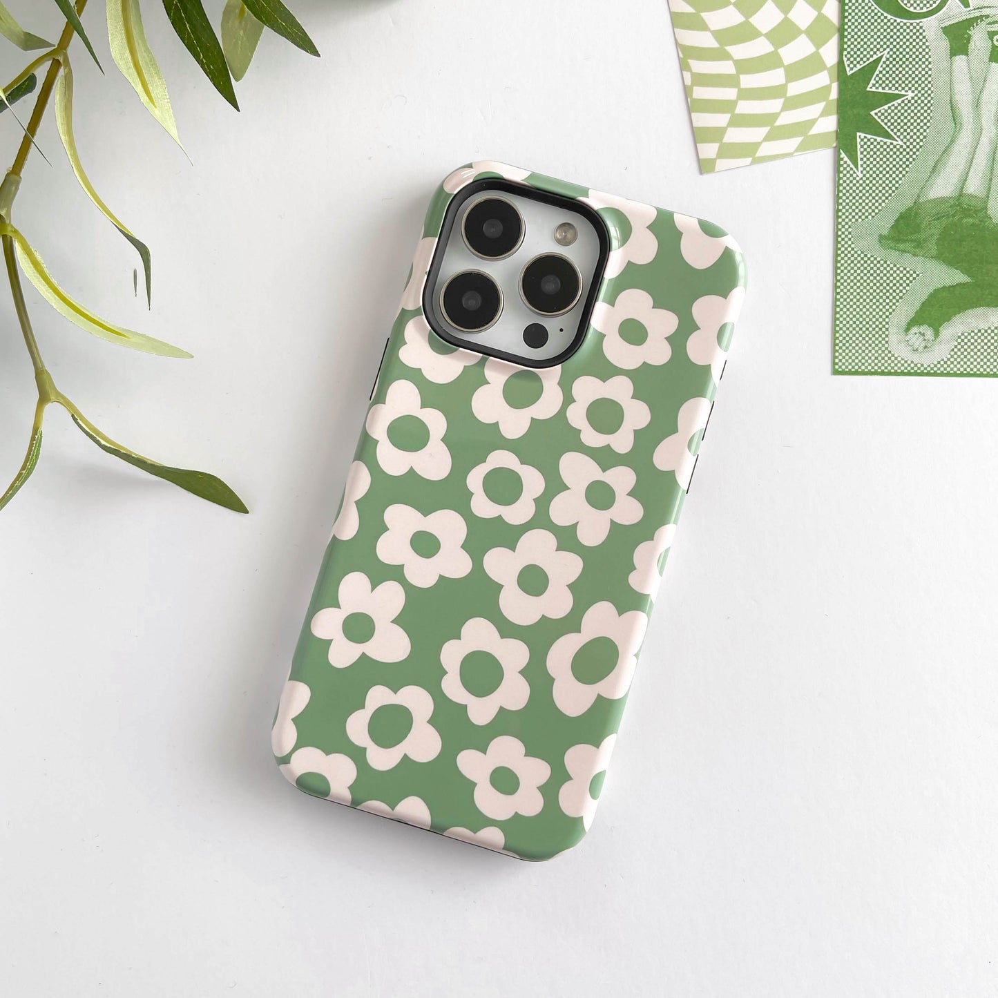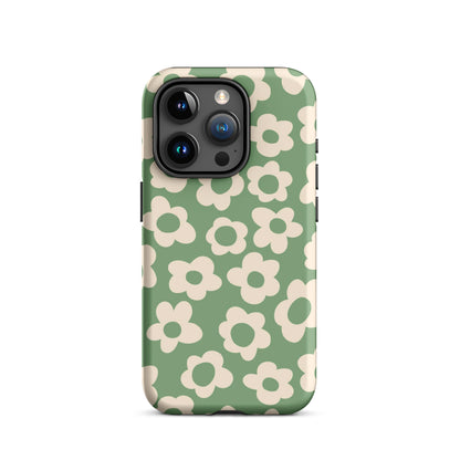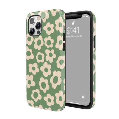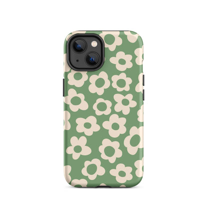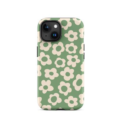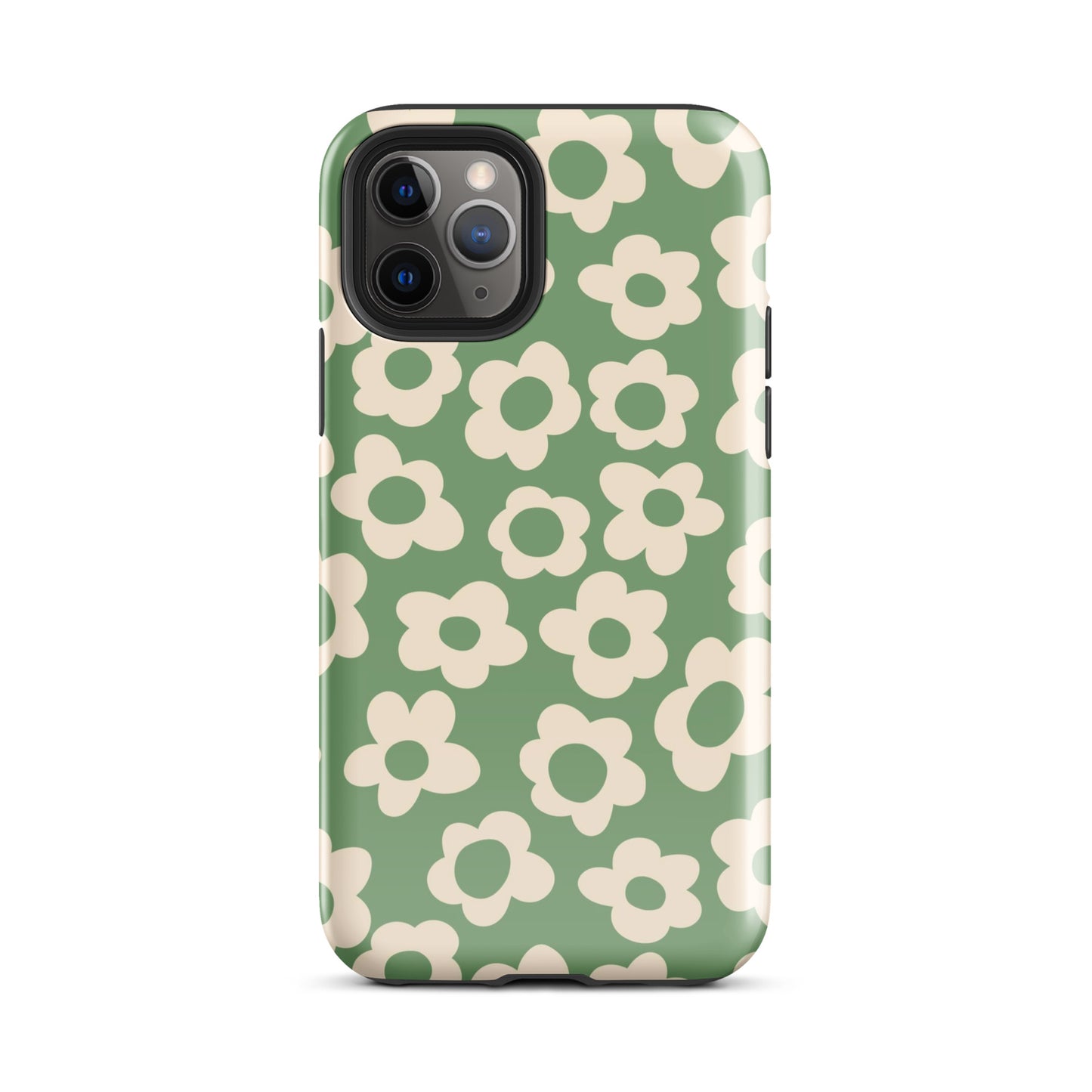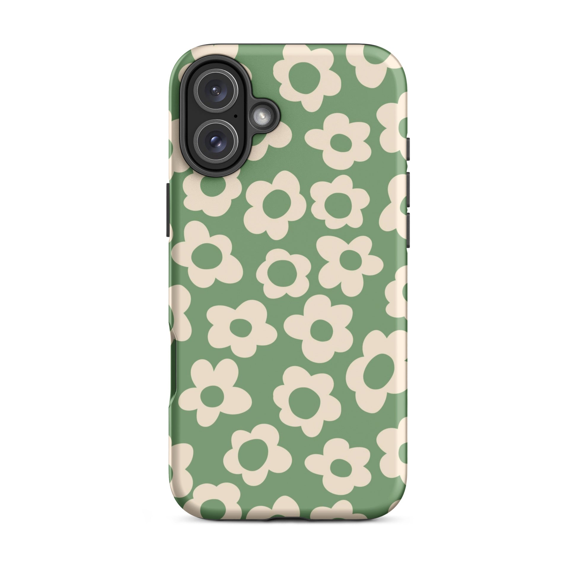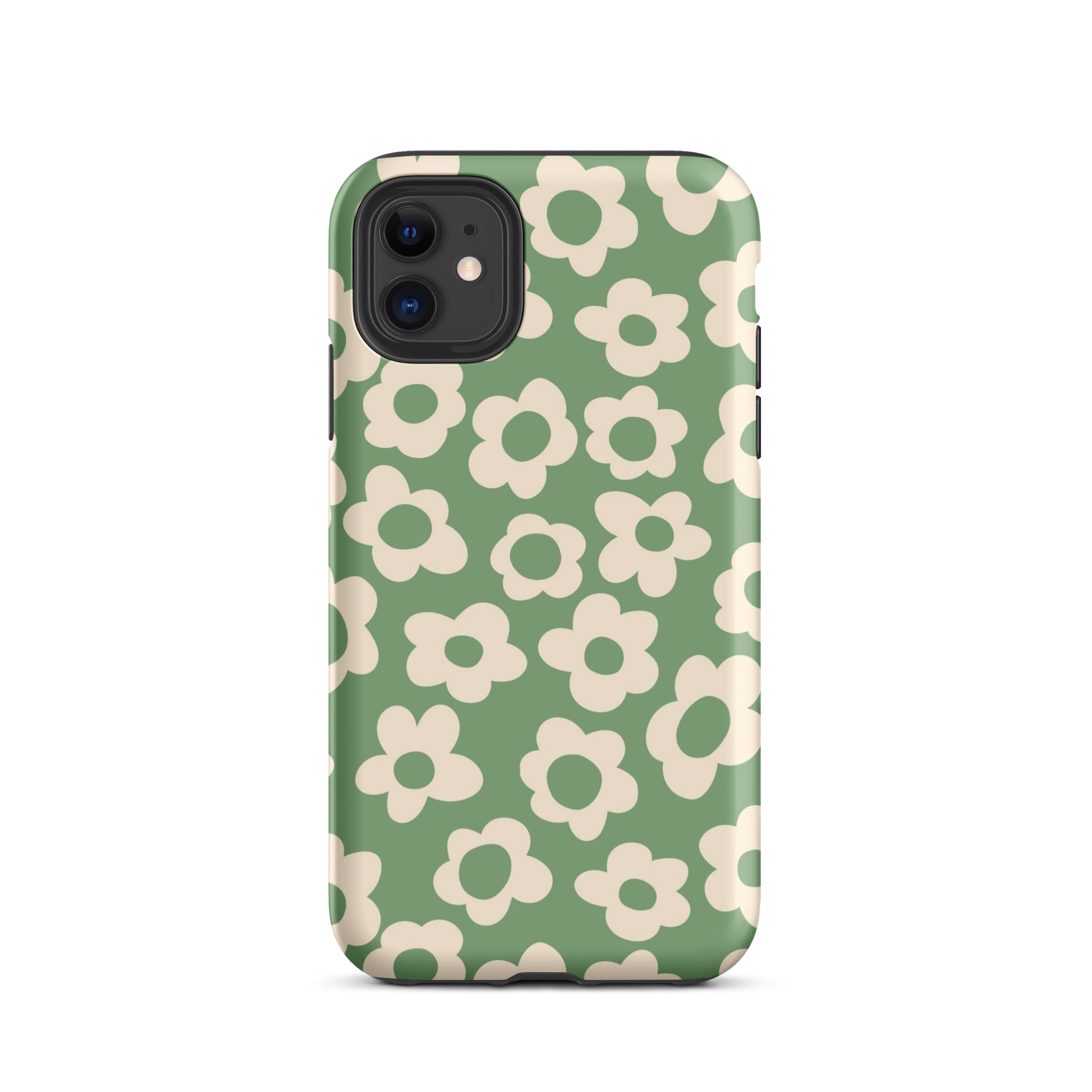 Protect your phone from harm in style with this Green Las Flores iPhone Case! This case features 70s inspired flowers on a green background.