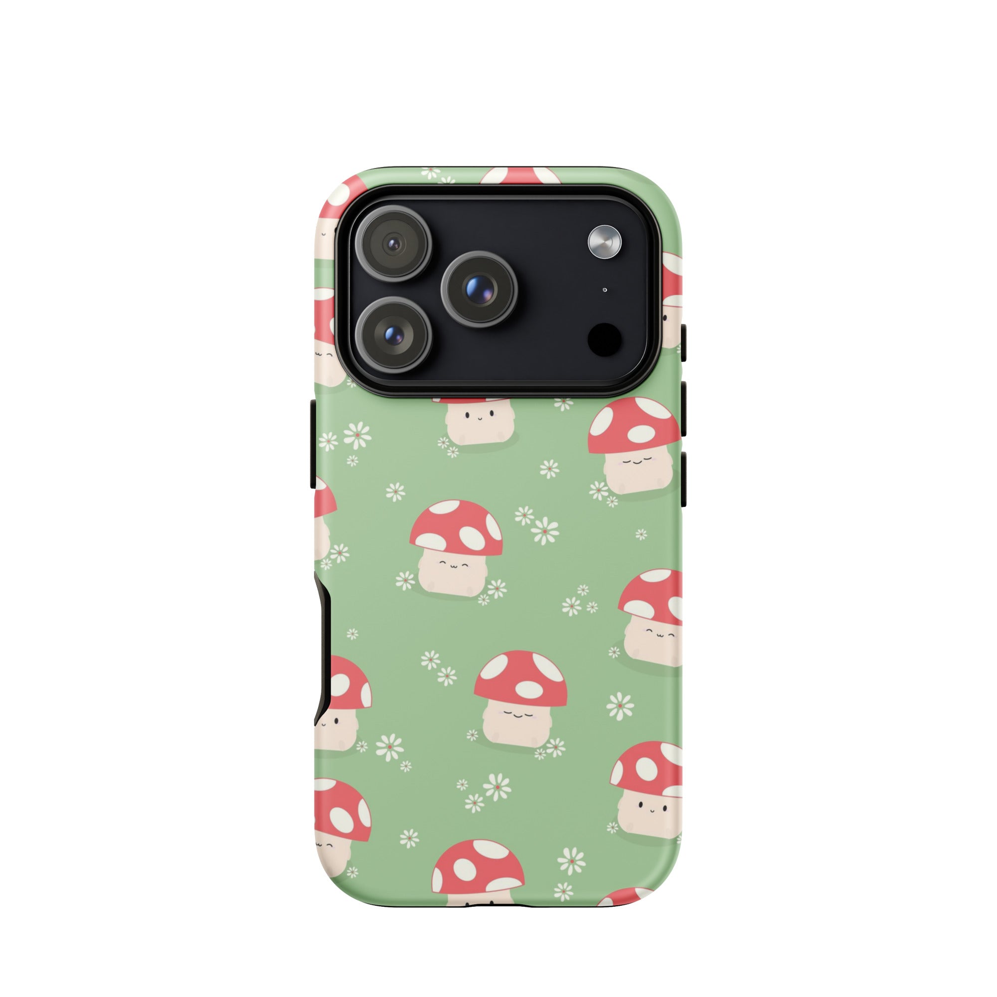 Bring your little mushroom friends along wherever you go! This cute case features adorable mushroom buddies and cheerful flowers on a pastel green background.