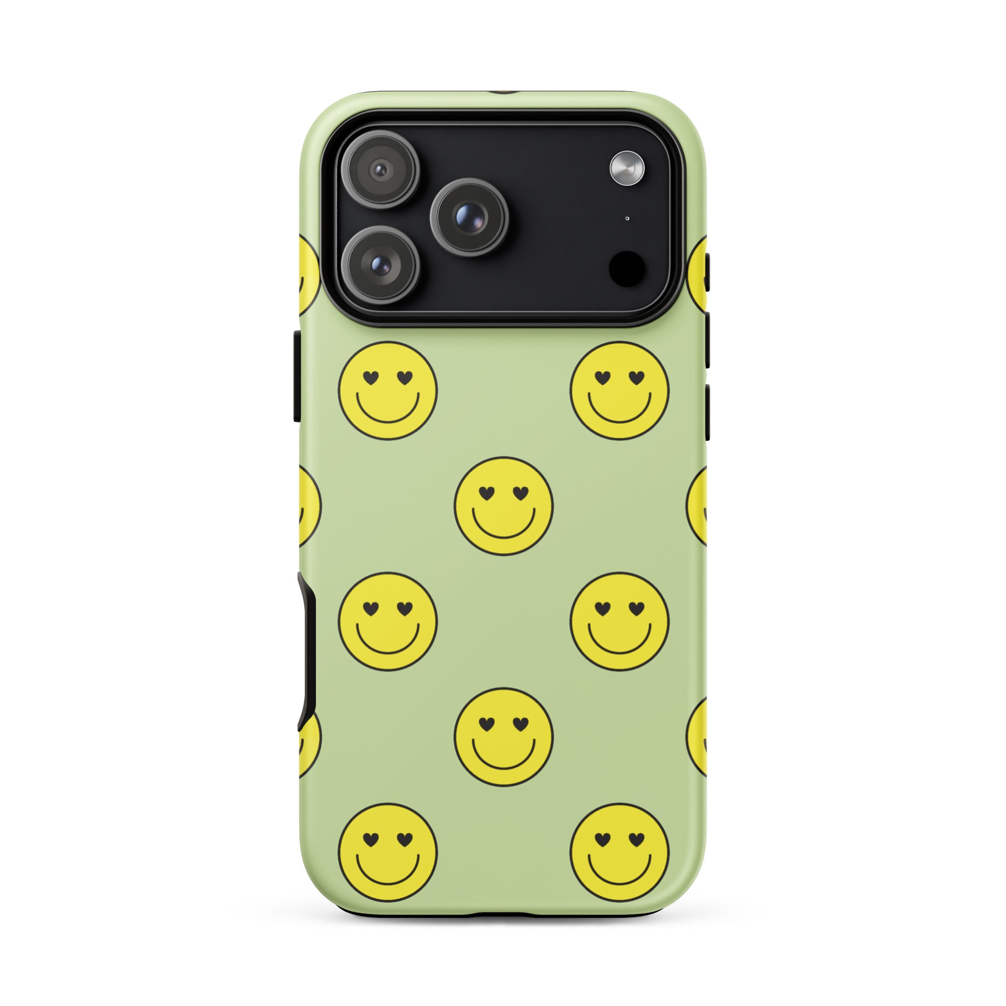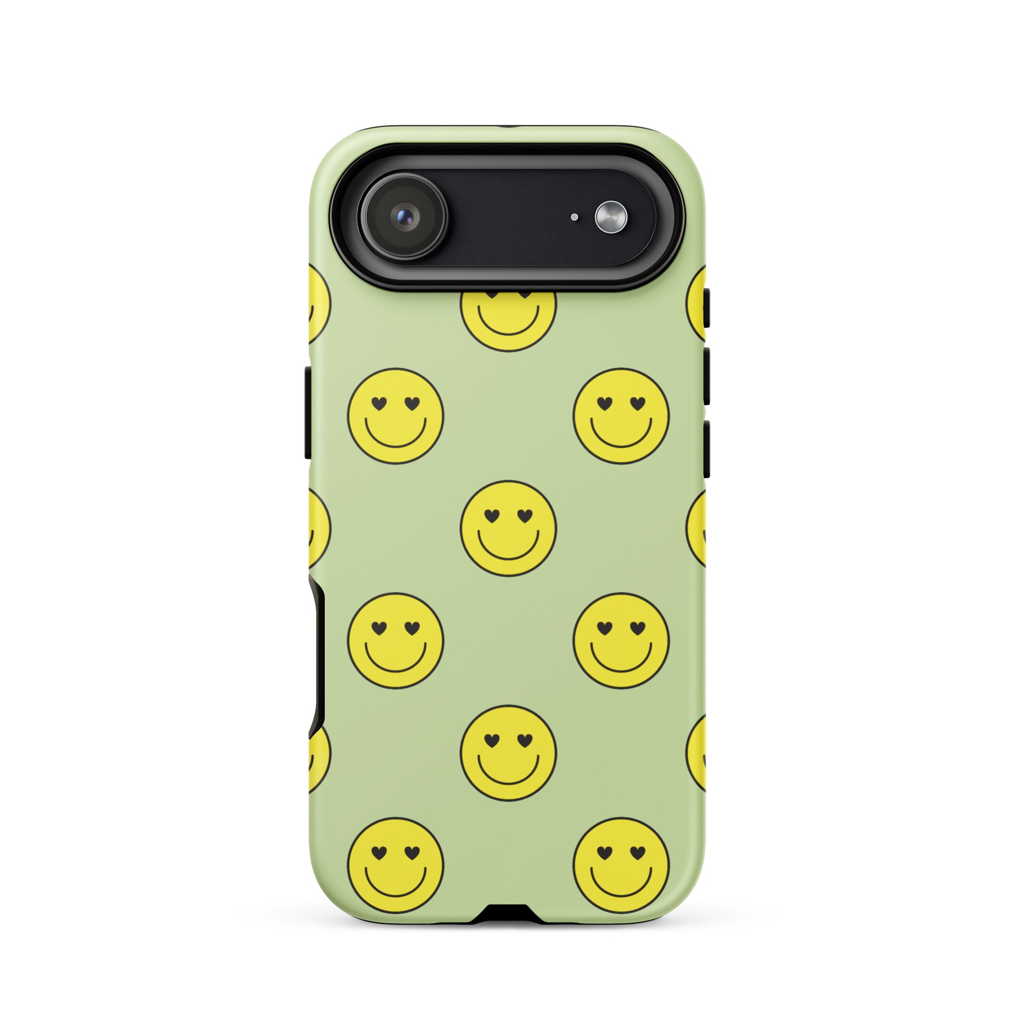 Get grinnin' with our Neon Smiley Faces iPhone Case! This preppy case features neon yellow heart-eyed smiley faces on a lime green background.