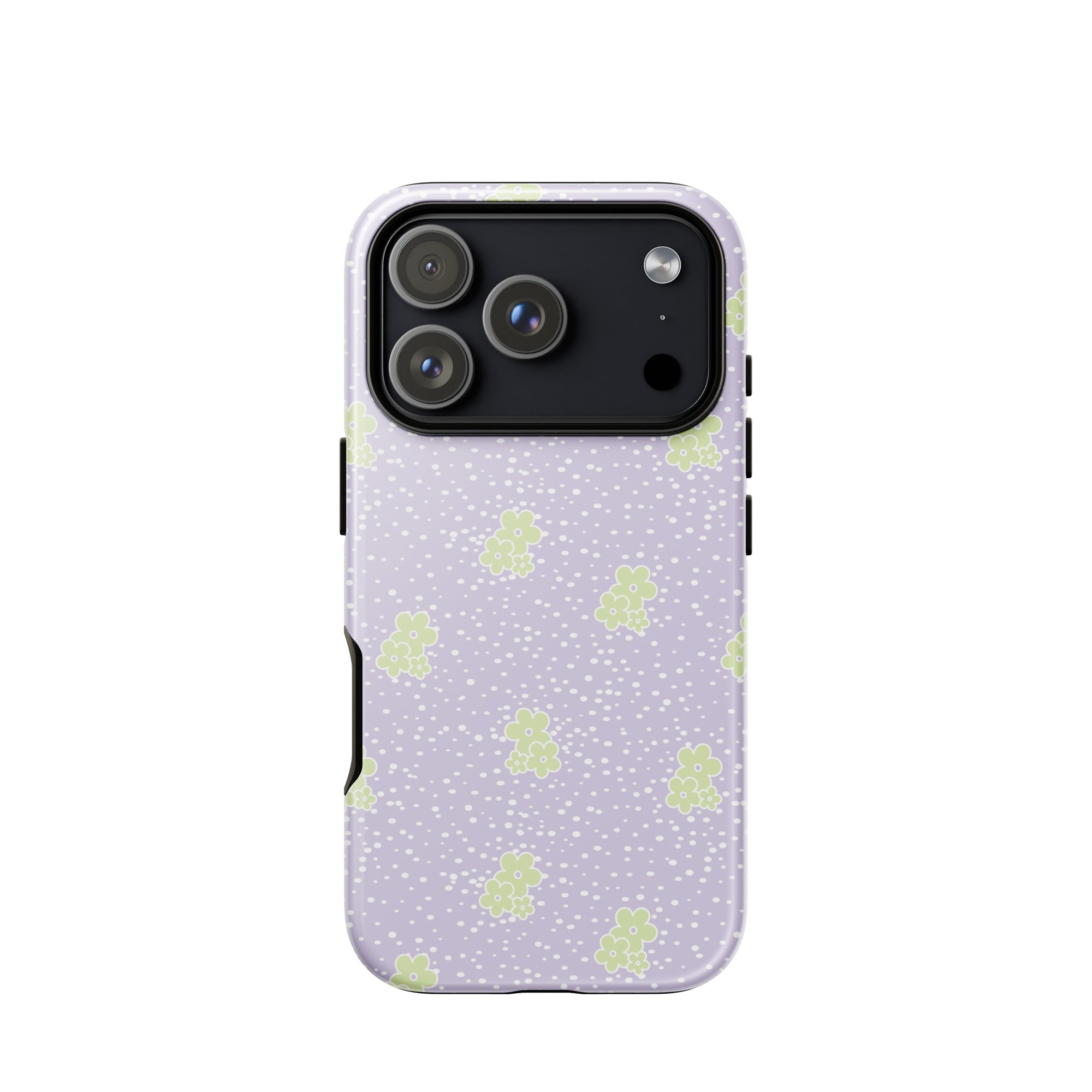 Take a trip down nostalgia lane with this cute case! This case features light green flowers on a pastel purple background featuring white dots.