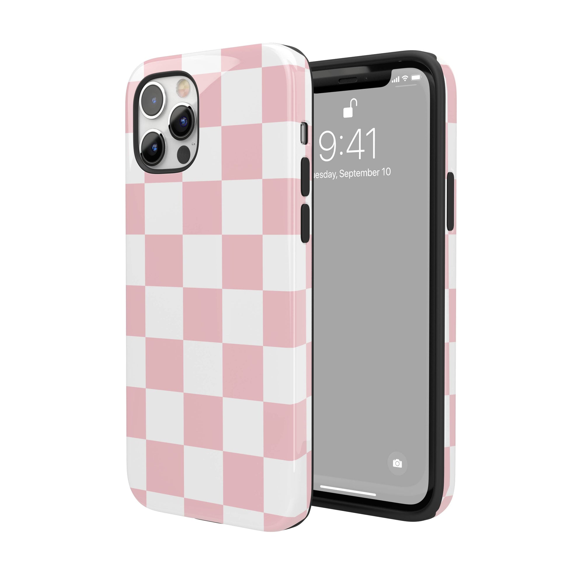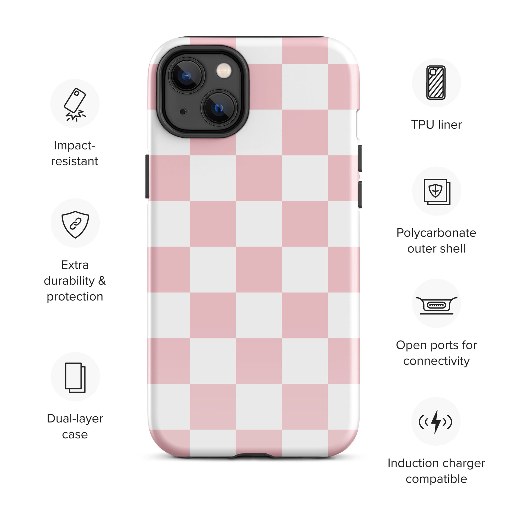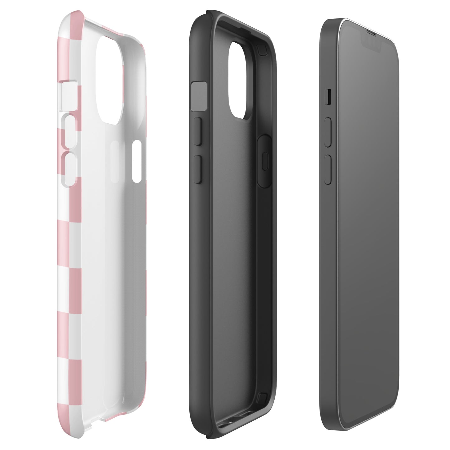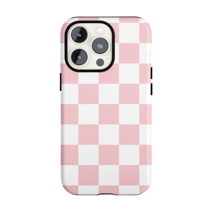 Introducing our Pastel Pink Checkered iPhone Case - the two-piece beauty designed to guard your phone like the queen she is. This cute case features a light pink and white checkered design.