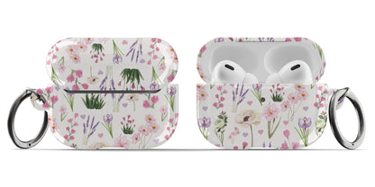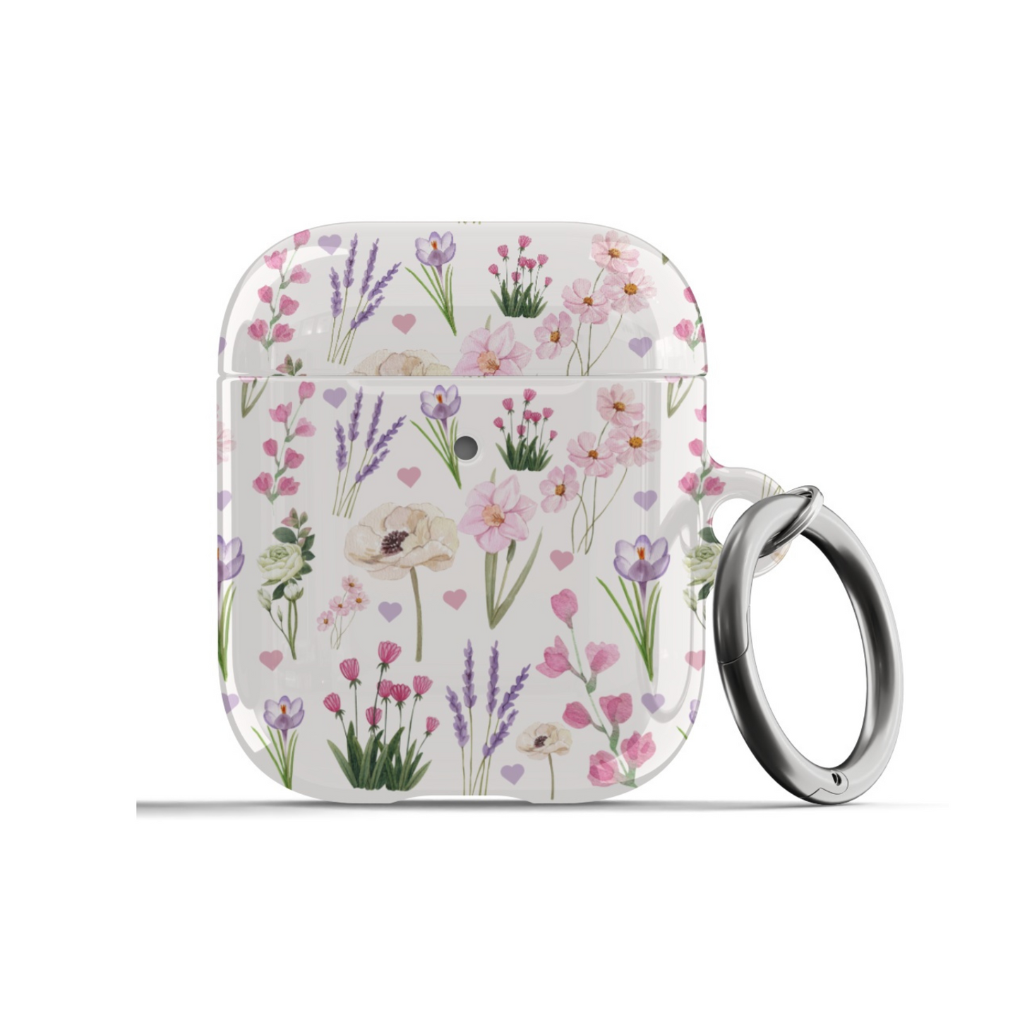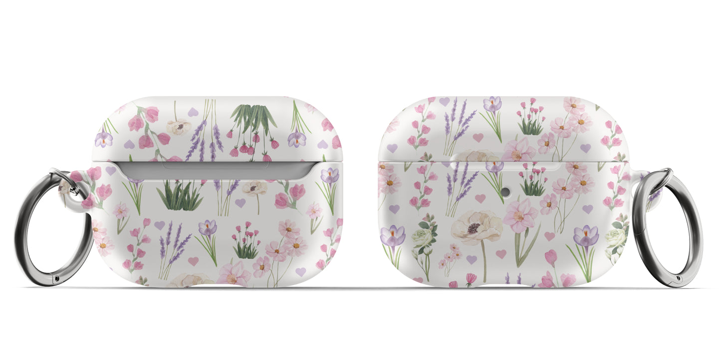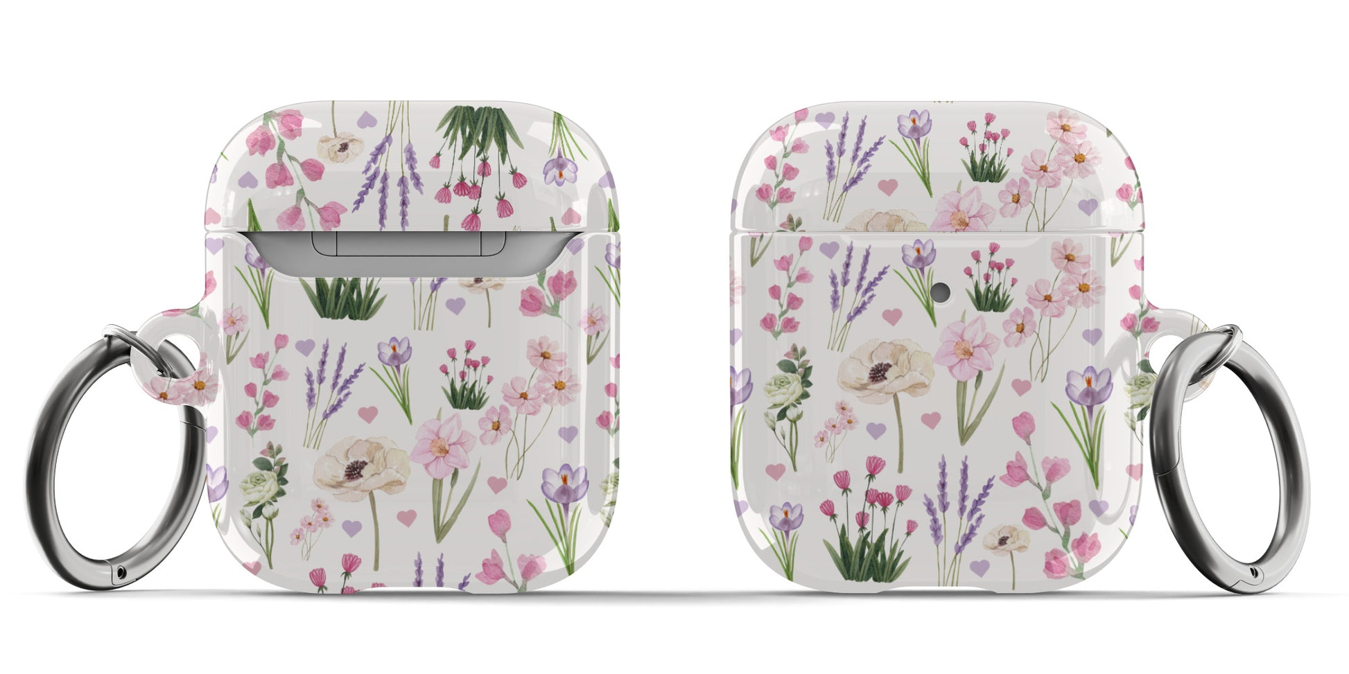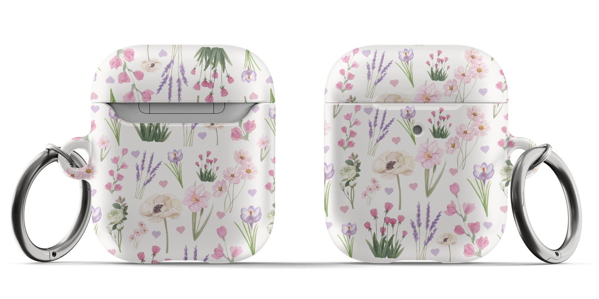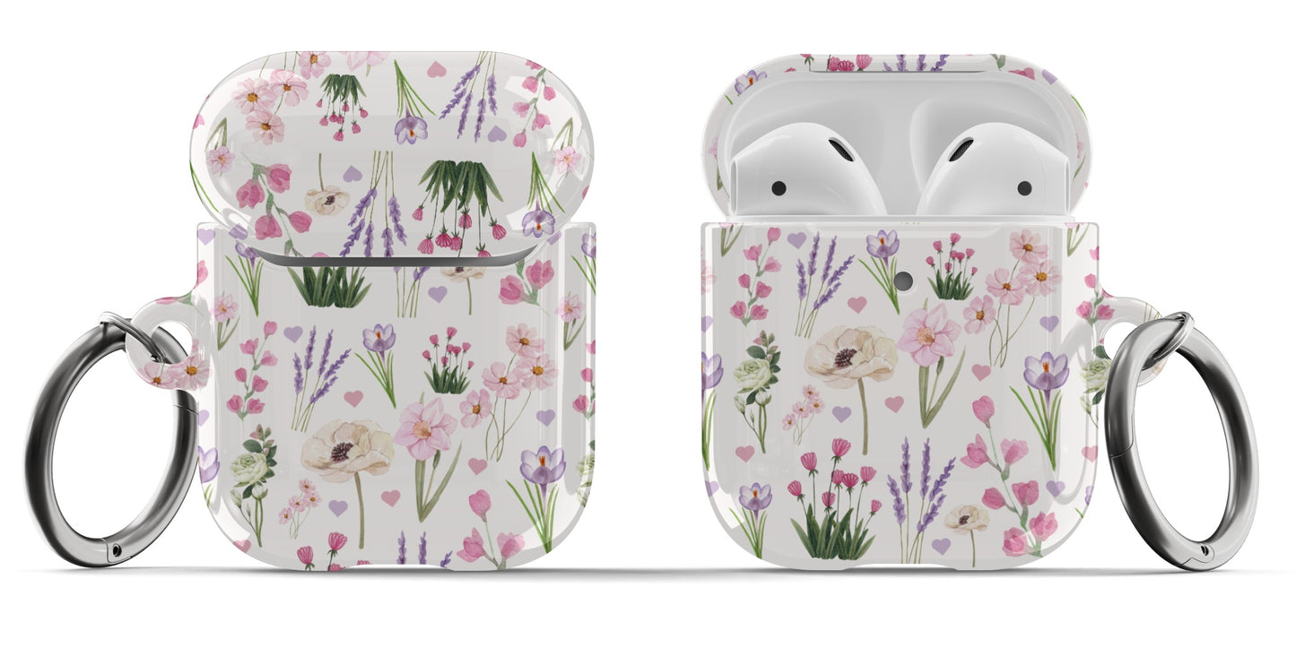 Protect your AirPods with our Purple Garden AirPods Case! This cute AirPods case features purple, pink, and white flowers and hearts on a light beige background.