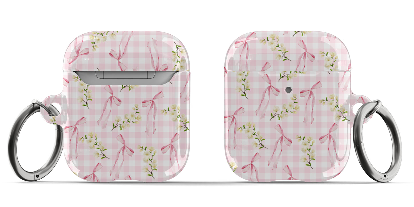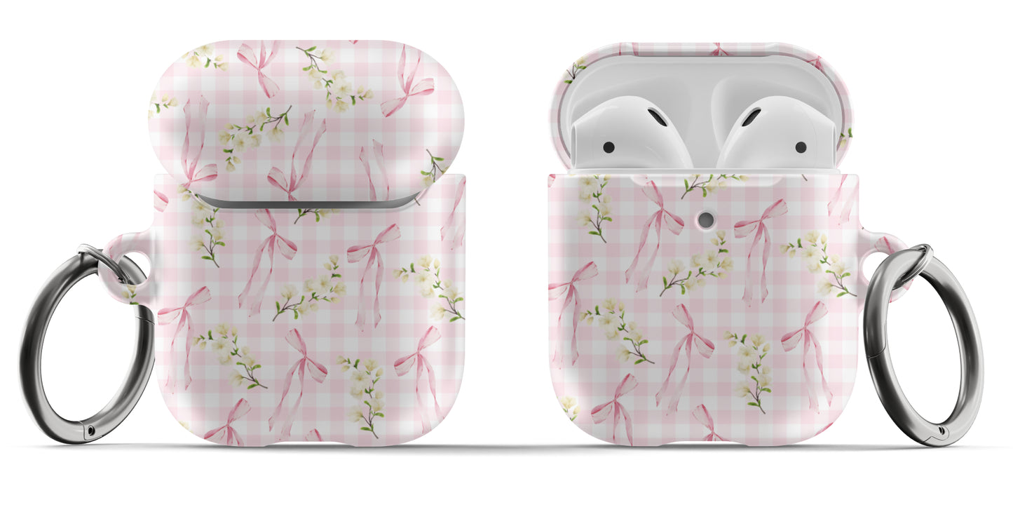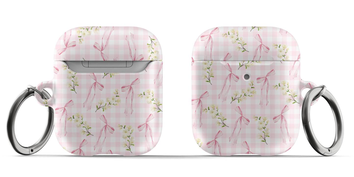 Protect your AirPods with our Ribbon Bows Floral AirPods Case! This cute AirPods case features pink bows and light yellow flowers on a light pink gingham pattern.