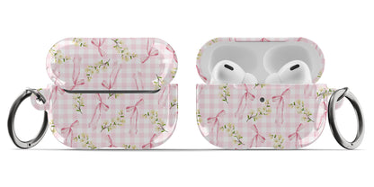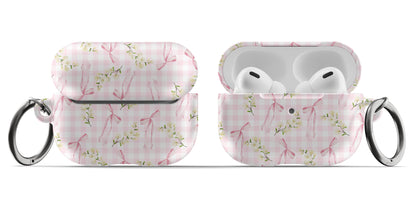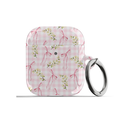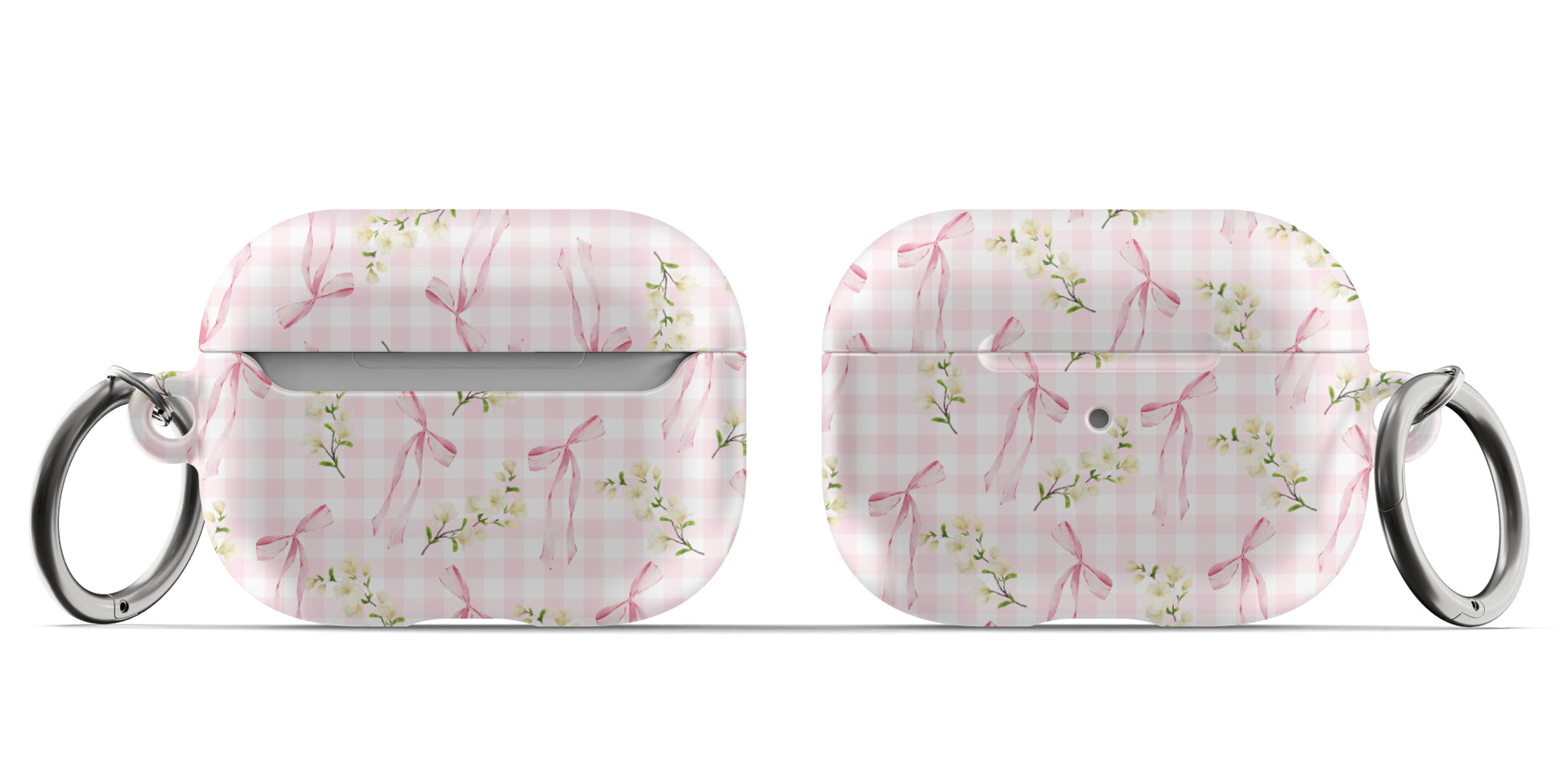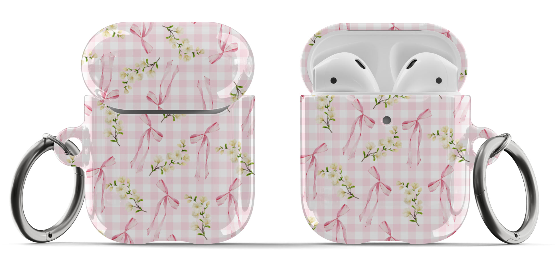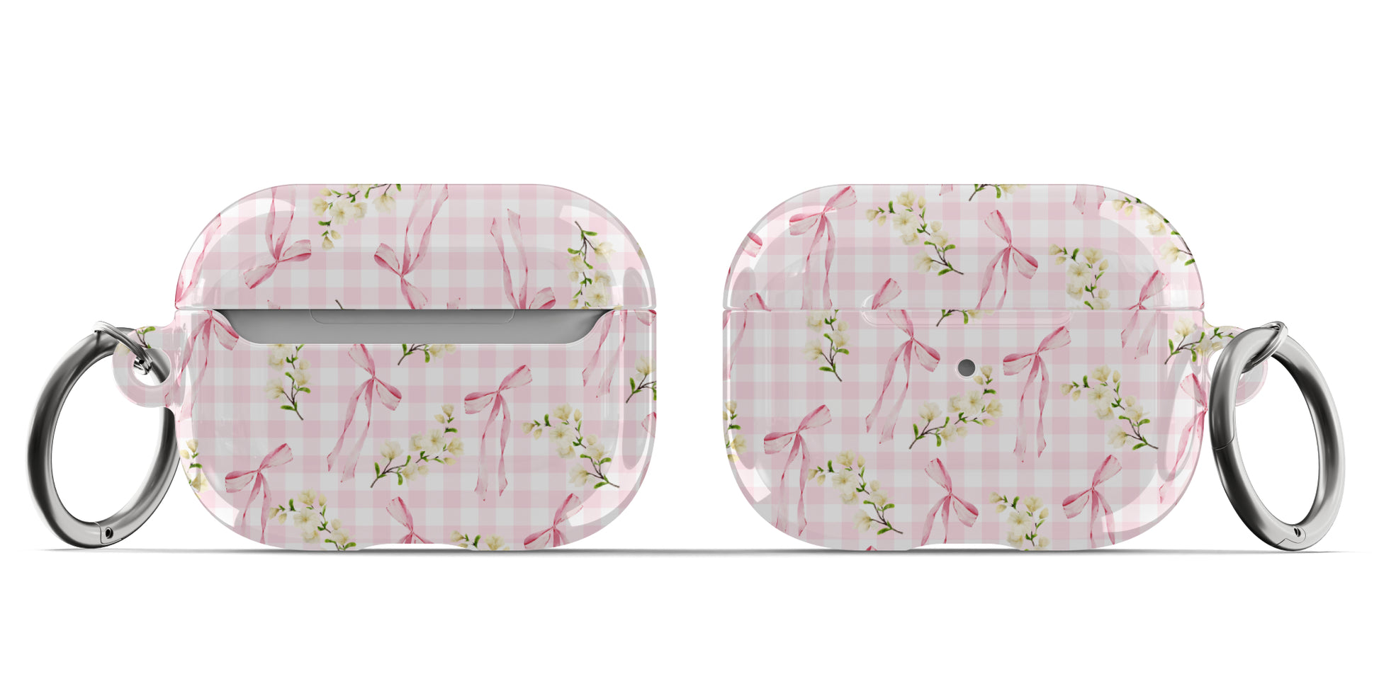 Protect your AirPods with our Ribbon Bows Floral AirPods Case! This cute AirPods case features pink bows and light yellow flowers on a light pink gingham pattern.