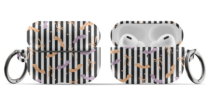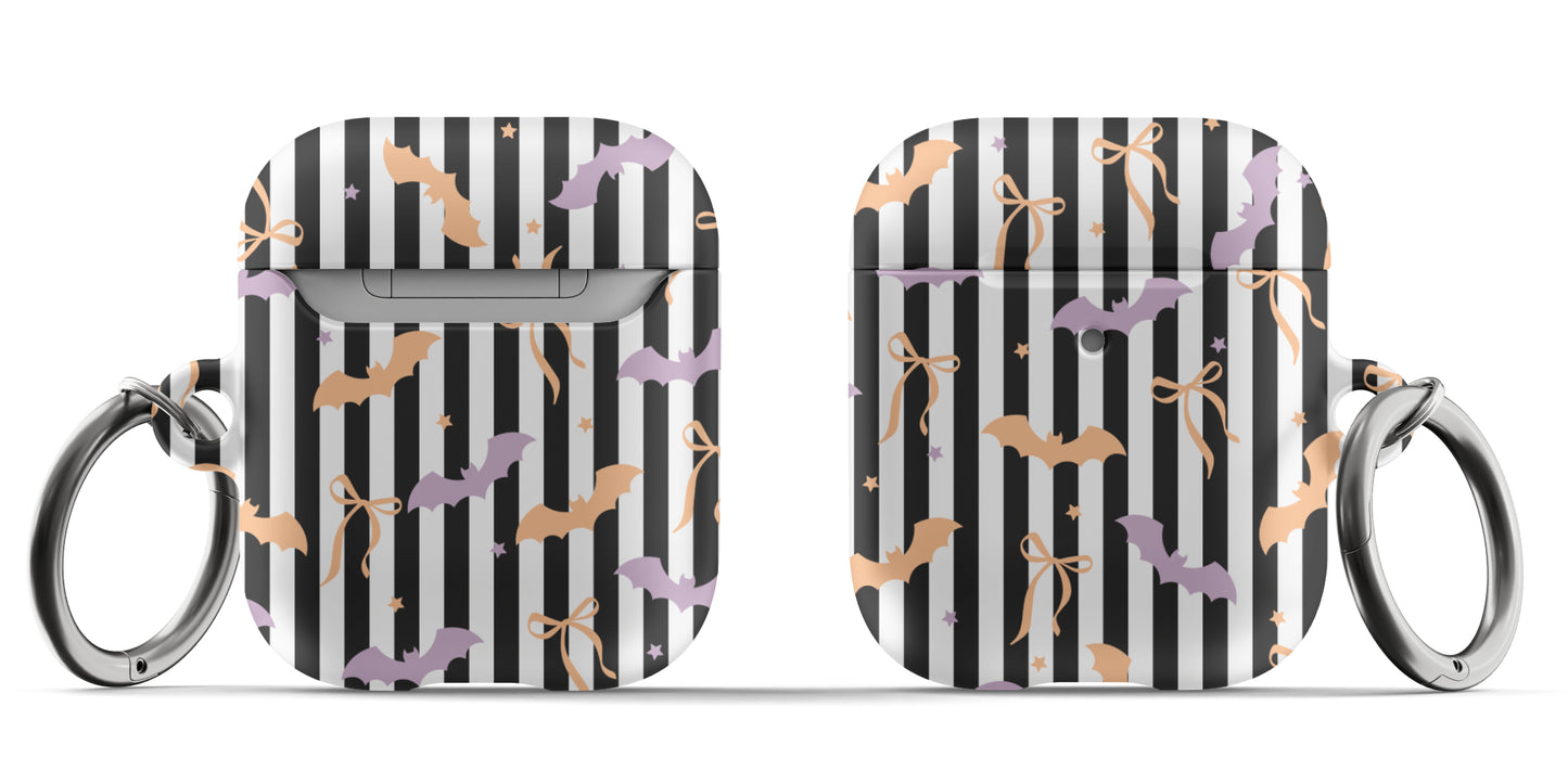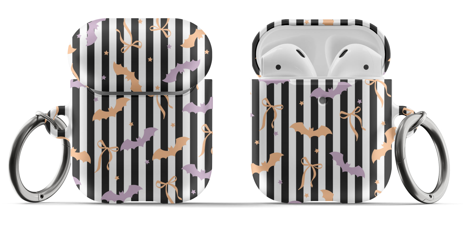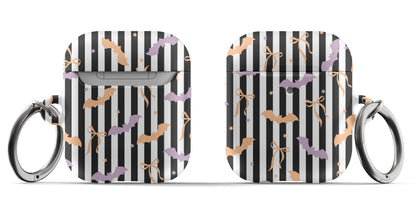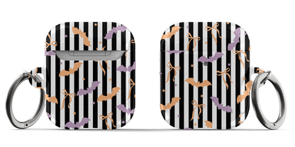 Protect your AirPods with our Spooky Stripes AirPods Case! This cute AirPods case features orange and purple bats & stars, and orange ribbon bows on a striped black and white background.
