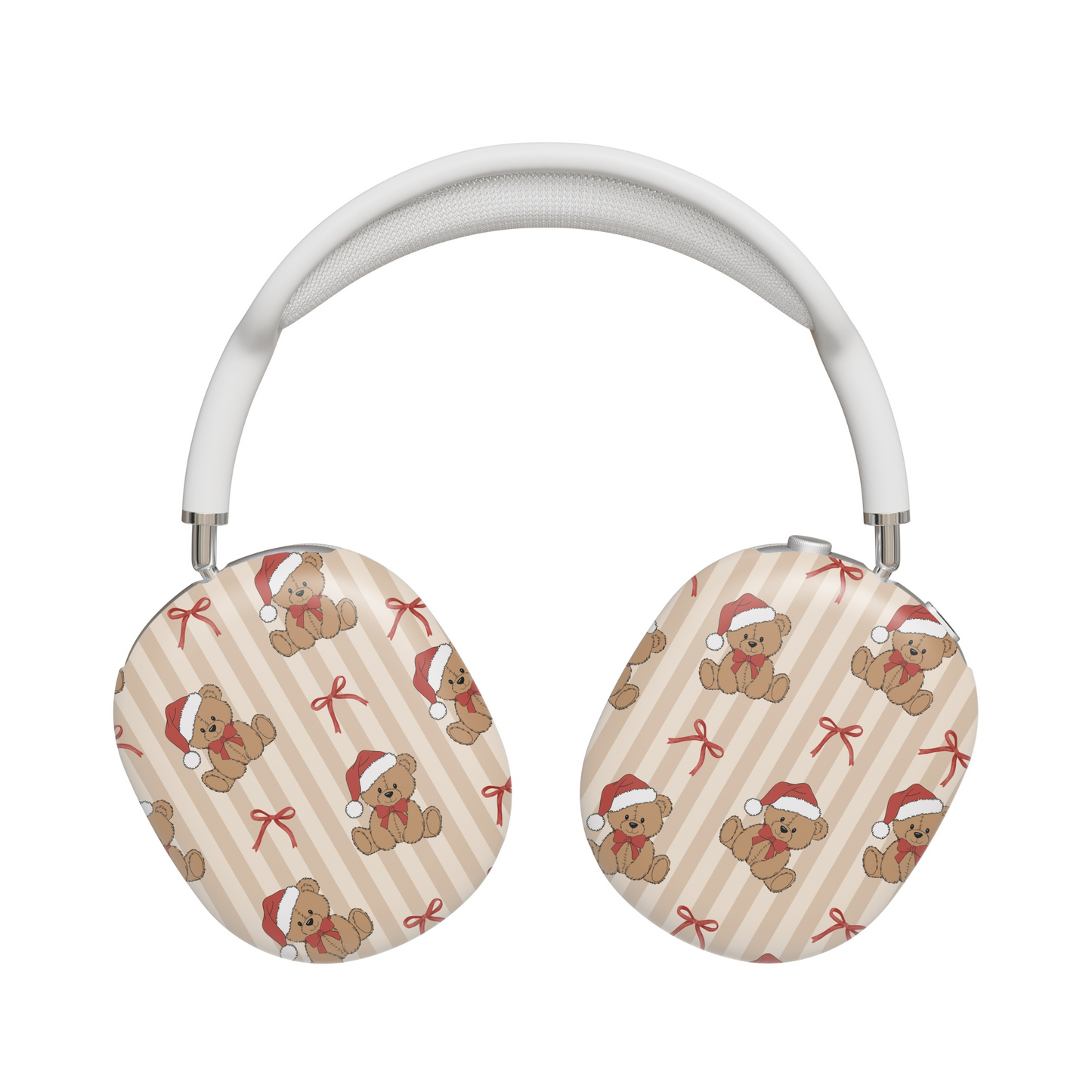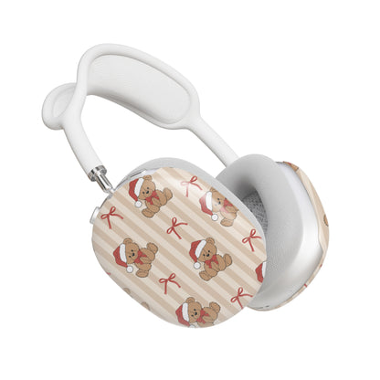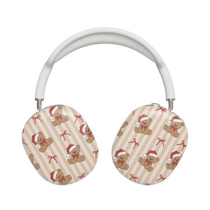 Protect your AirPods with our Teddy's Holiday AirPods Max Case! This cute AirPods case features teddy bears with christmas hats and red bows on a brown striped background.